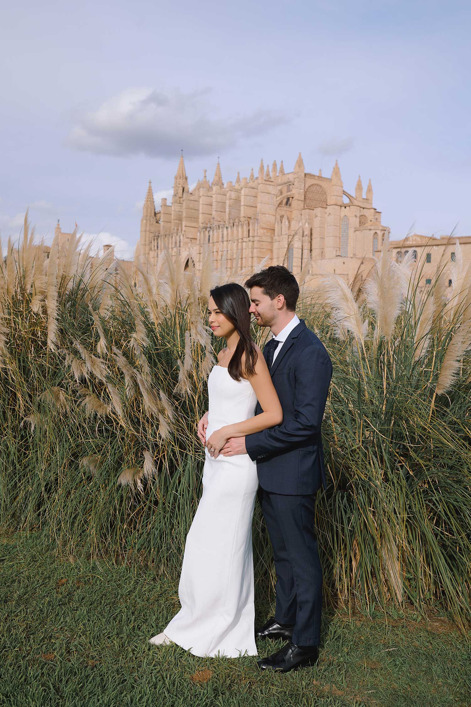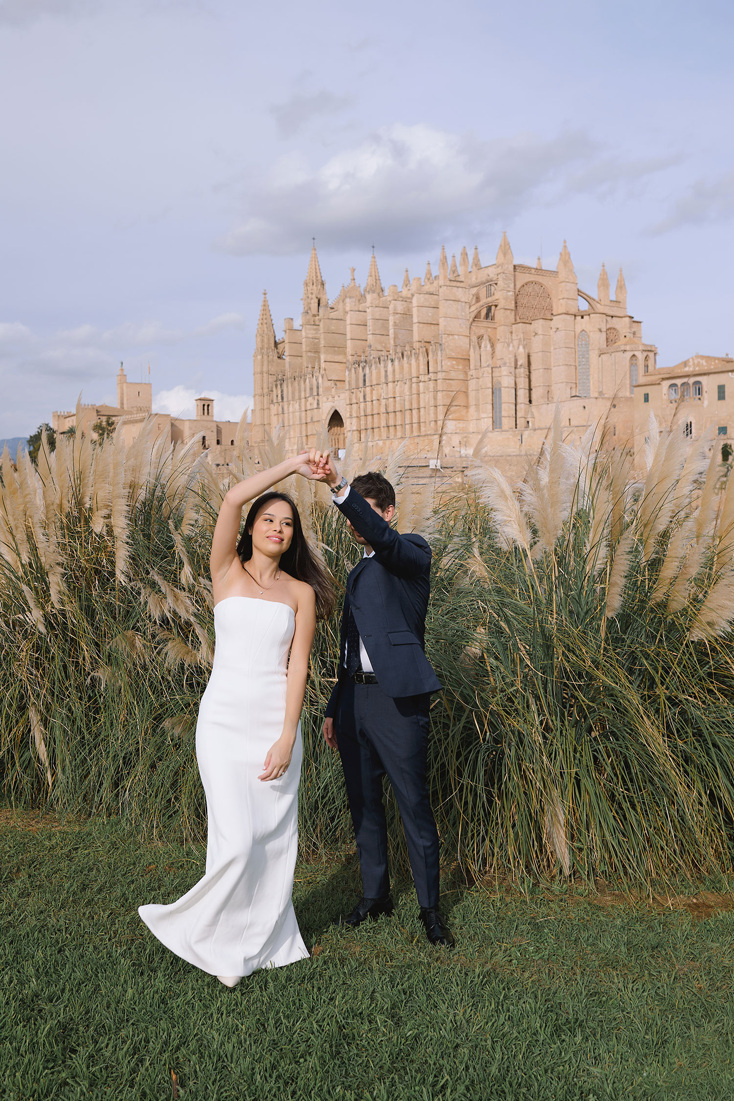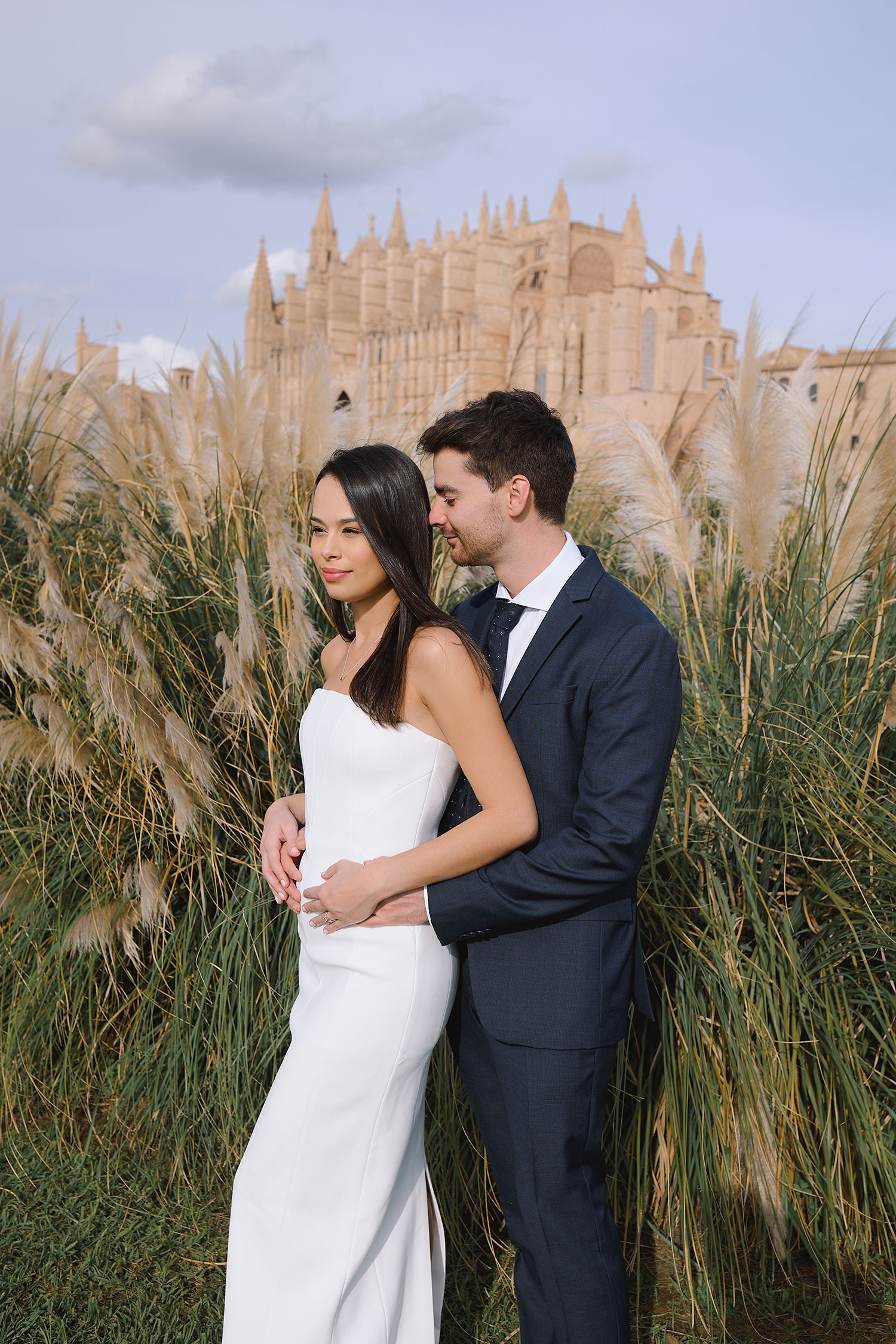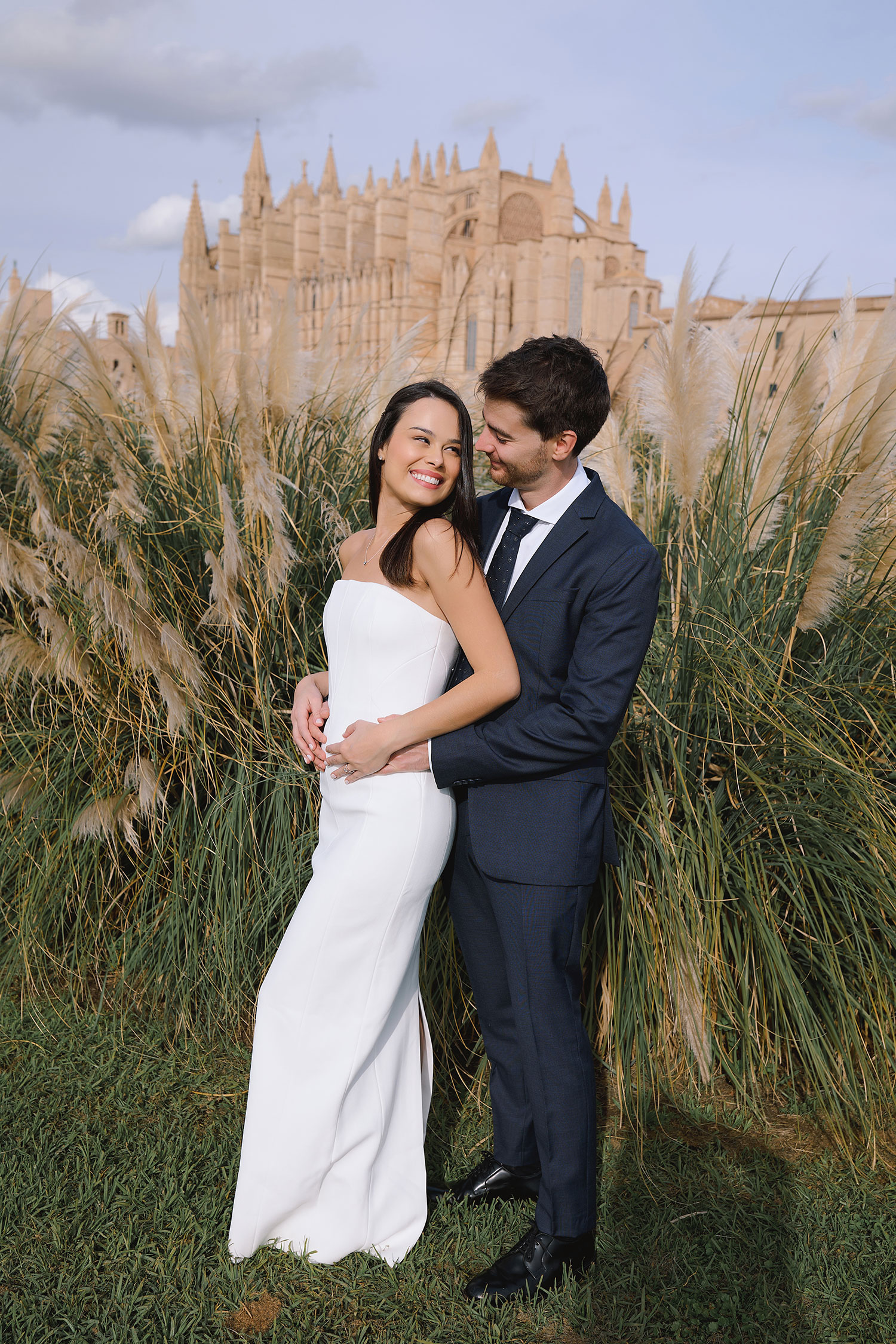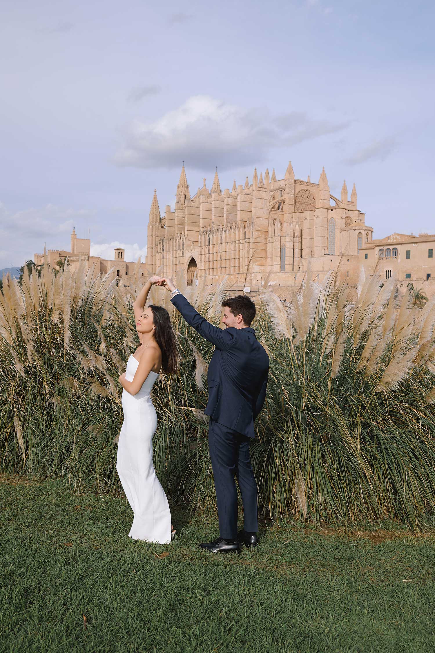 Sesión preboda de Juan y Nathali en la icónica Catedral de Mallorca, envueltos en luz dorada, elegante arquitectura y una tranquila emoción por el día que está por venir.