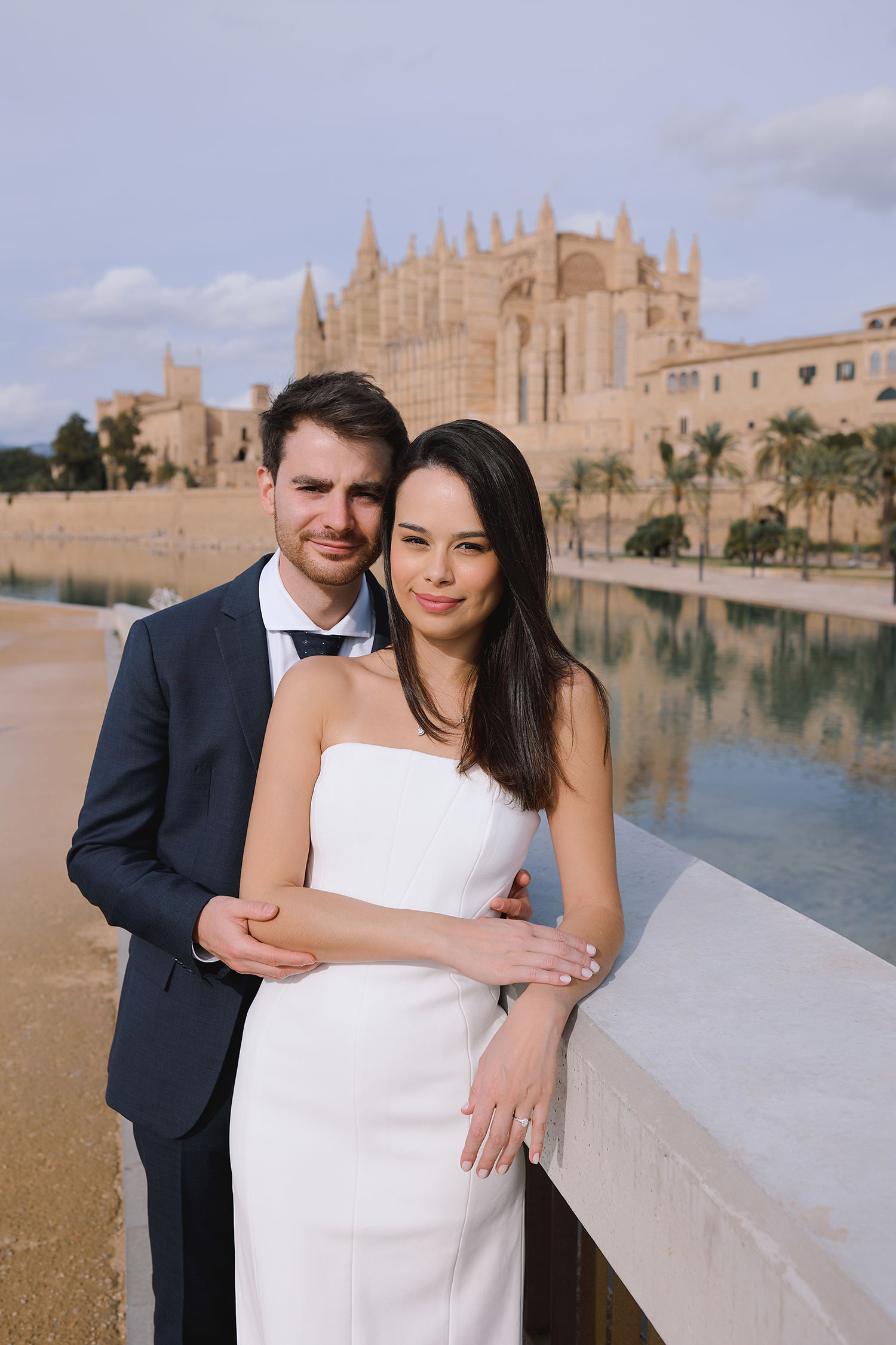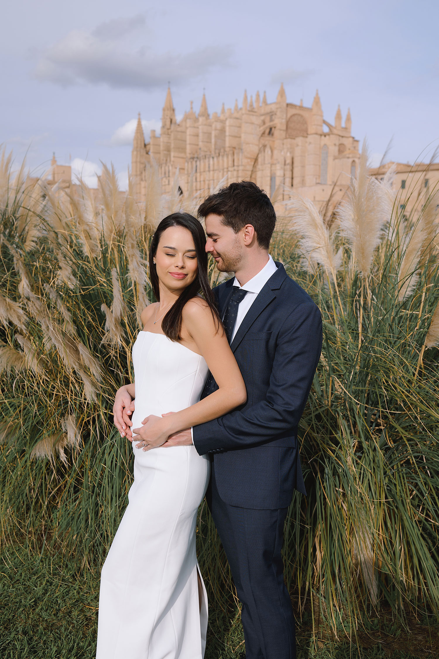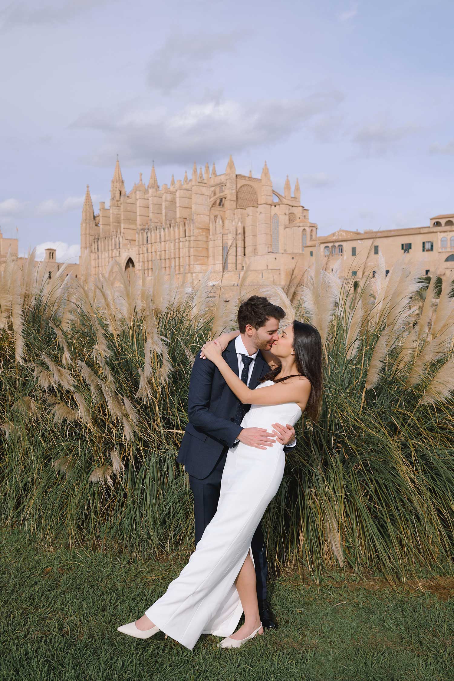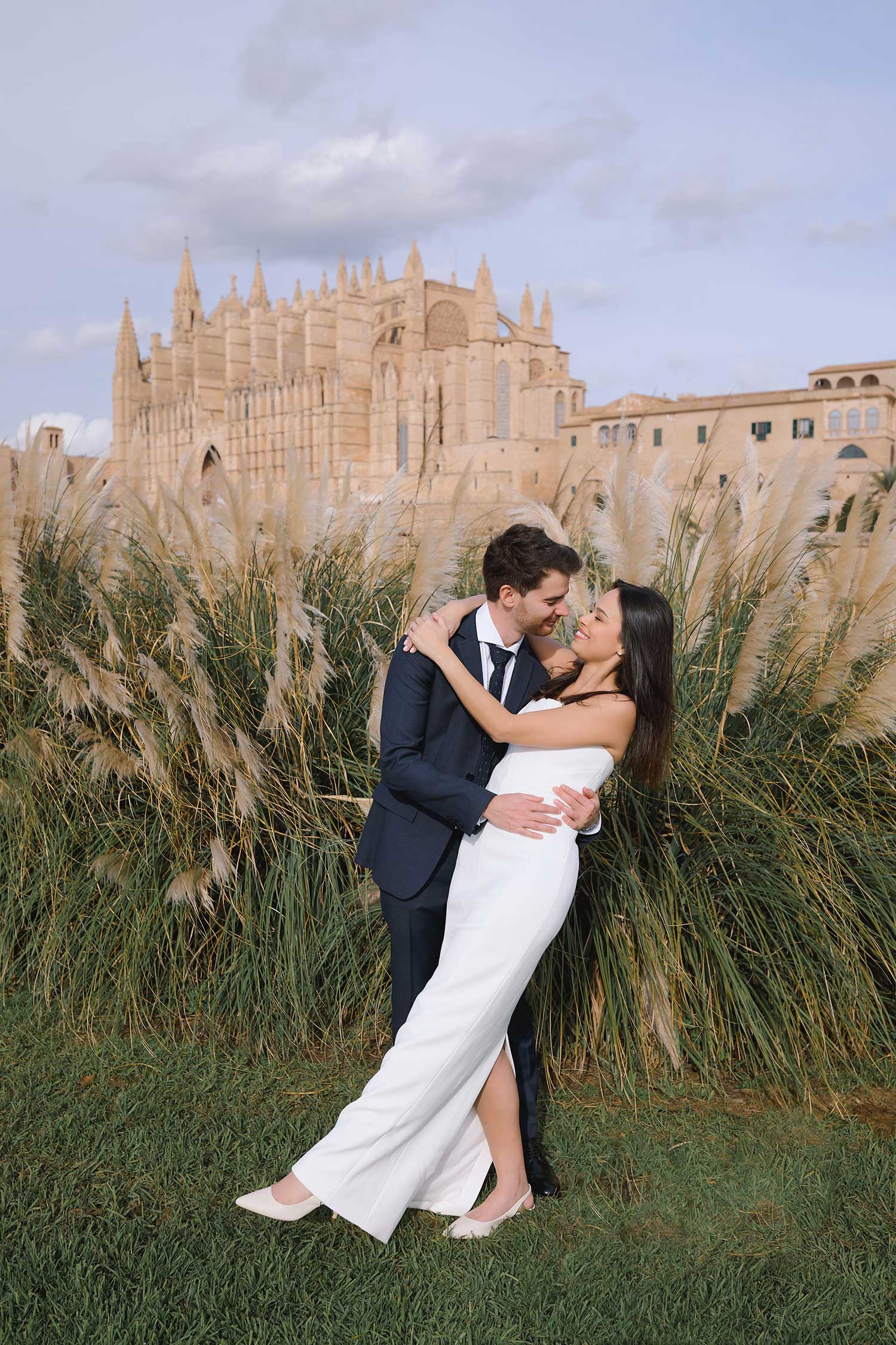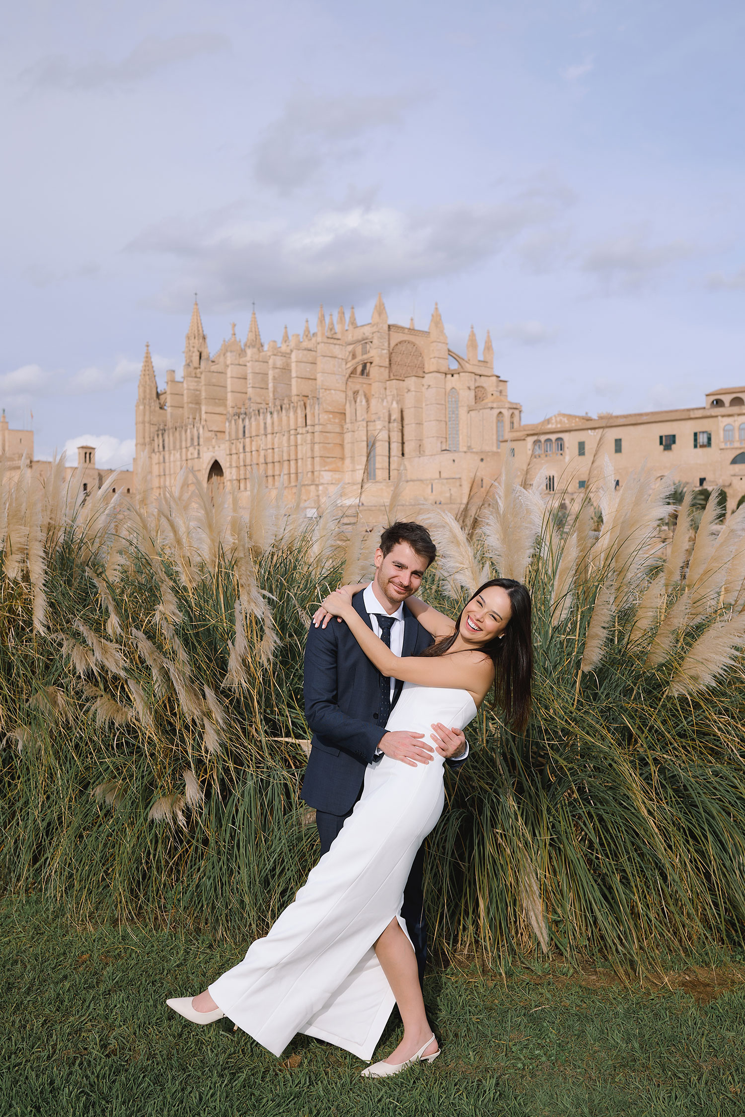 Sesión preboda de Juan y Nathali en la icónica Catedral de Mallorca, envueltos en luz dorada, elegante arquitectura y una tranquila emoción por el día que está por venir.