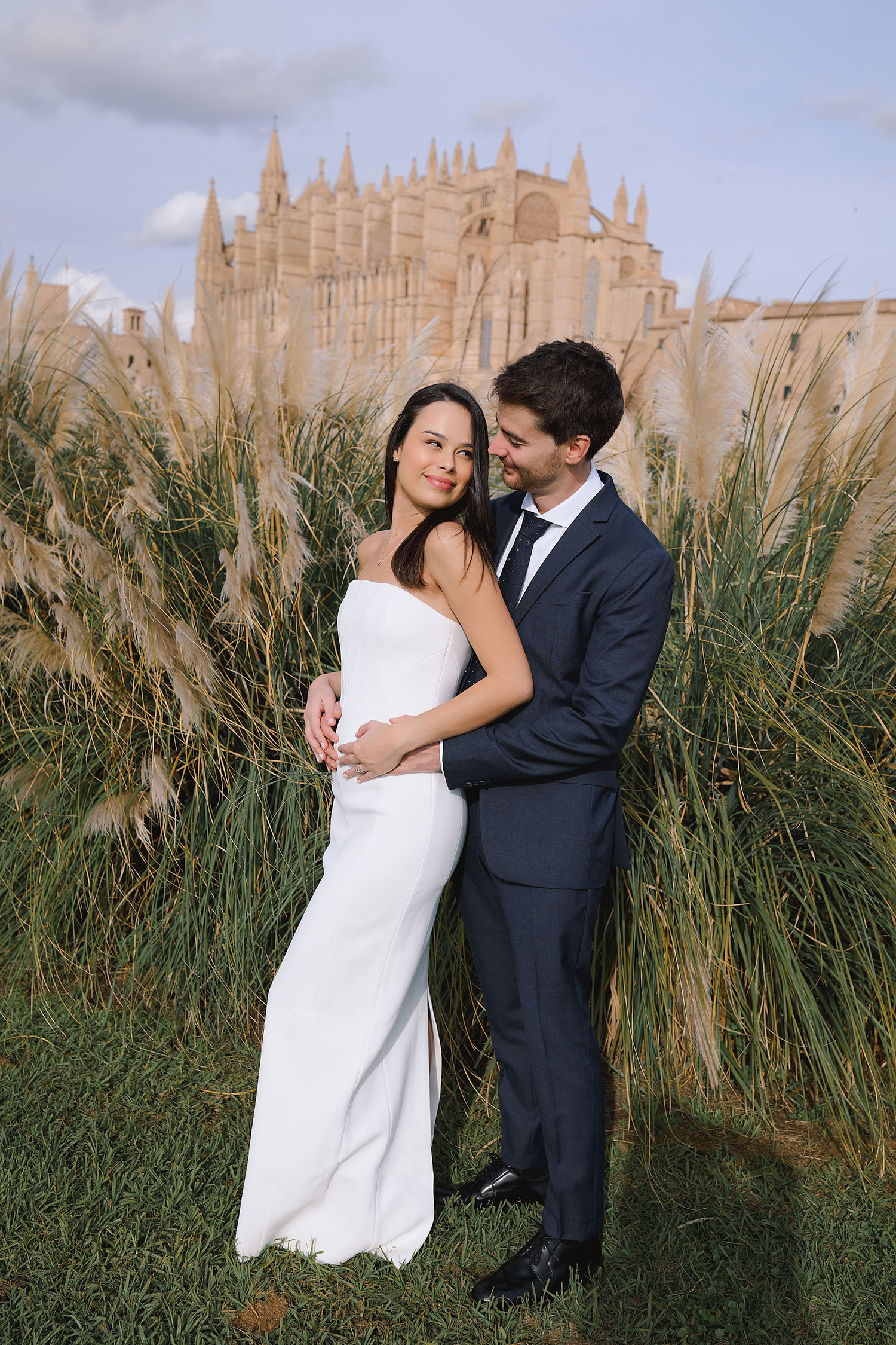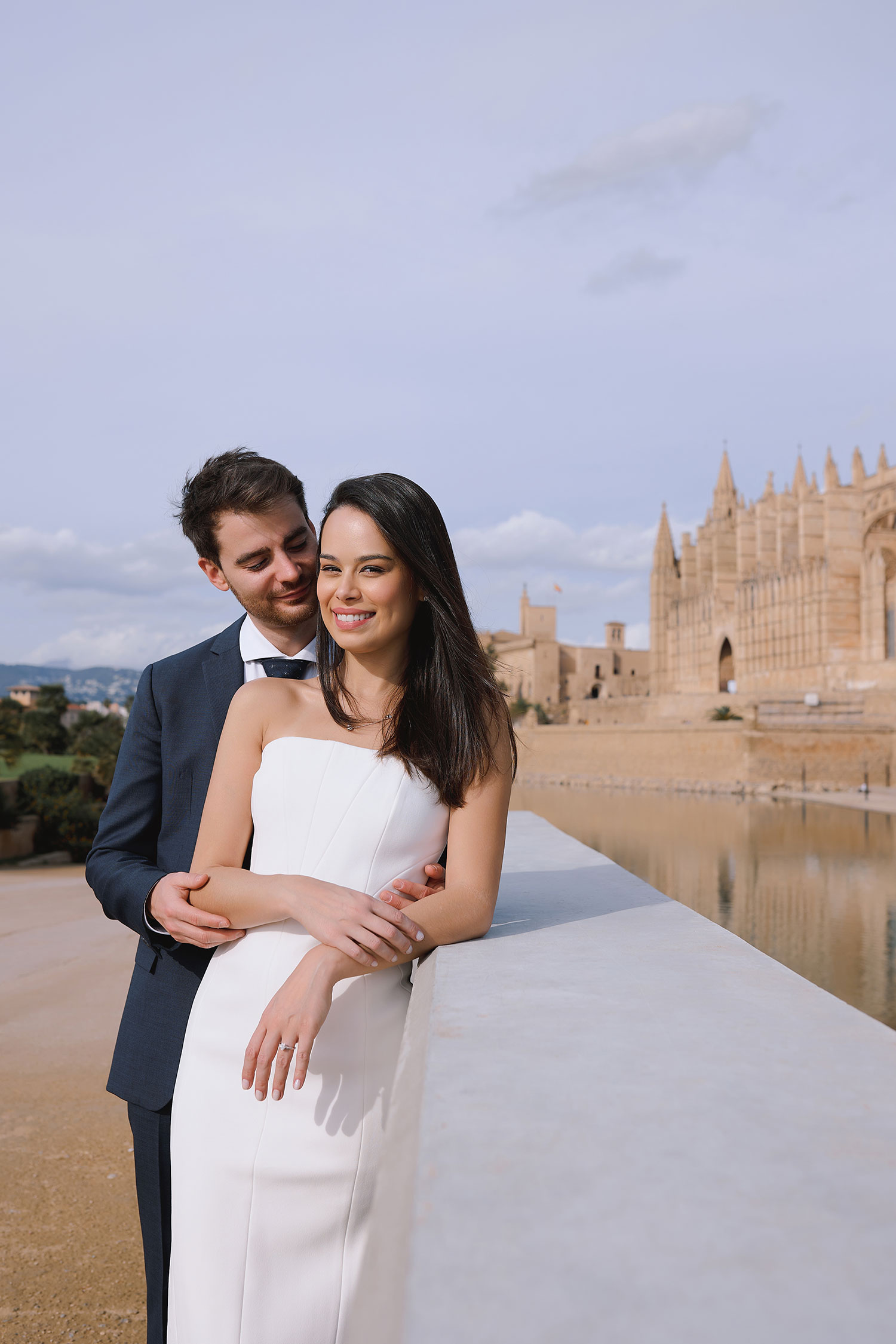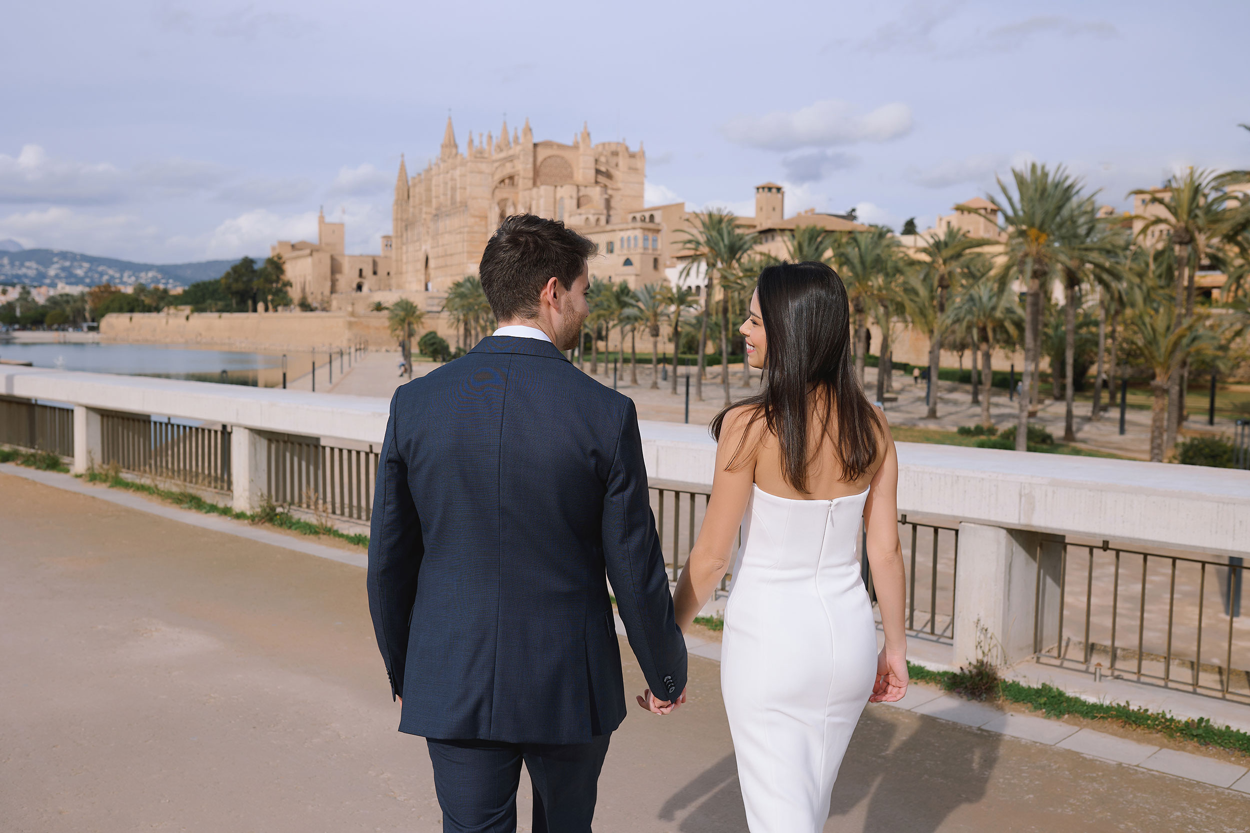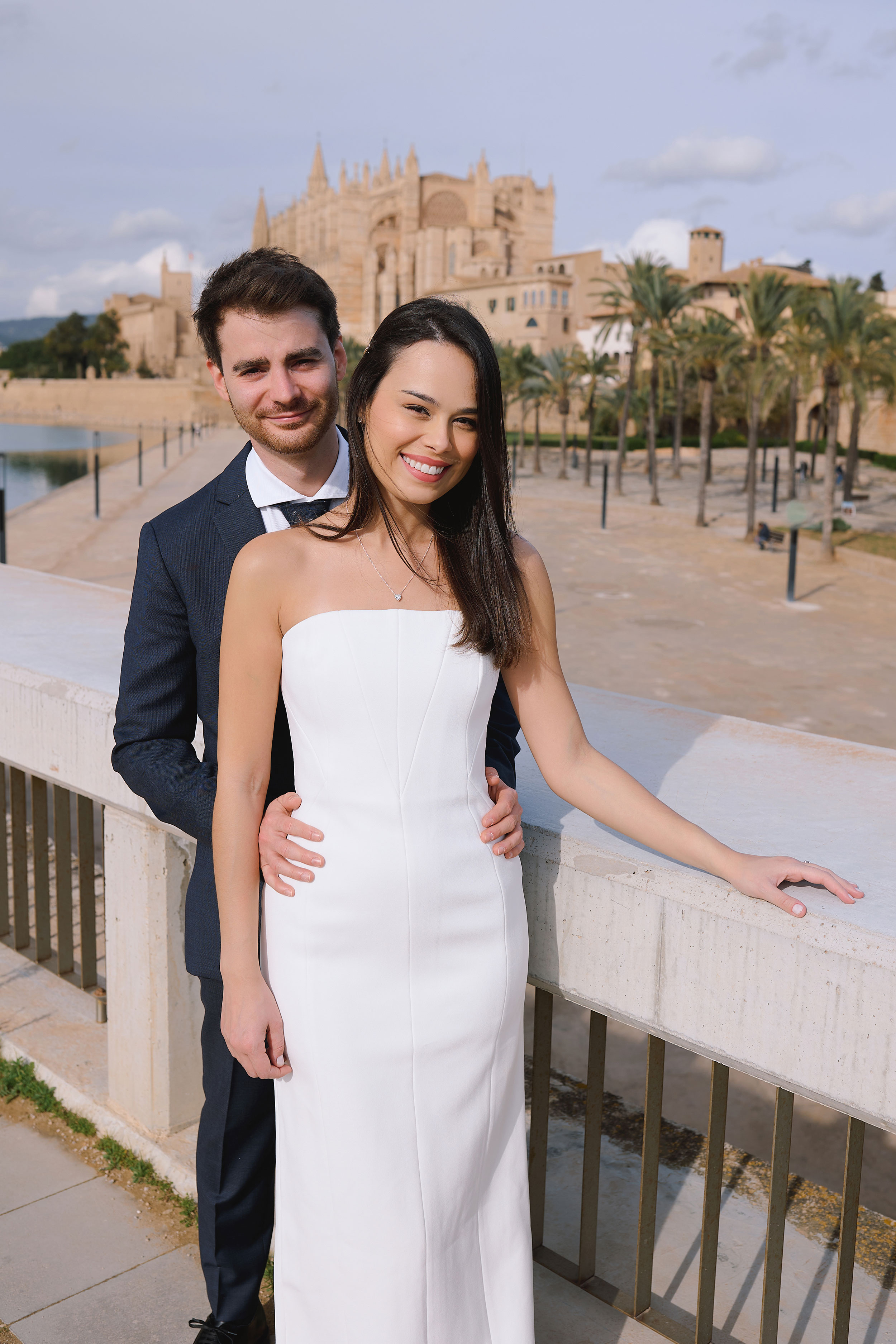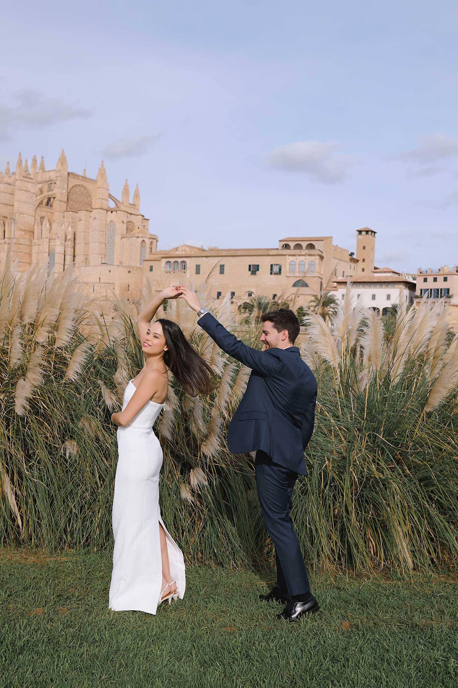 Sesión preboda de Juan y Nathali en la icónica Catedral de Mallorca, envueltos en luz dorada, elegante arquitectura y una tranquila emoción por el día que está por venir.