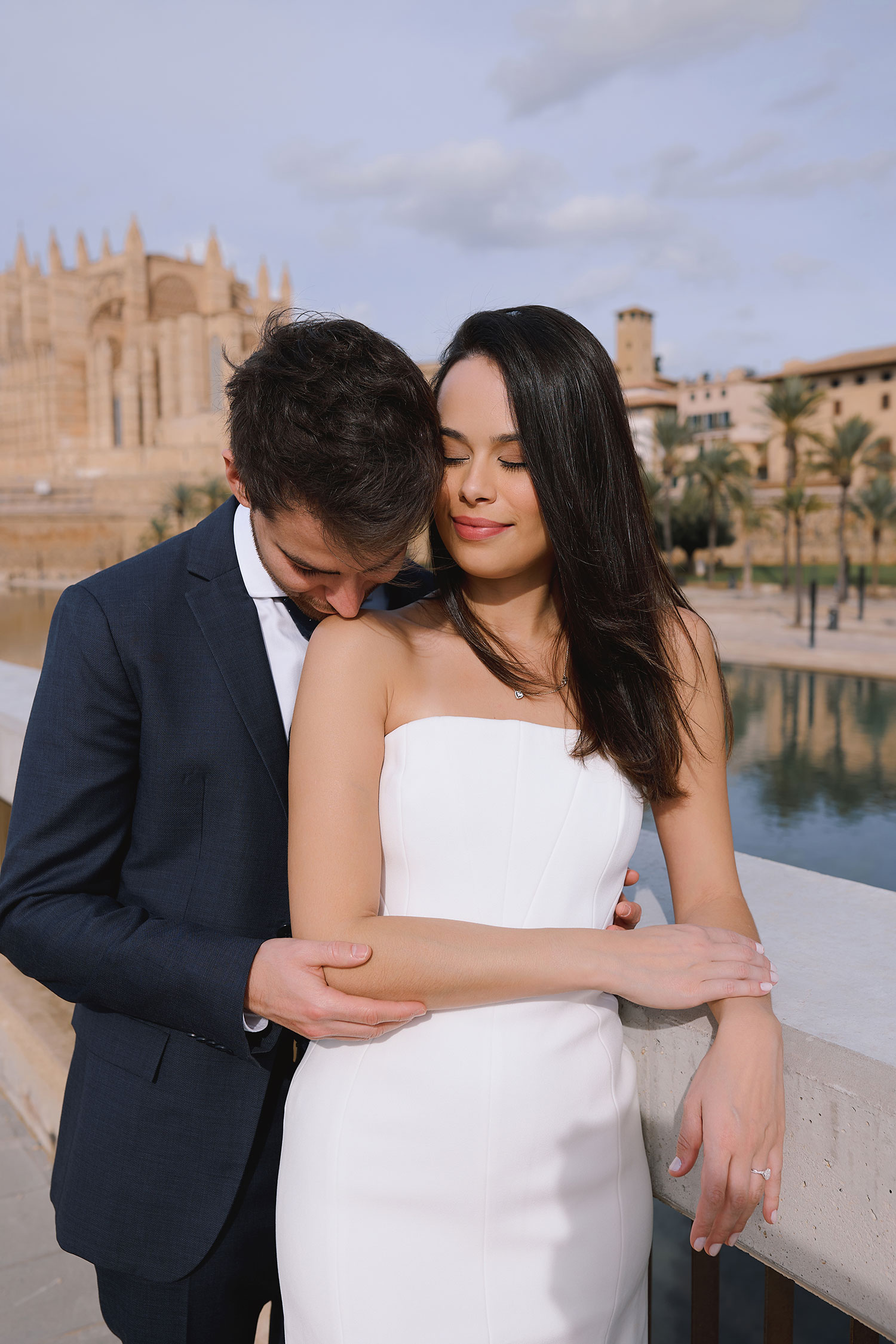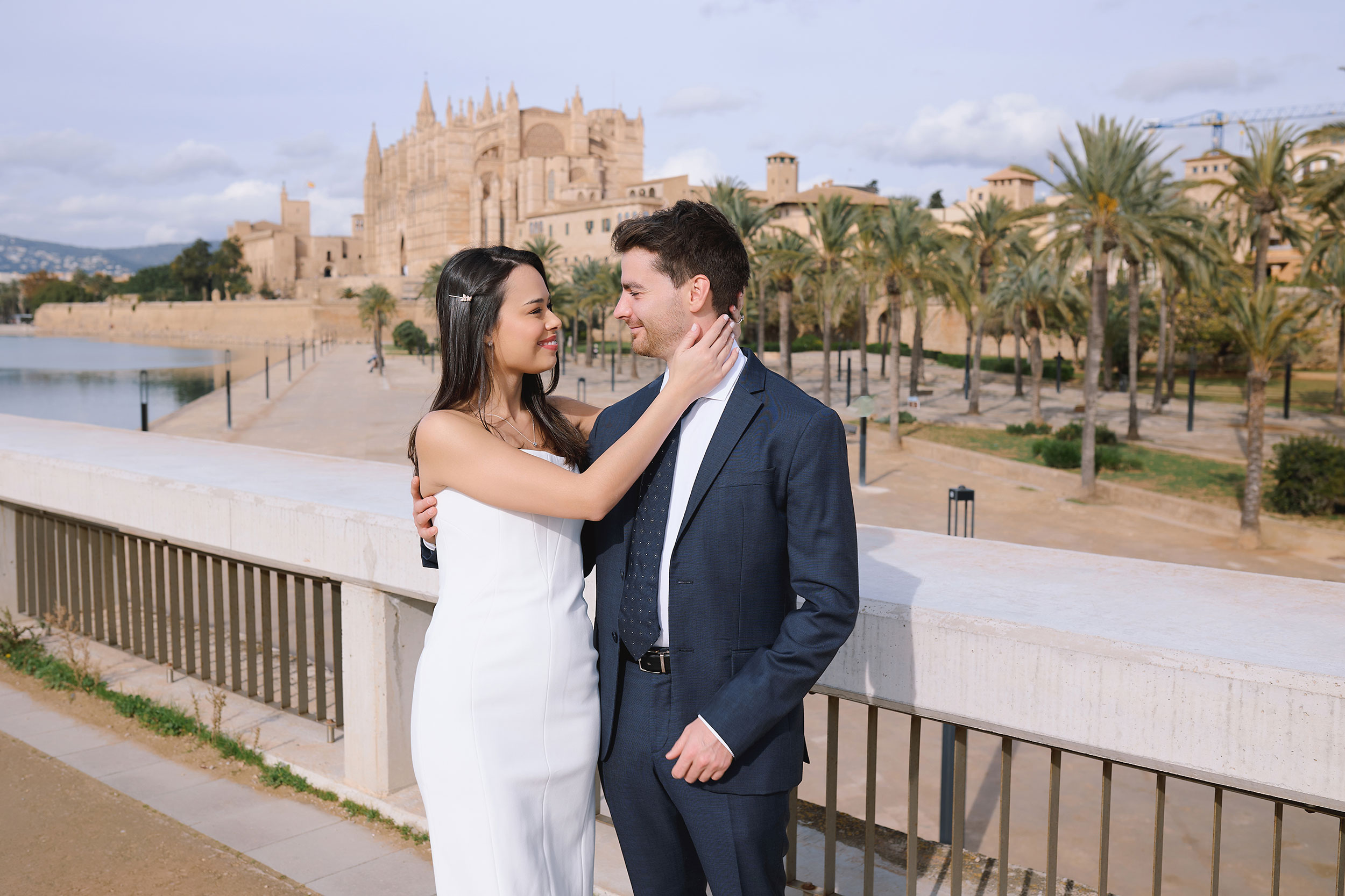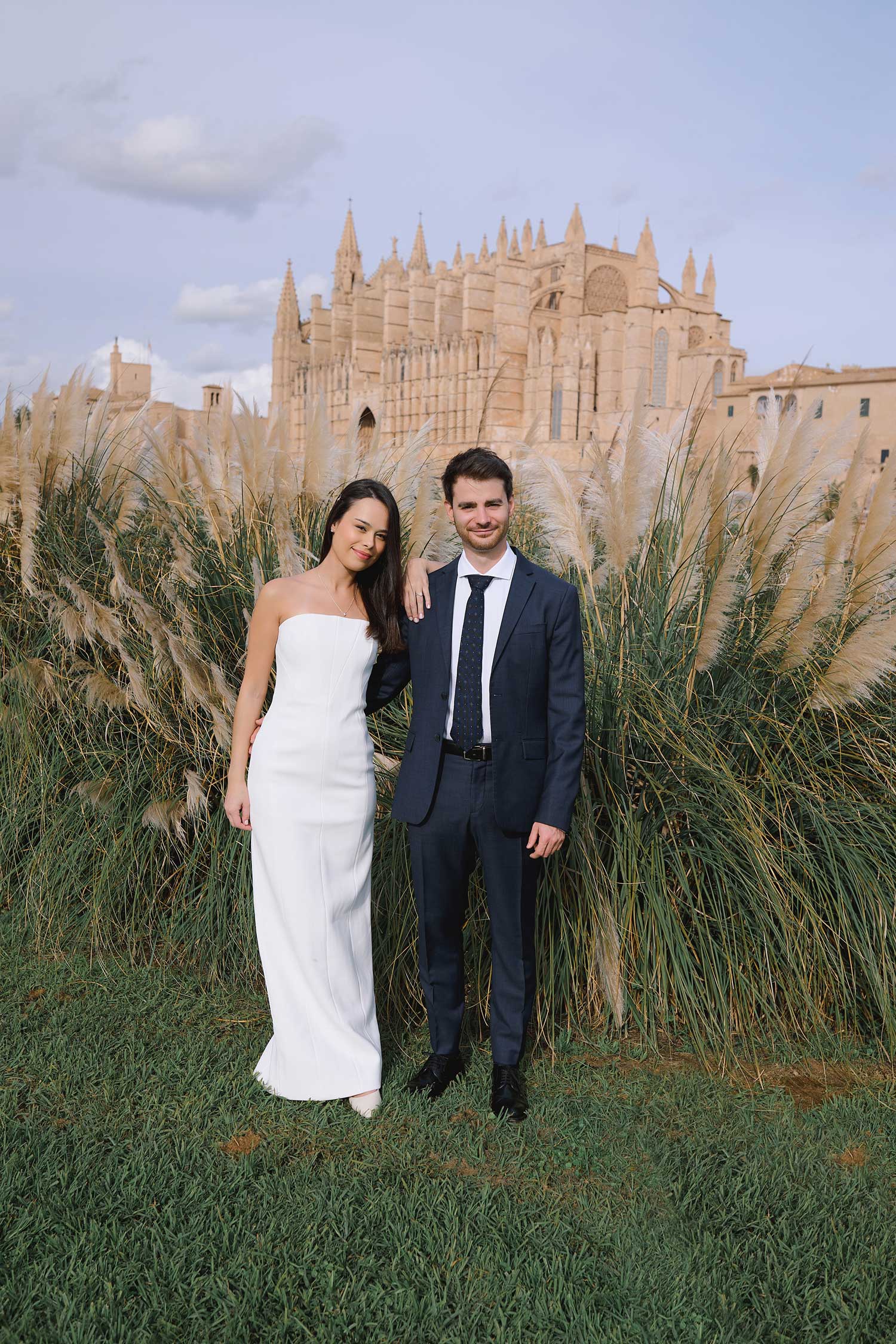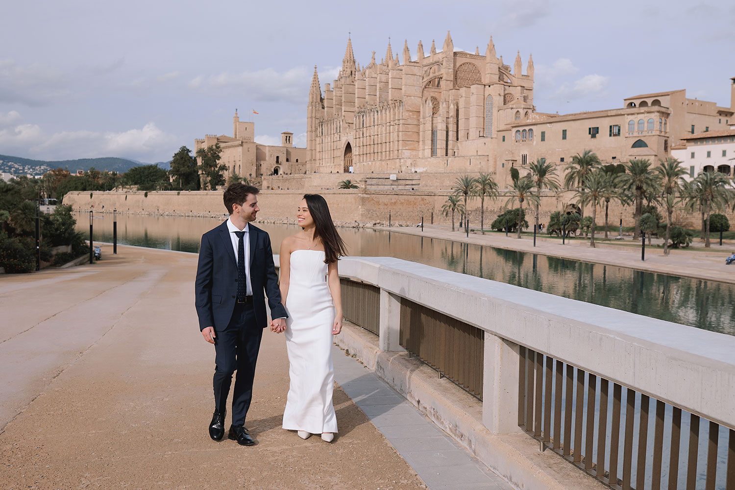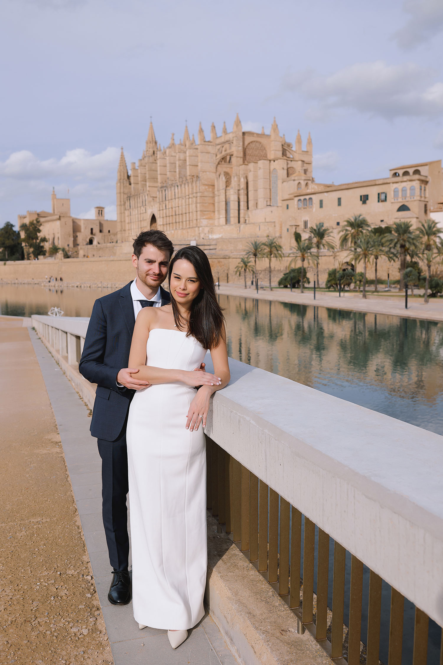 Sesión preboda de Juan y Nathali en la icónica Catedral de Mallorca, envueltos en luz dorada, elegante arquitectura y una tranquila emoción por el día que está por venir.