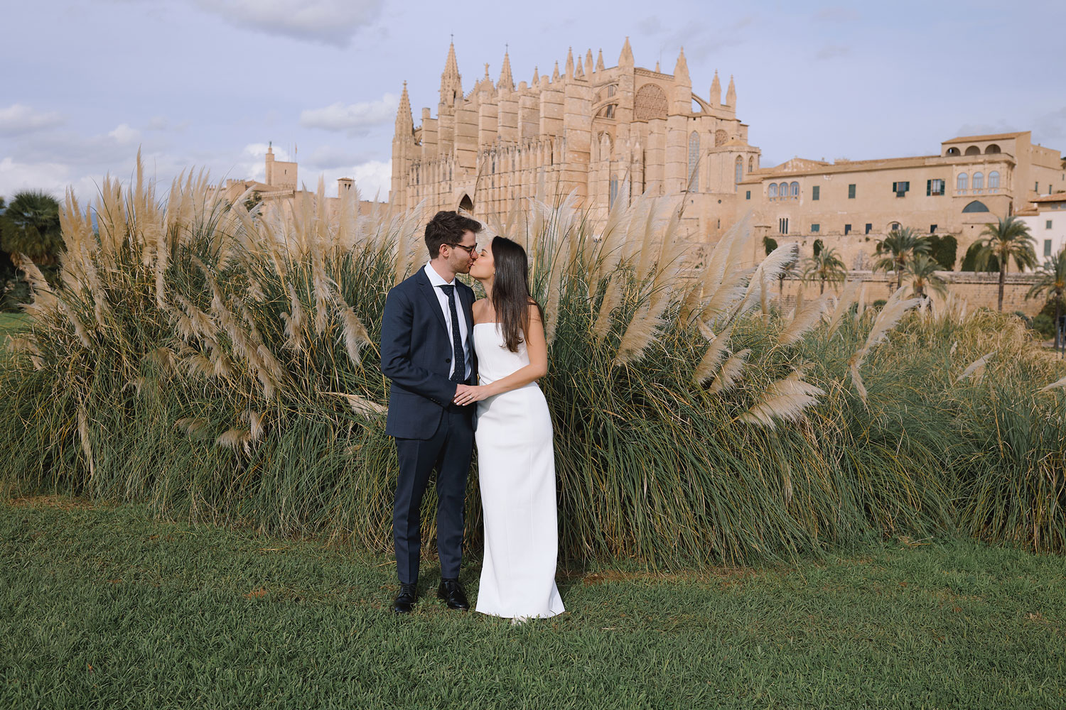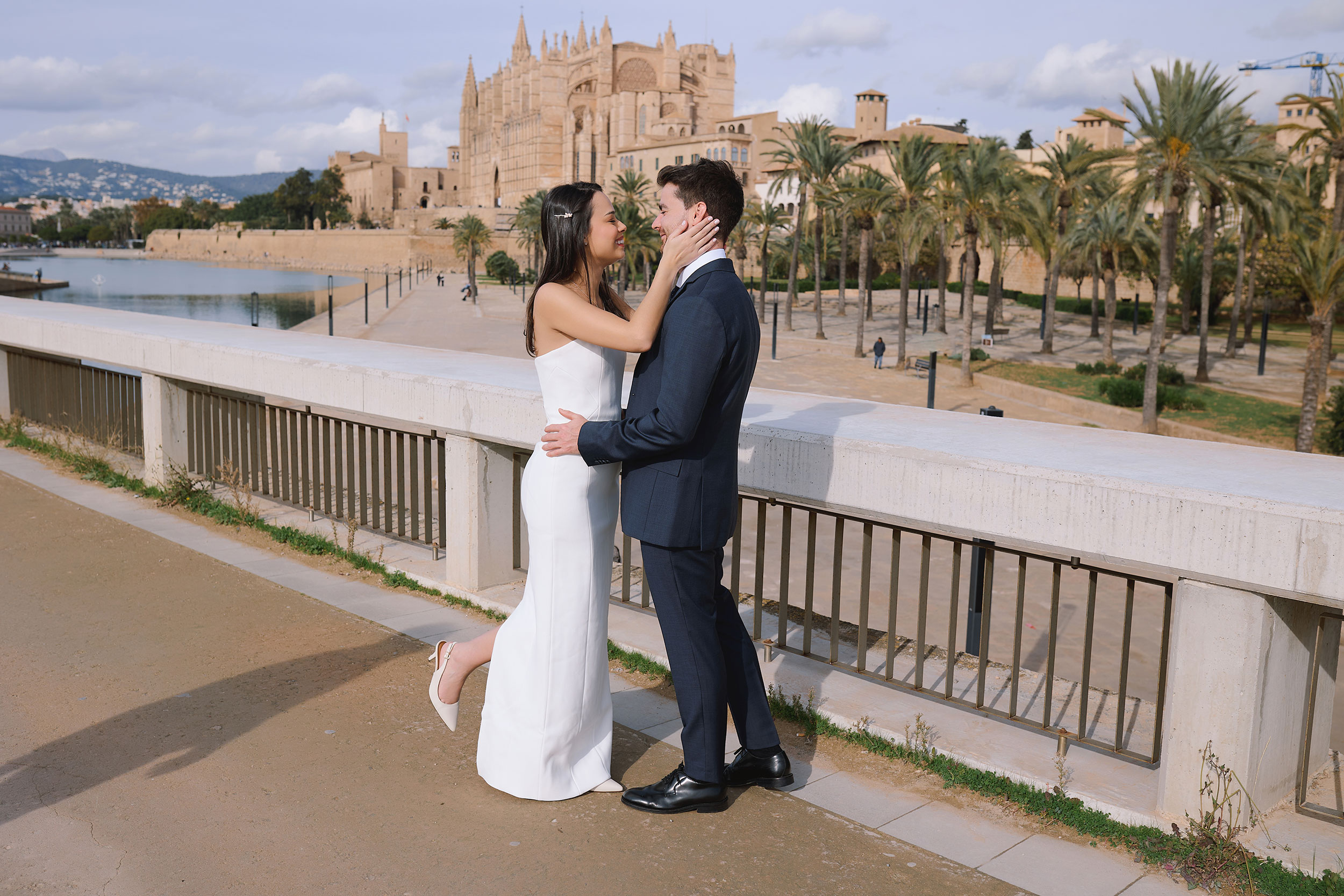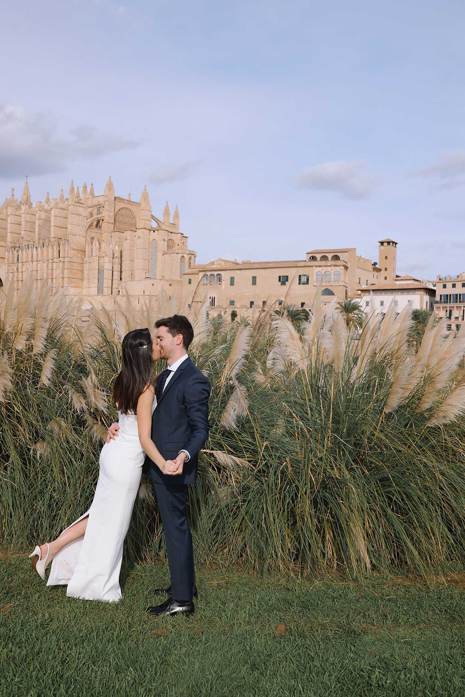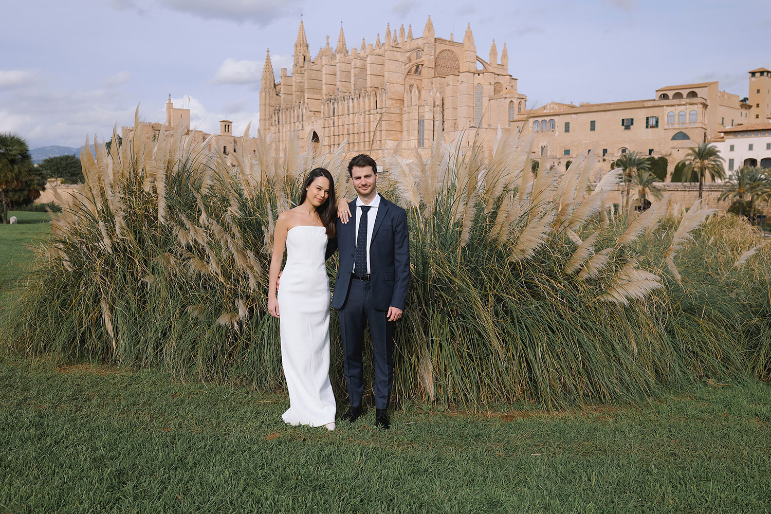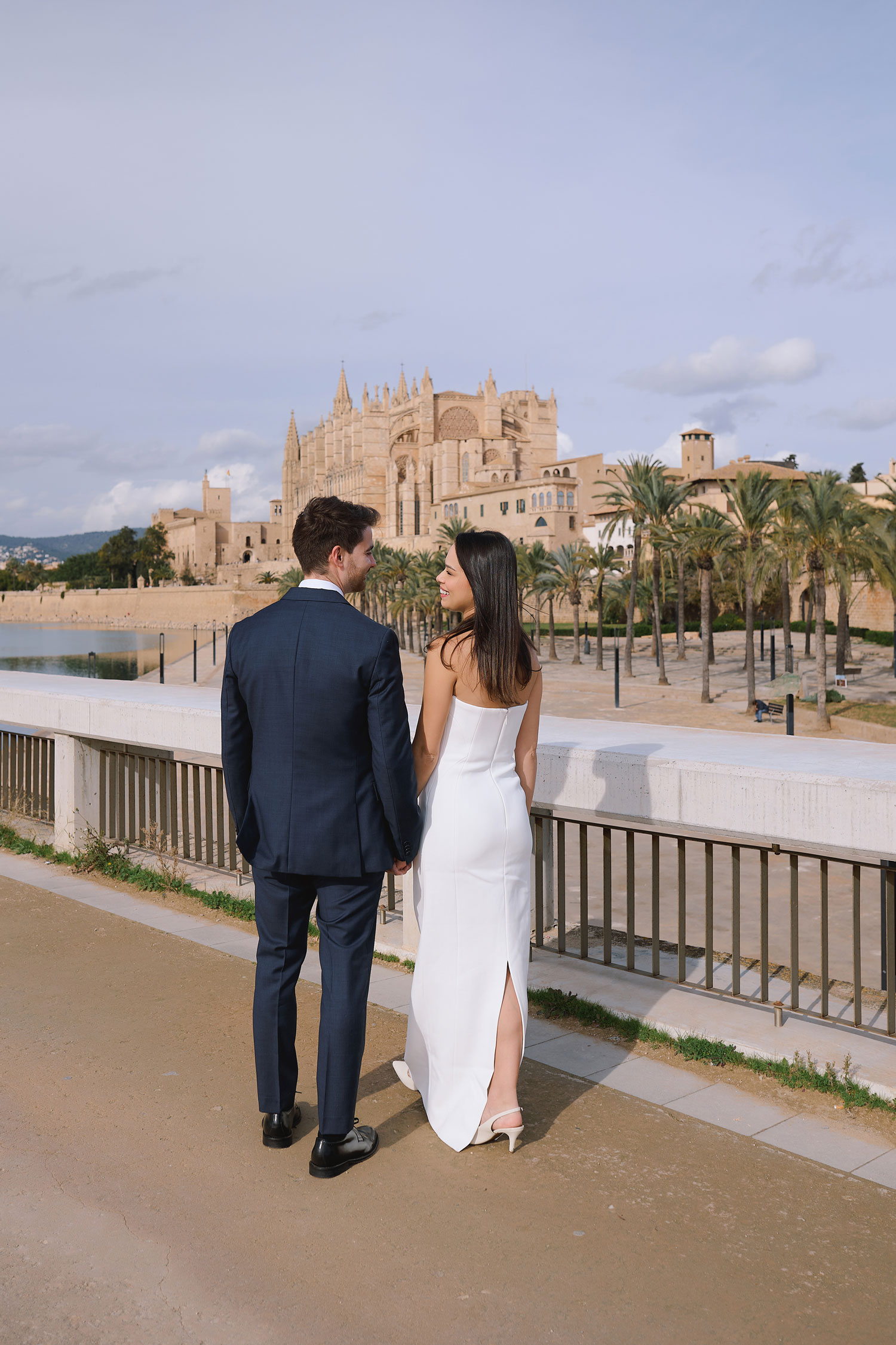 Sesión preboda de Juan y Nathali en la icónica Catedral de Mallorca, envueltos en luz dorada, elegante arquitectura y una tranquila emoción por el día que está por venir.