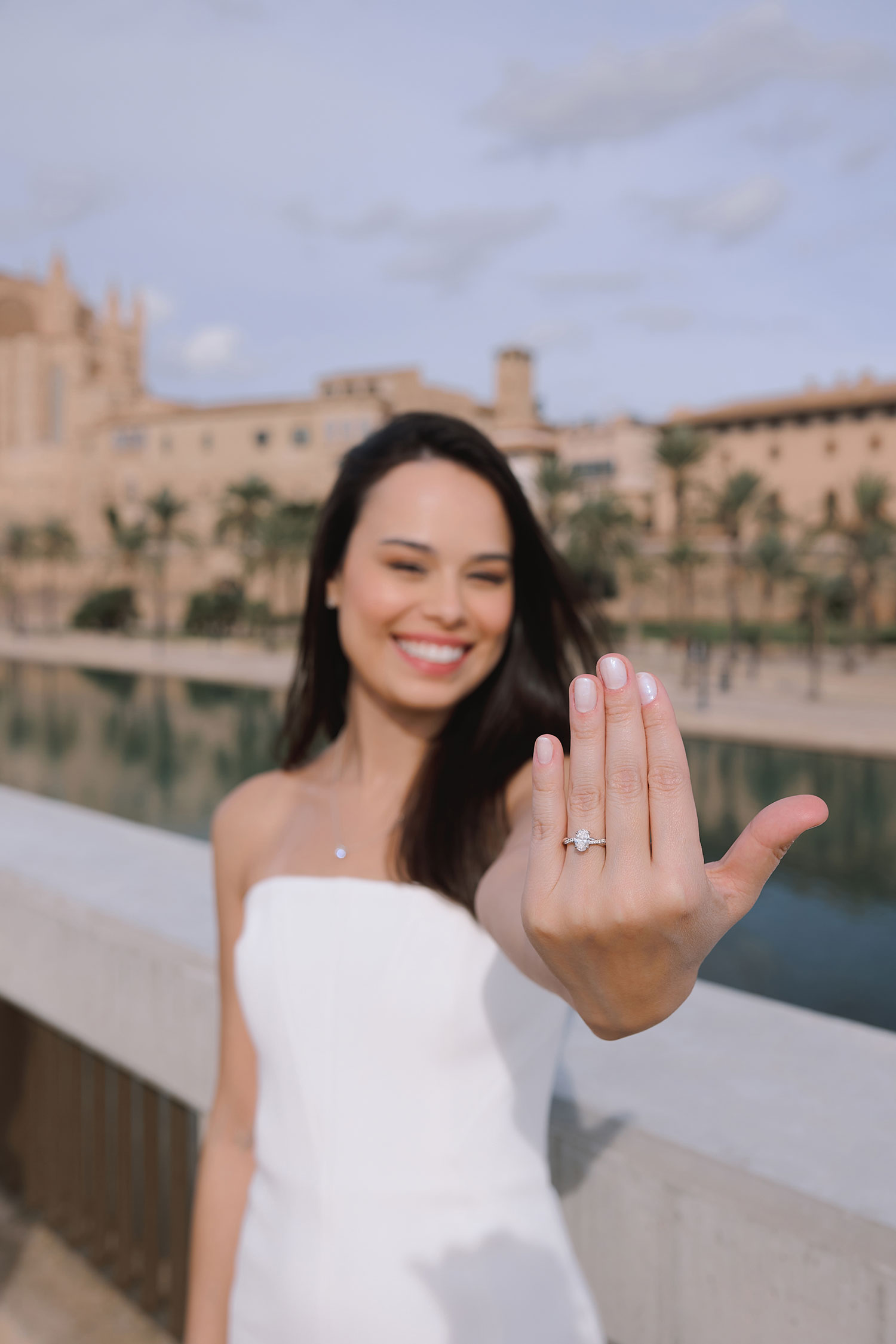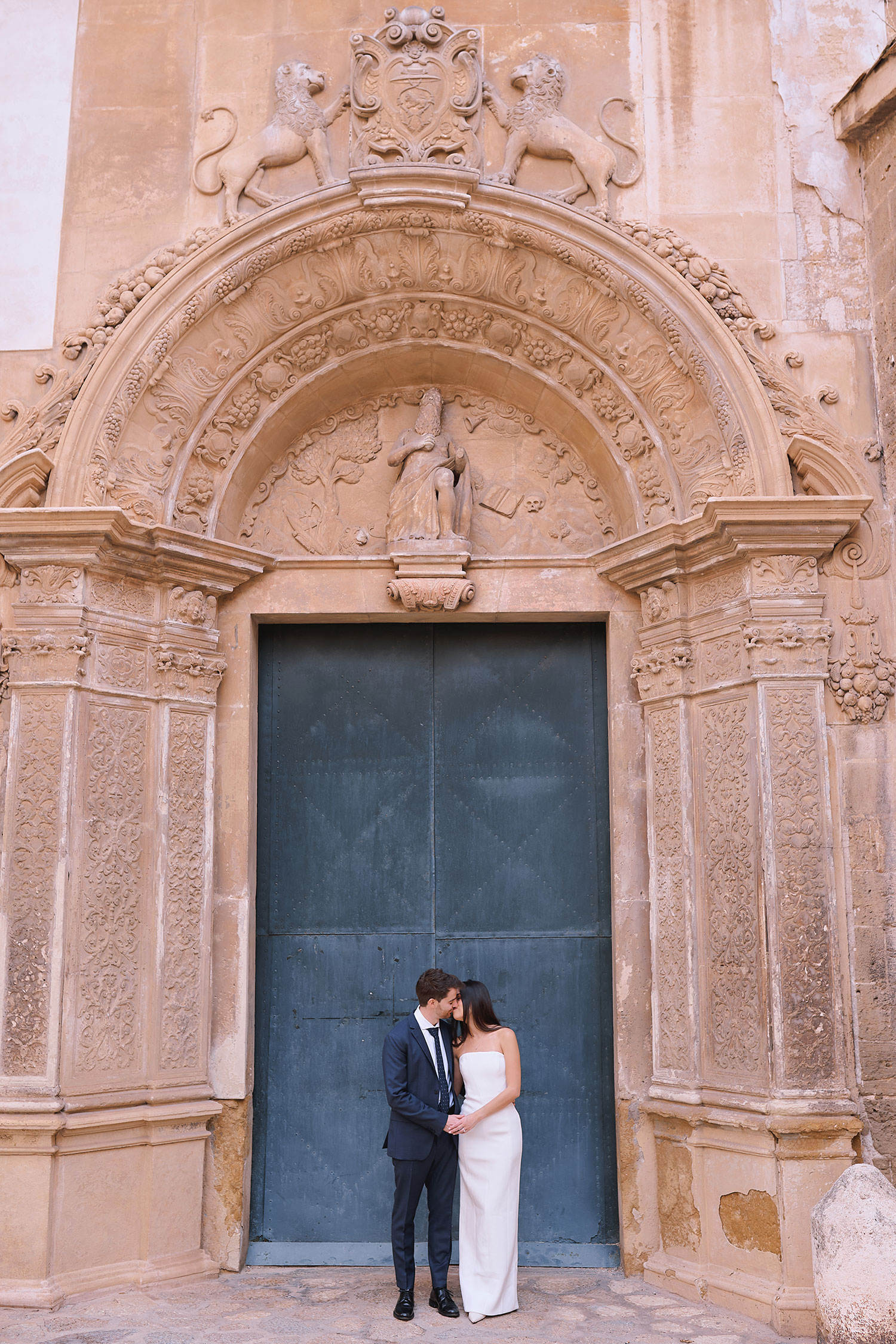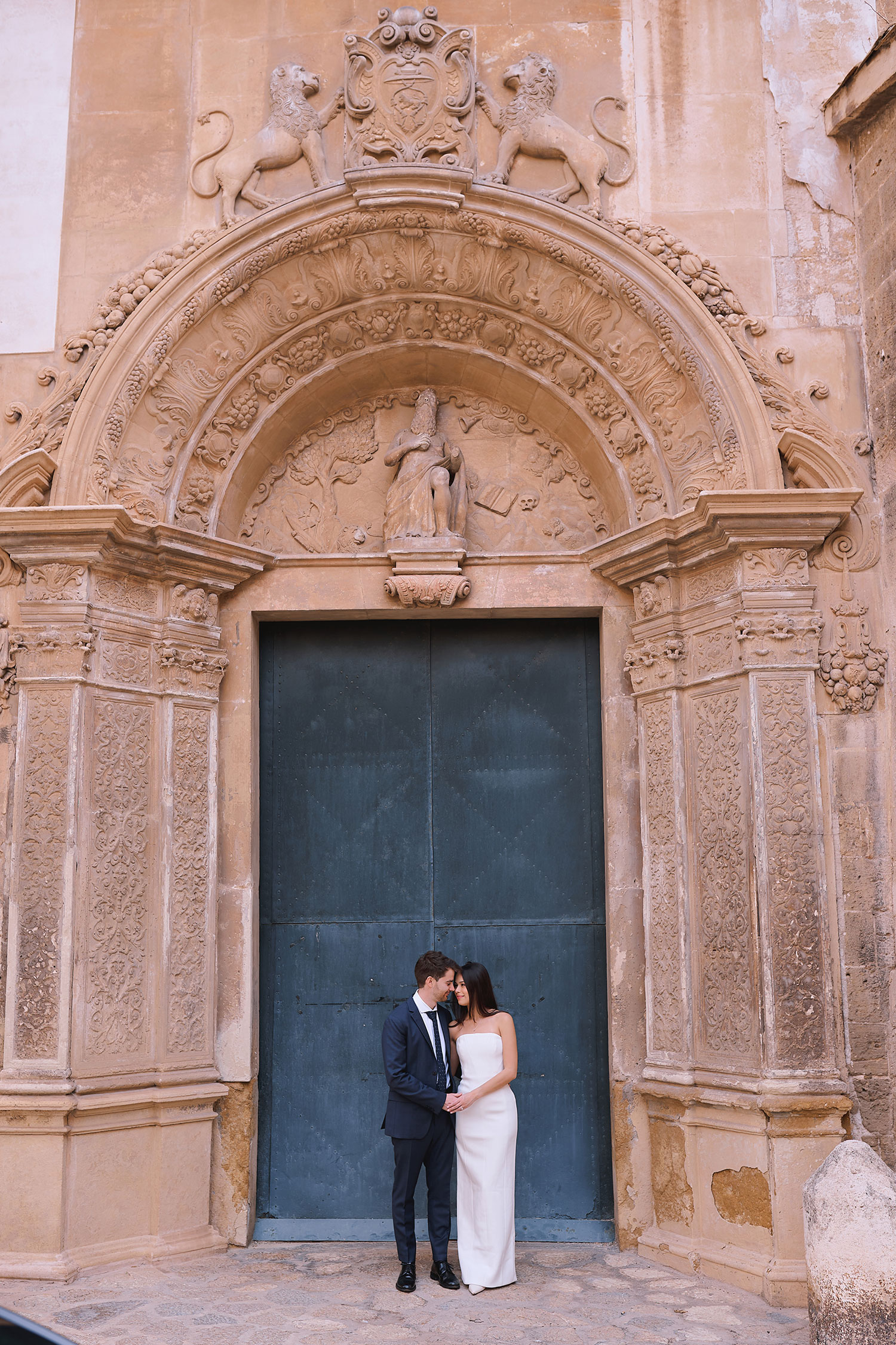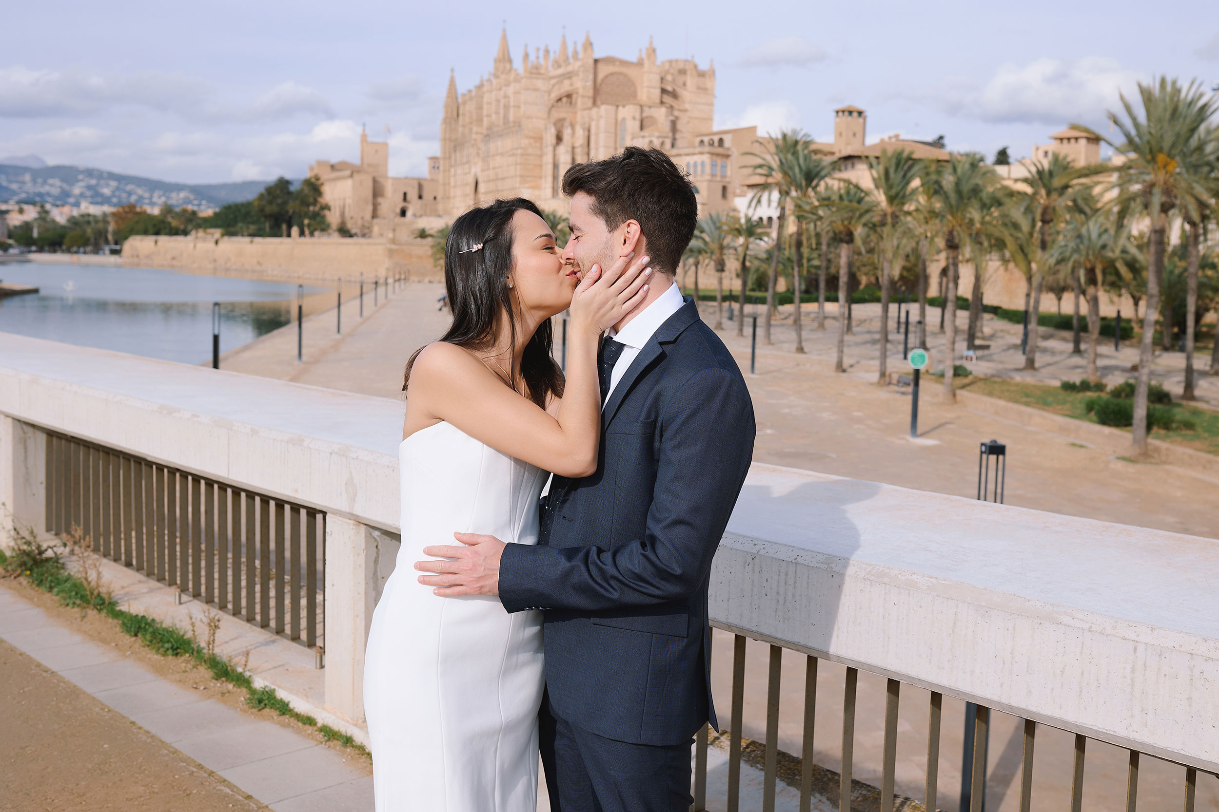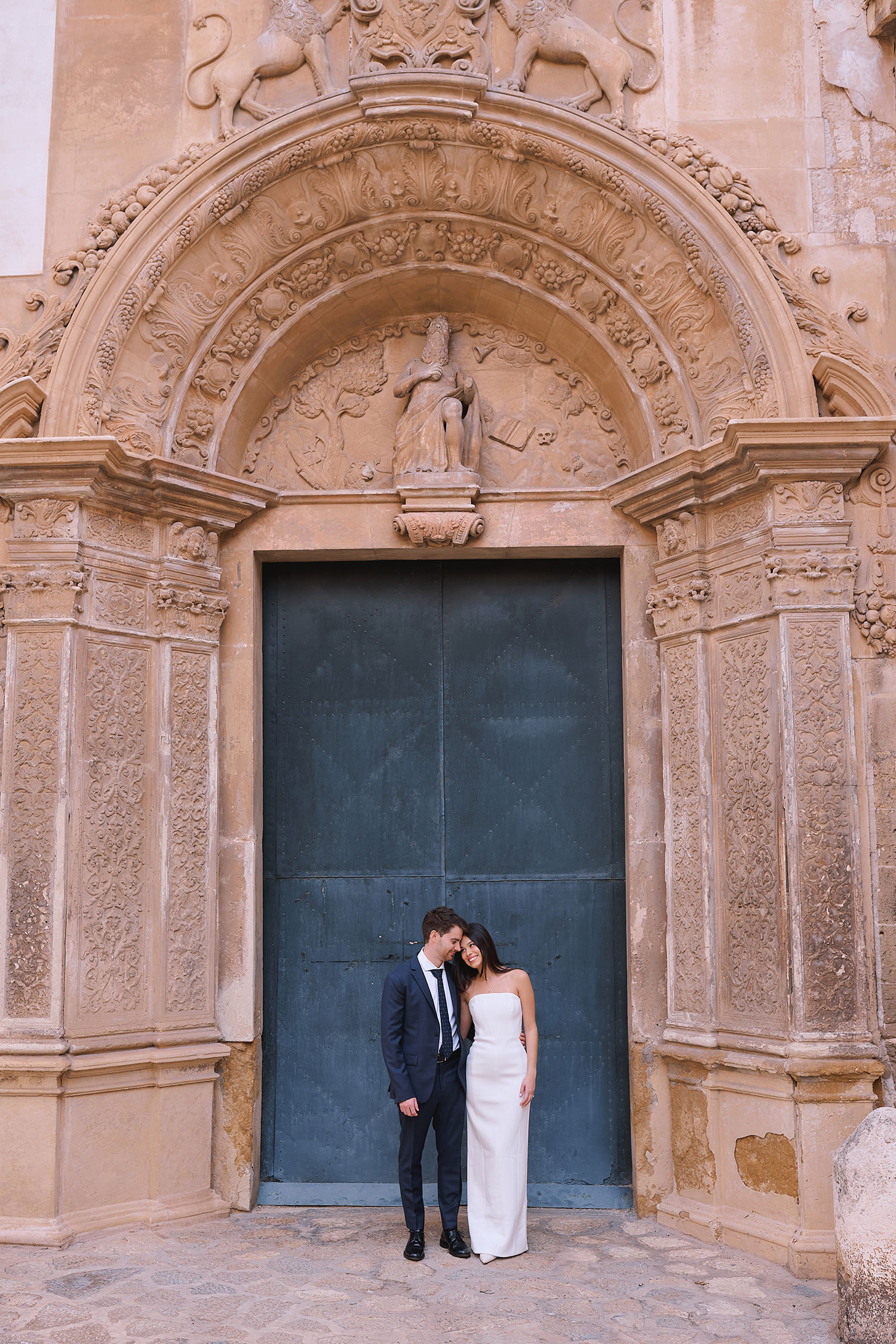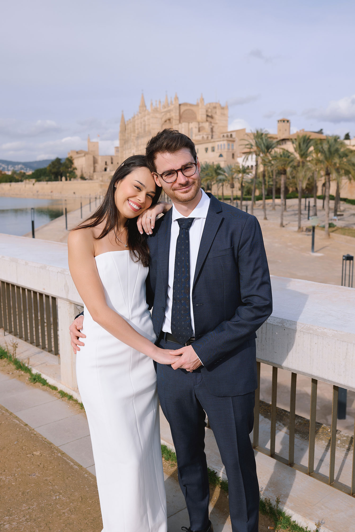 Sesión preboda de Juan y Nathali en la icónica Catedral de Mallorca, envueltos en luz dorada, elegante arquitectura y una tranquila emoción por el día que está por venir.