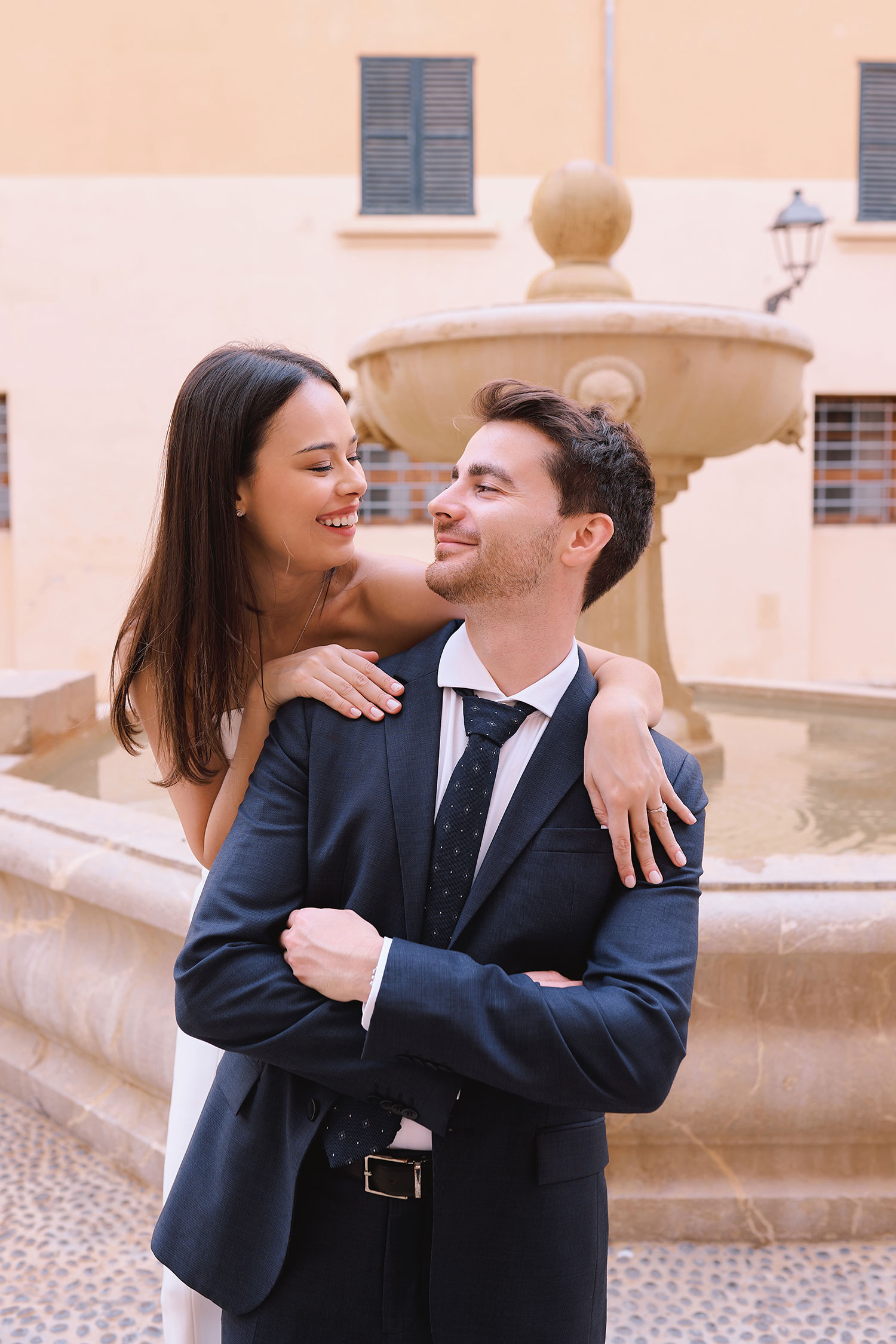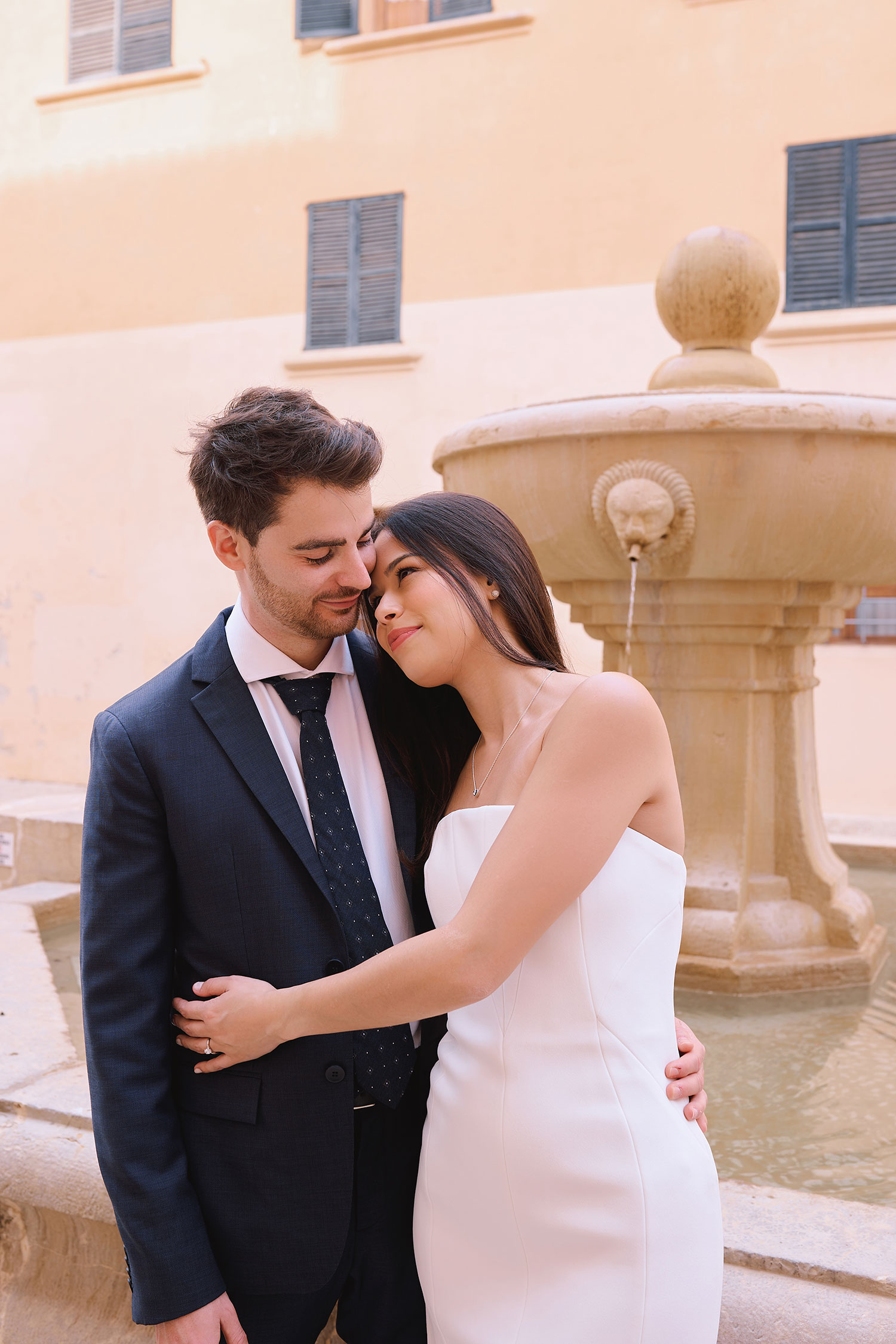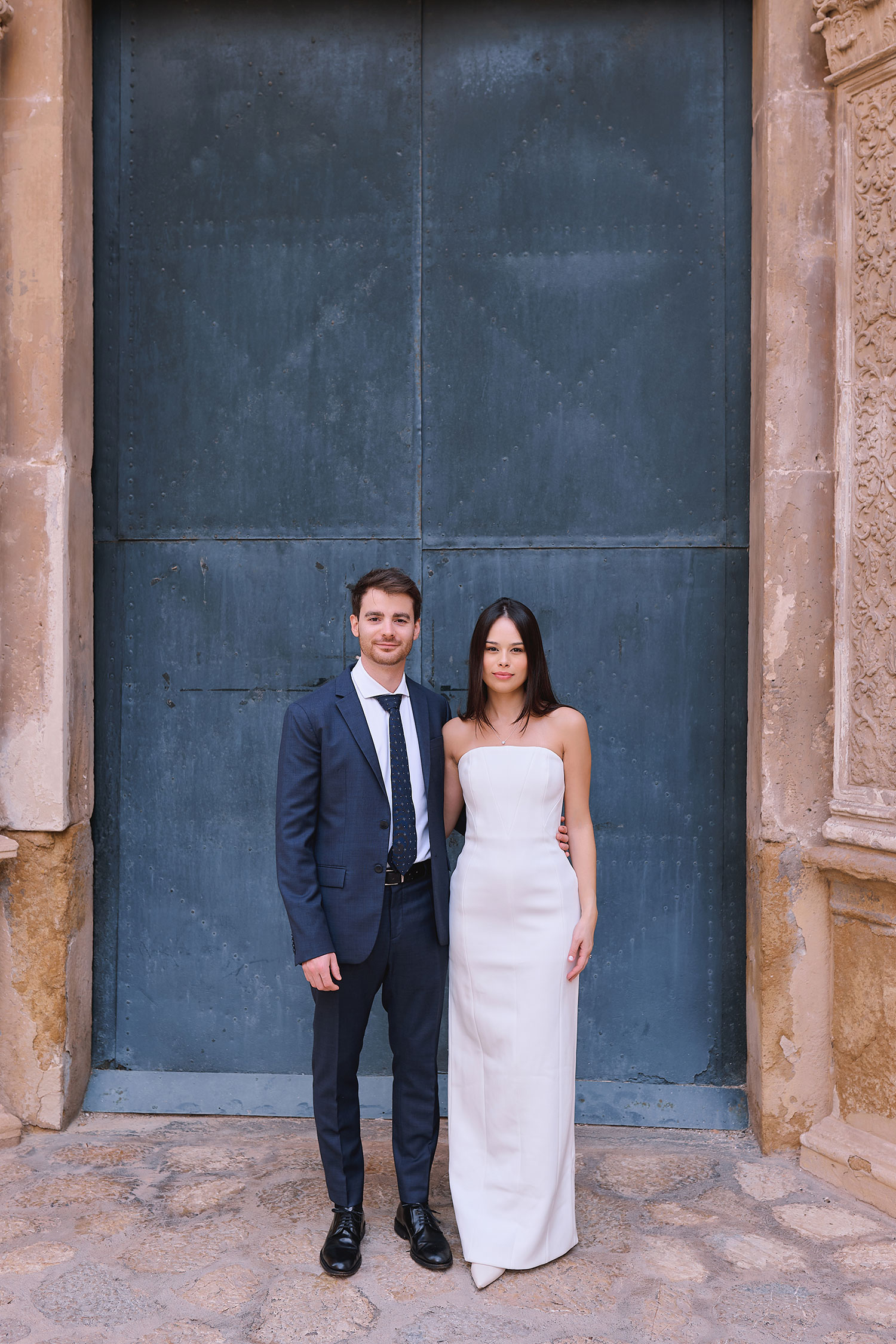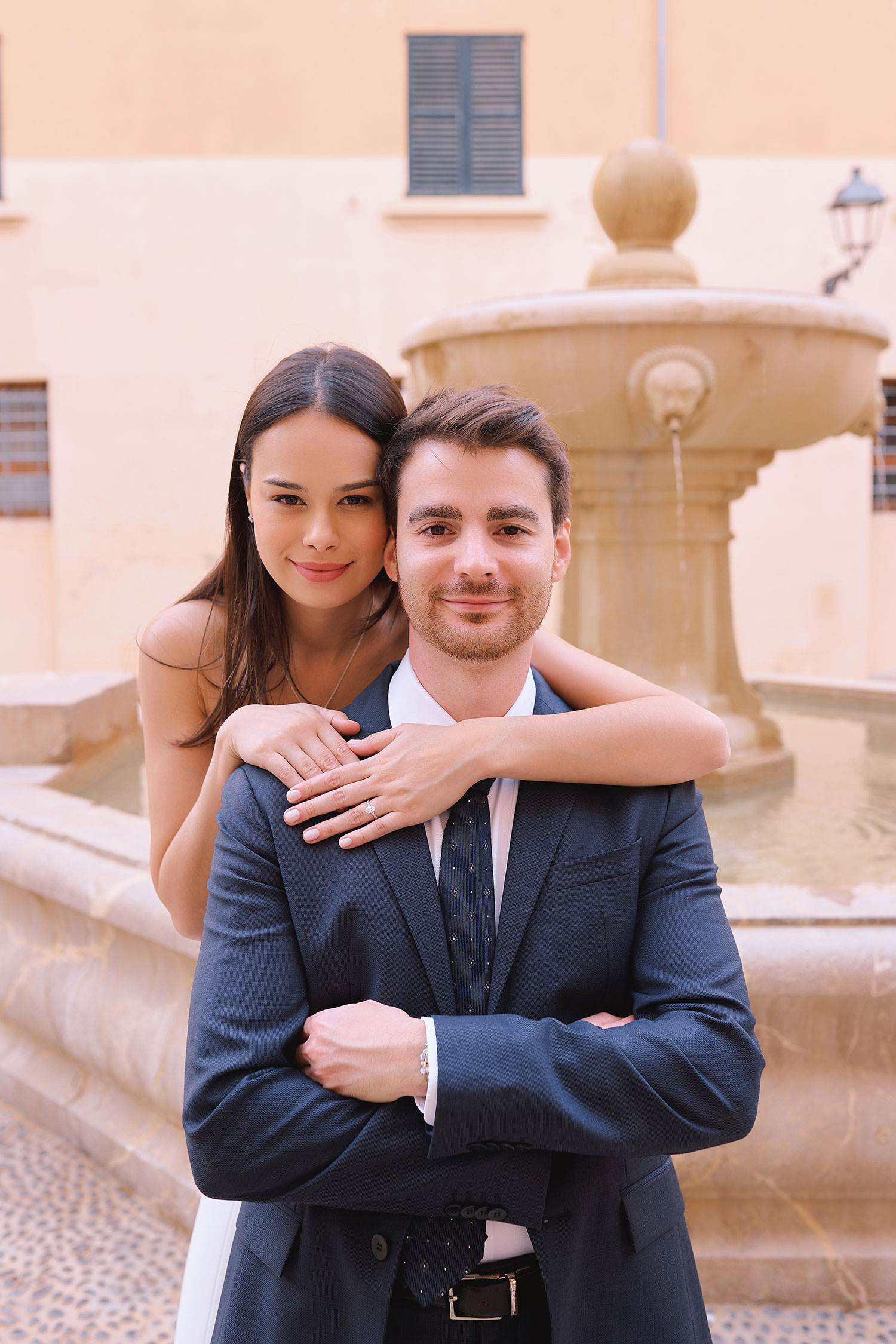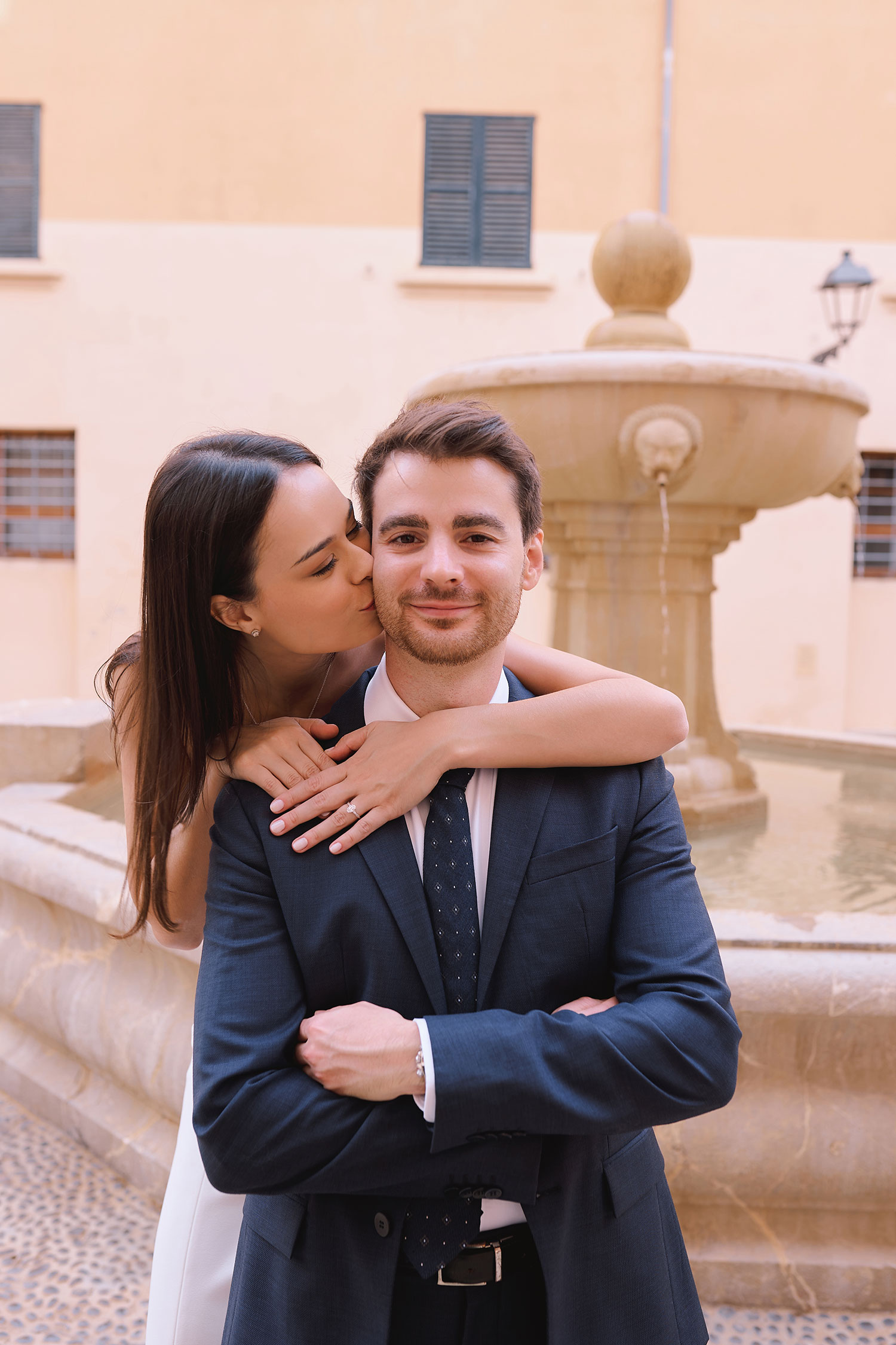 Sesión preboda de Juan y Nathali en la icónica Catedral de Mallorca, envueltos en luz dorada, elegante arquitectura y una tranquila emoción por el día que está por venir.
