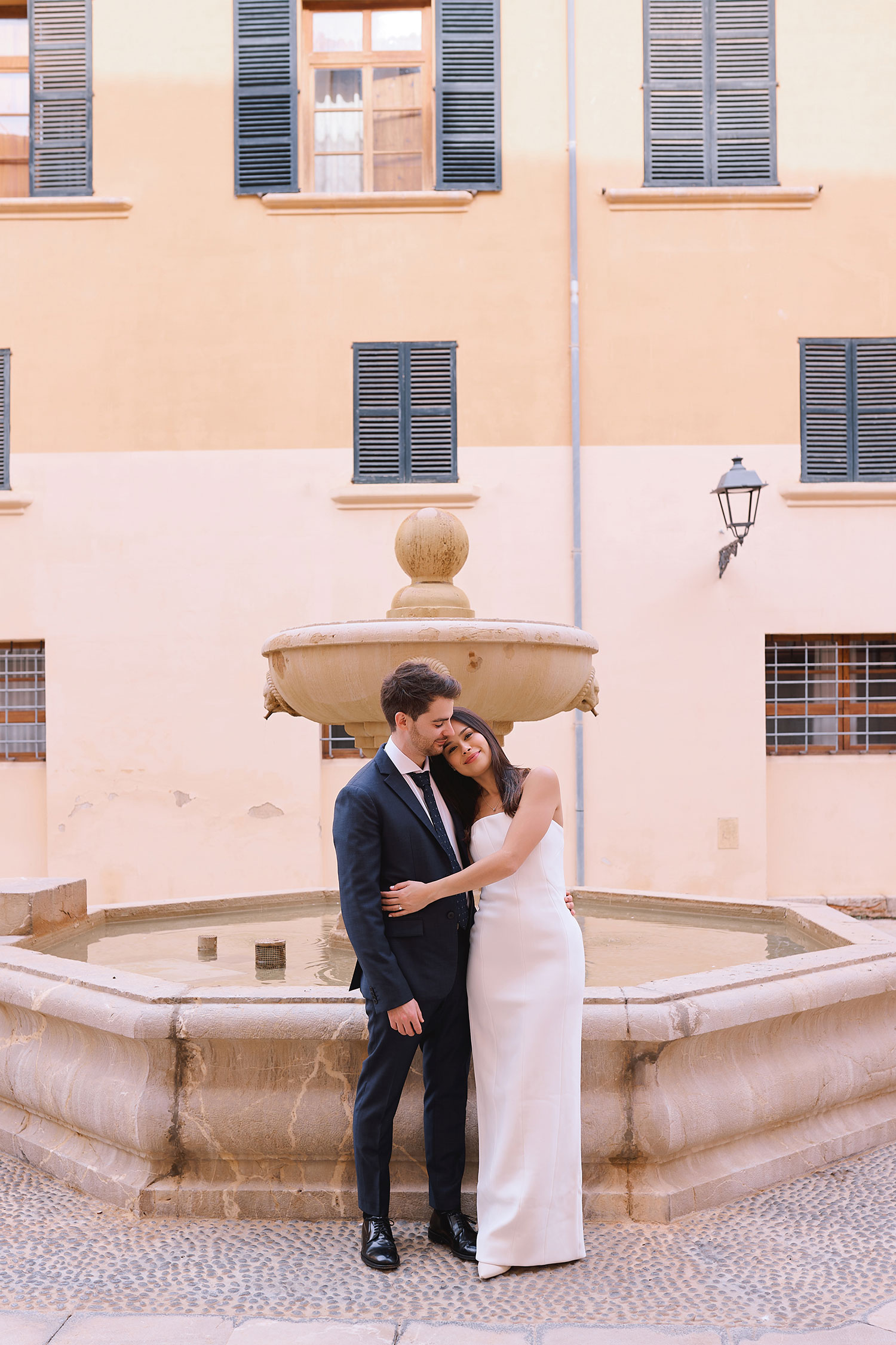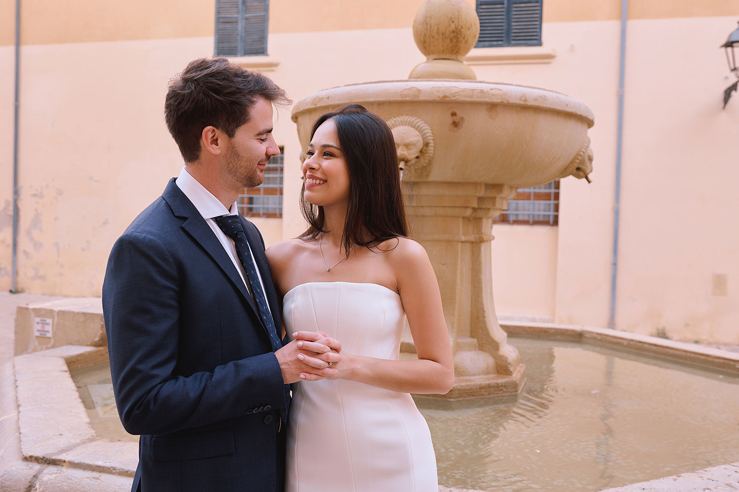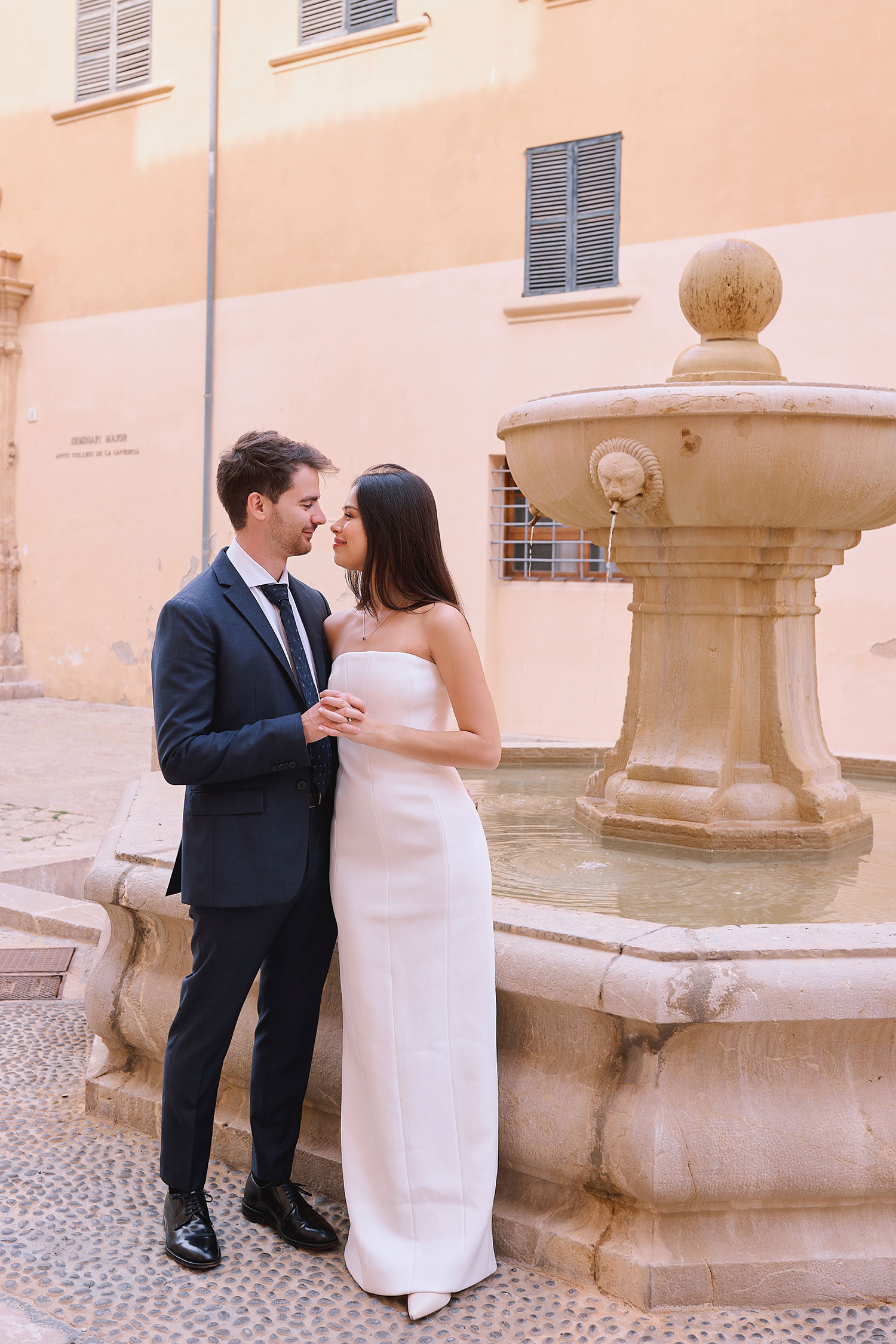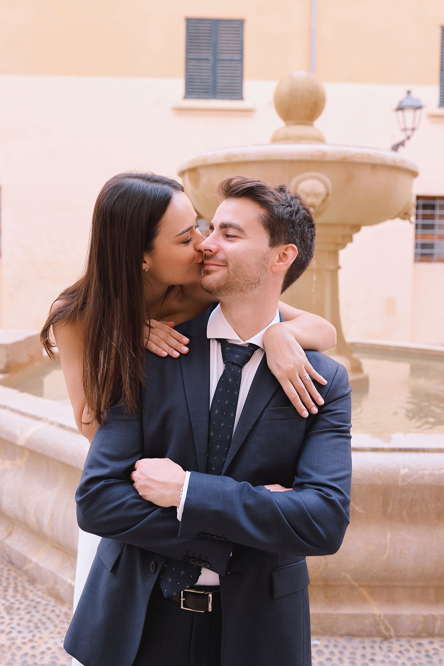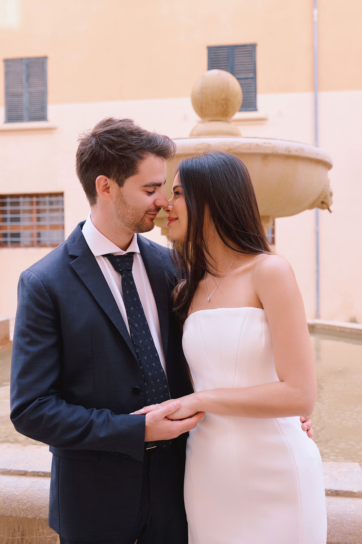 Sesión preboda de Juan y Nathali en la icónica Catedral de Mallorca, envueltos en luz dorada, elegante arquitectura y una tranquila emoción por el día que está por venir.