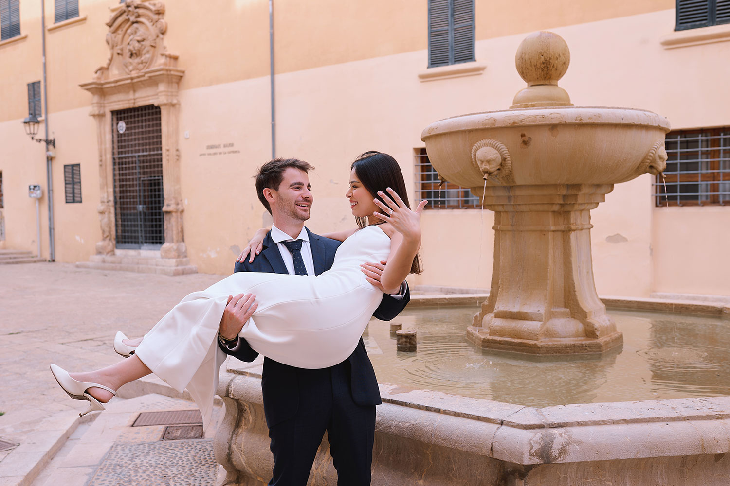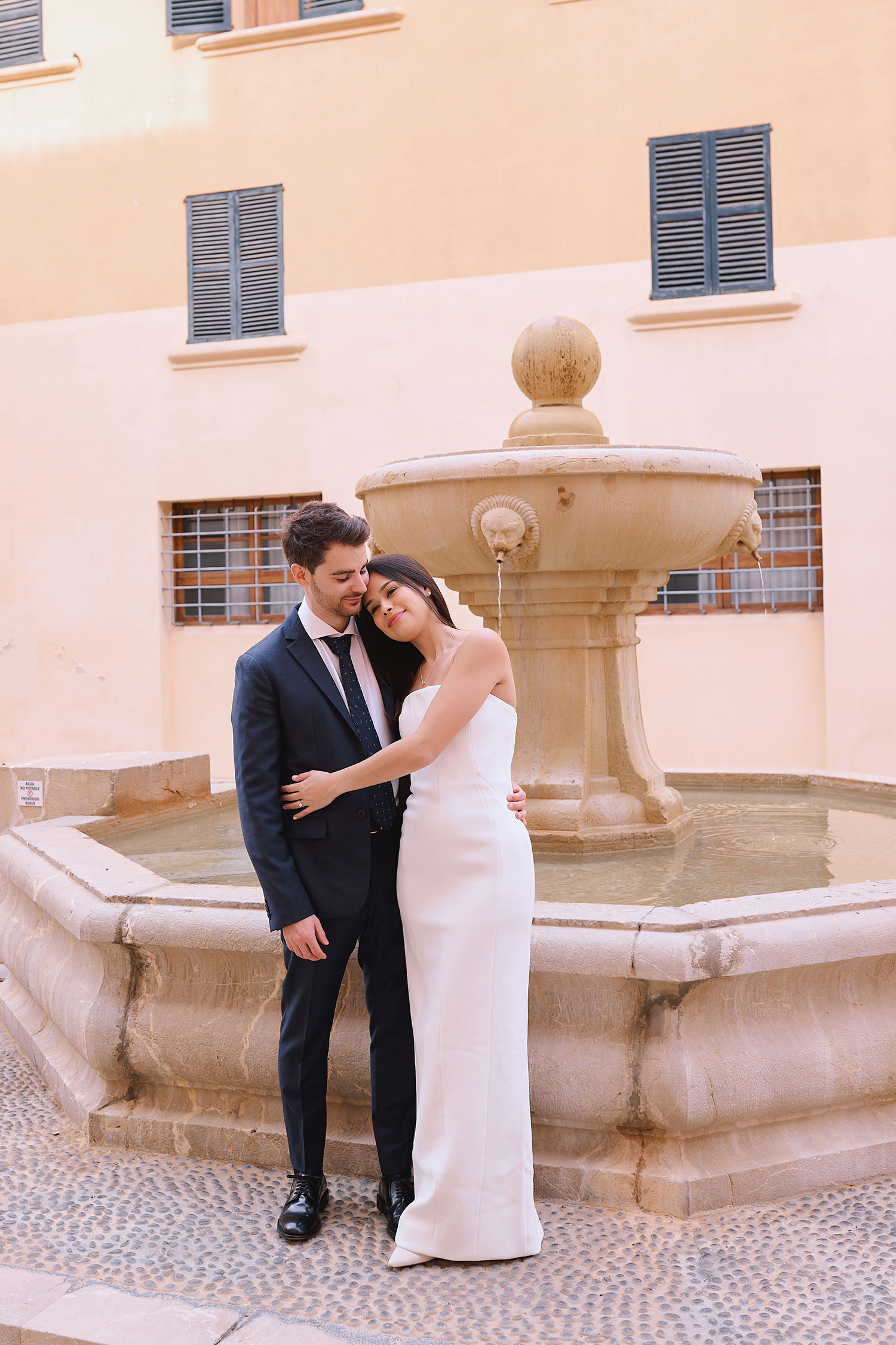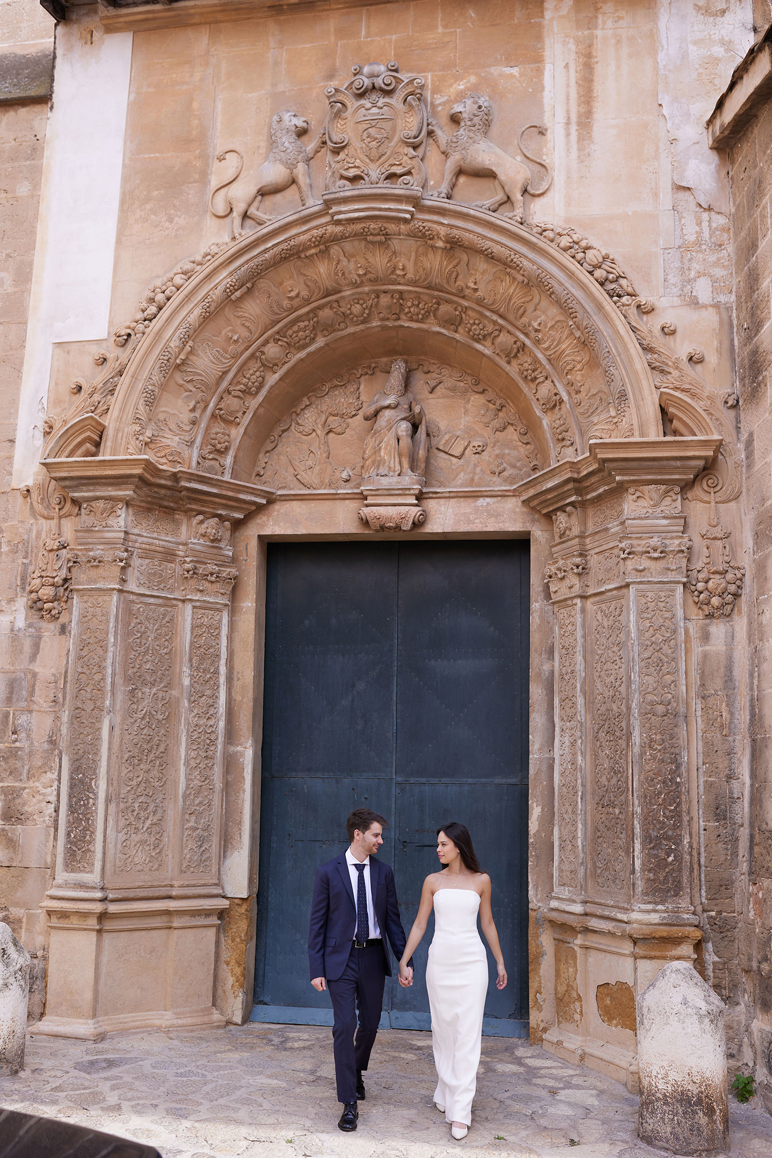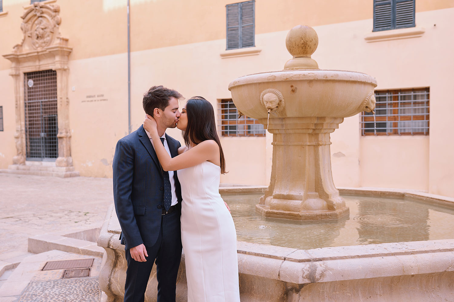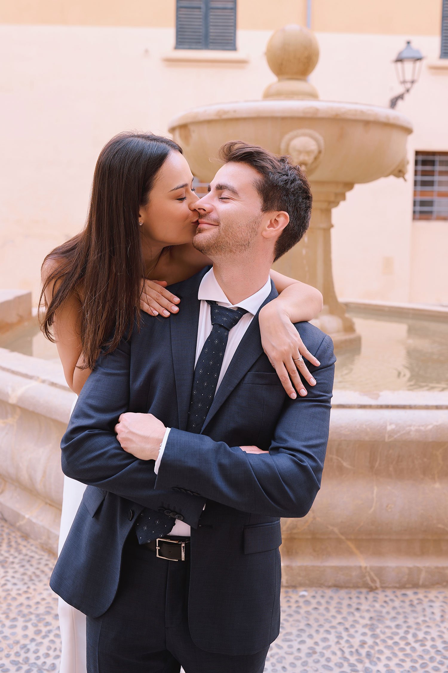 Sesión preboda de Juan y Nathali en la icónica Catedral de Mallorca, envueltos en luz dorada, elegante arquitectura y una tranquila emoción por el día que está por venir.