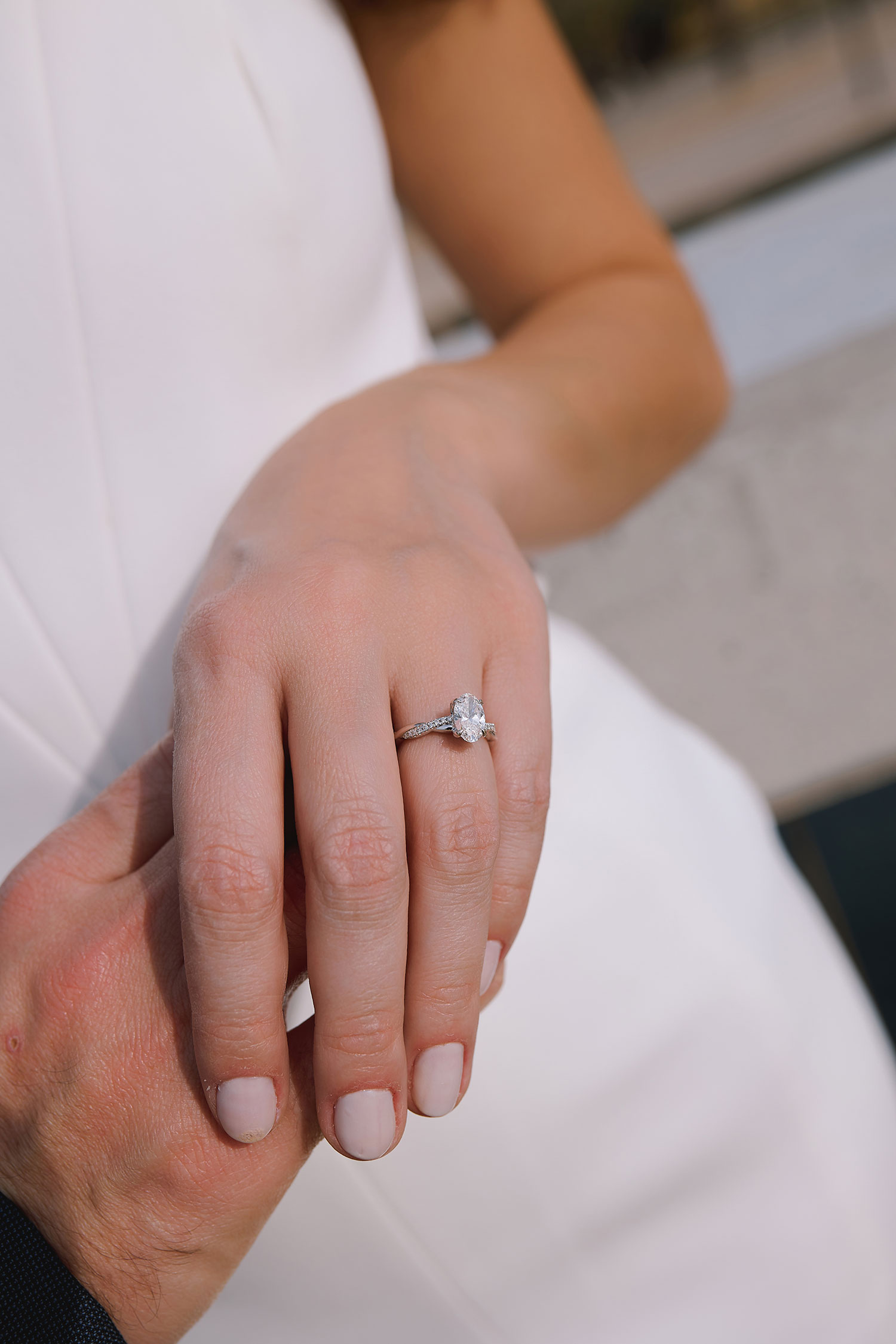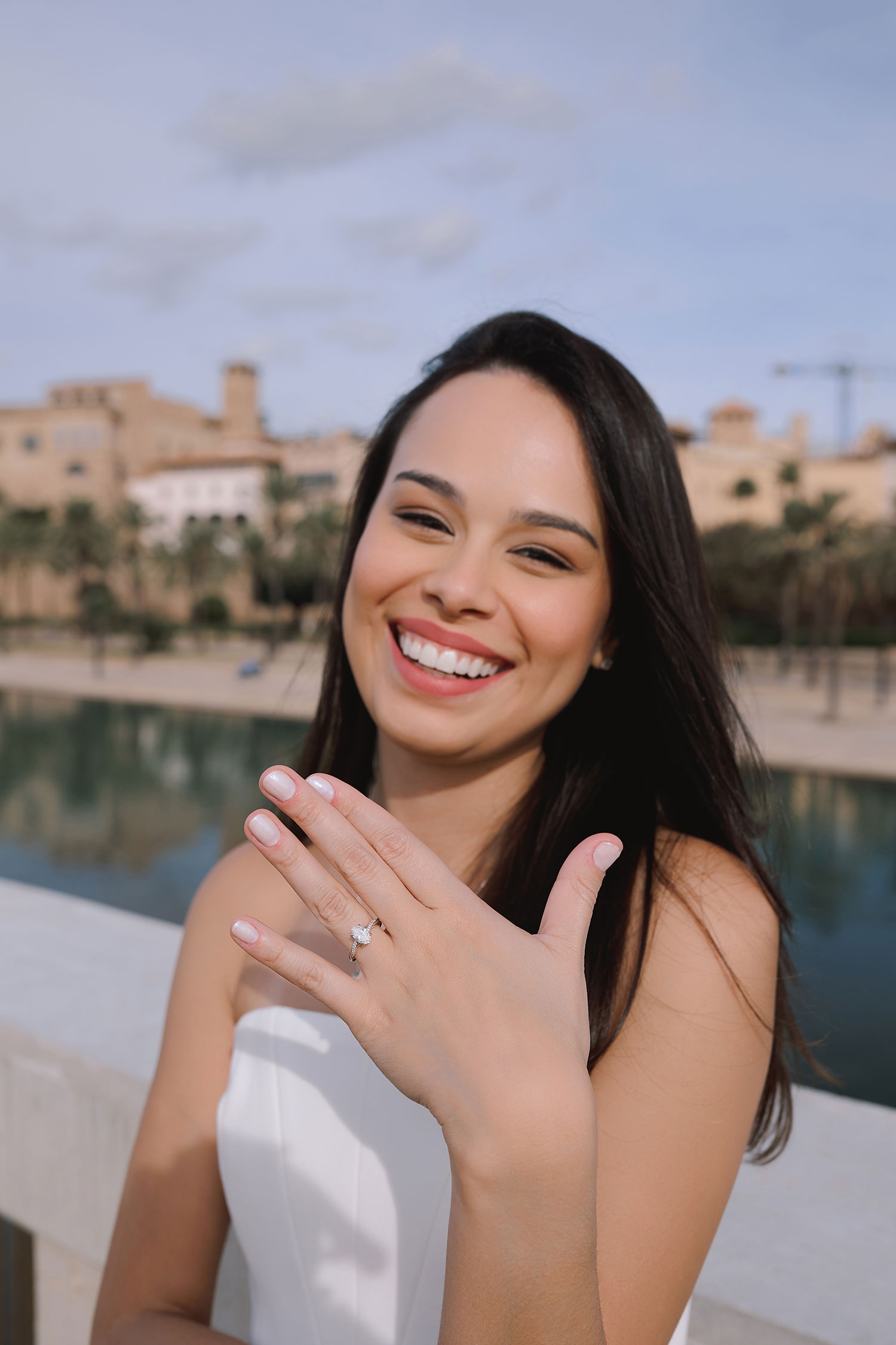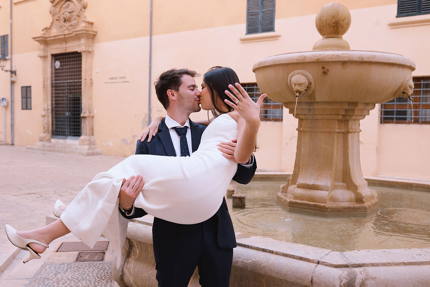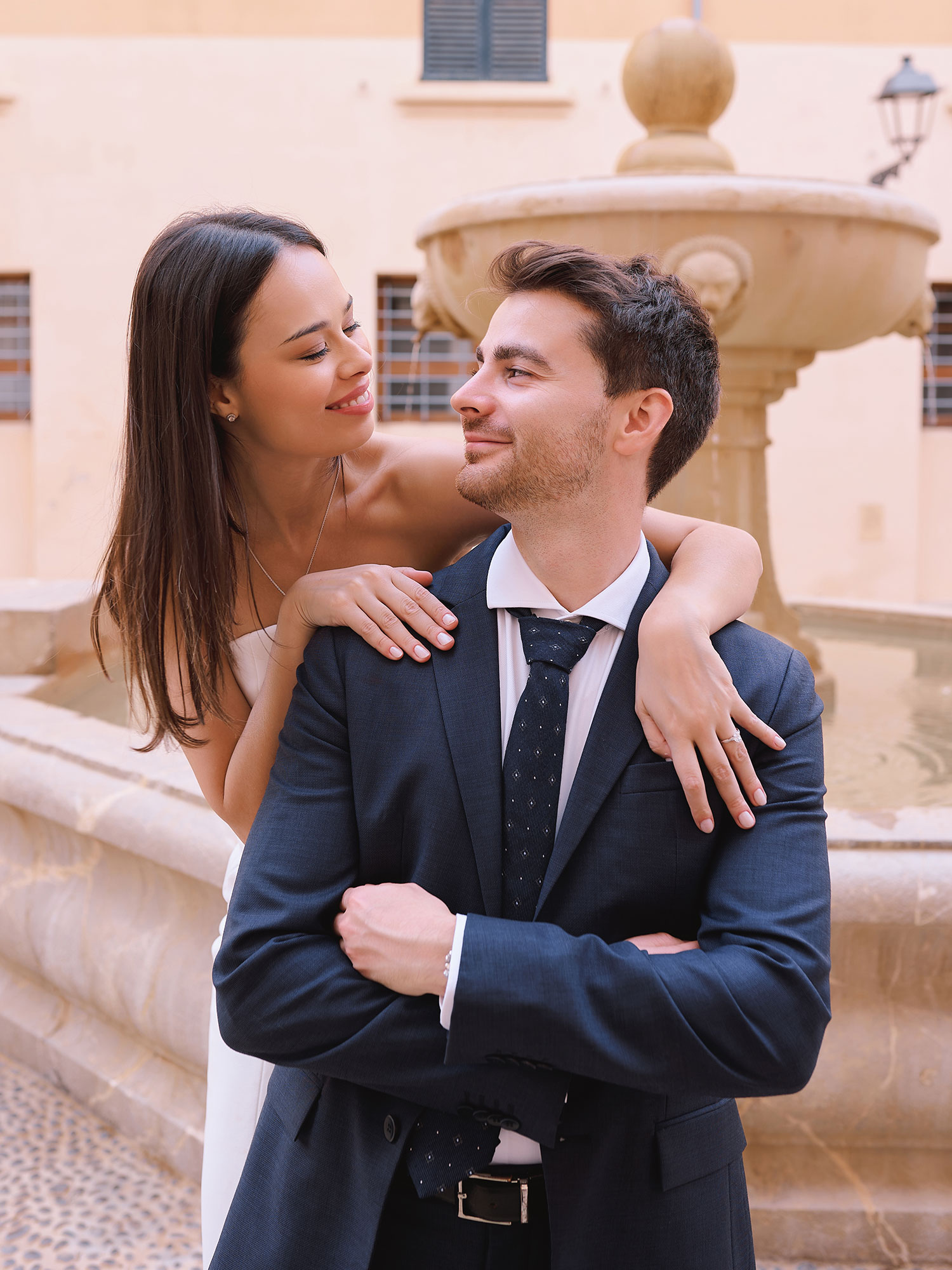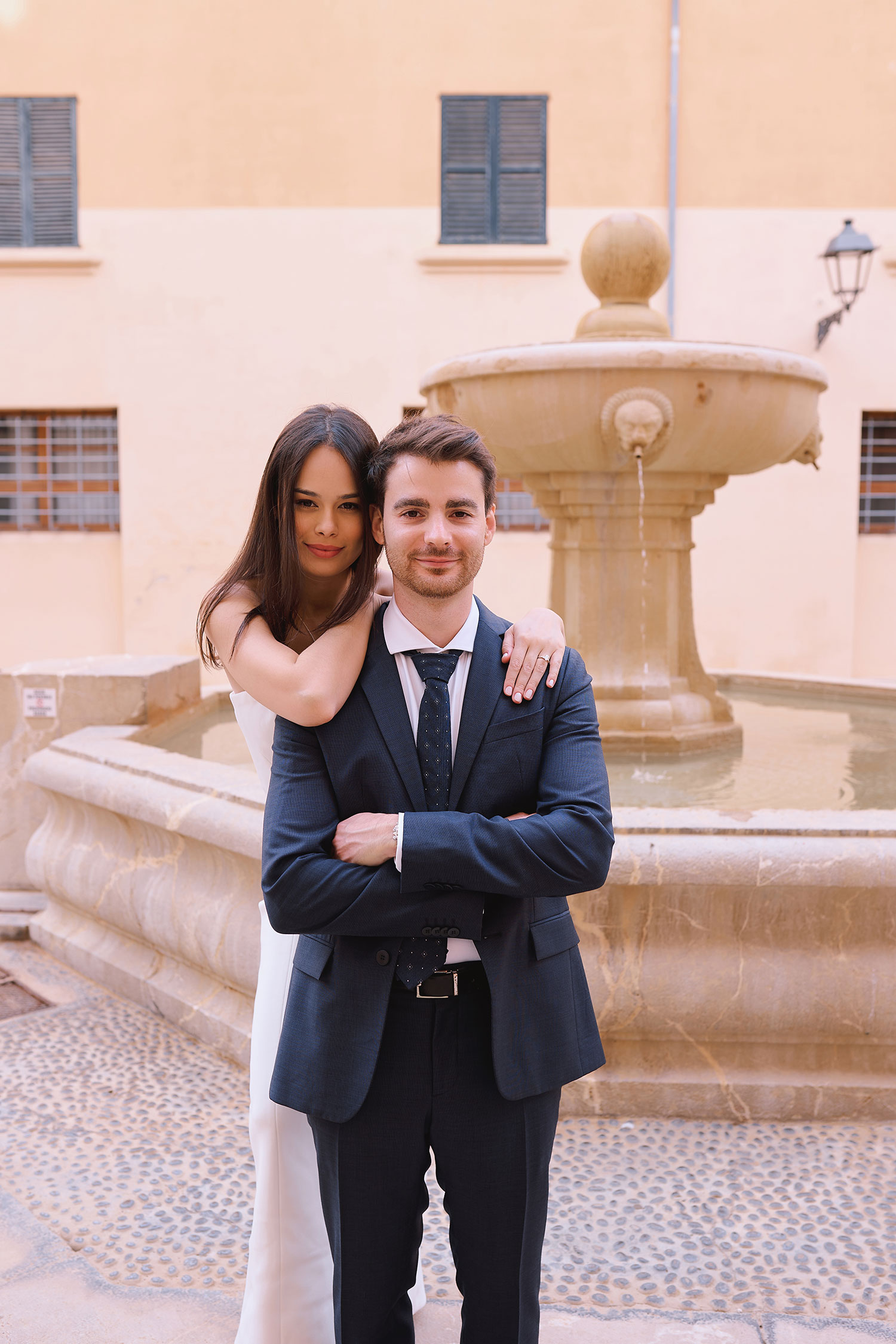 Sesión preboda de Juan y Nathali en la icónica Catedral de Mallorca, envueltos en luz dorada, elegante arquitectura y una tranquila emoción por el día que está por venir.