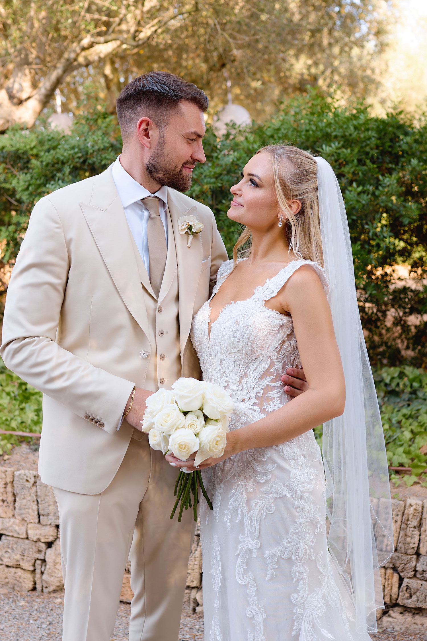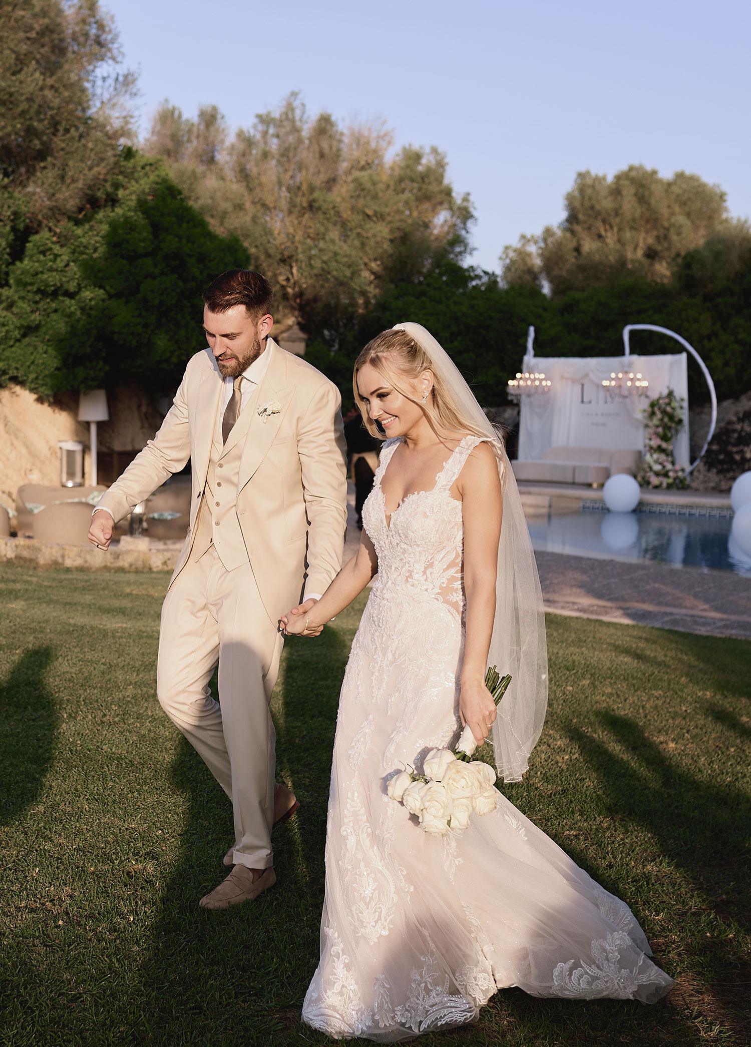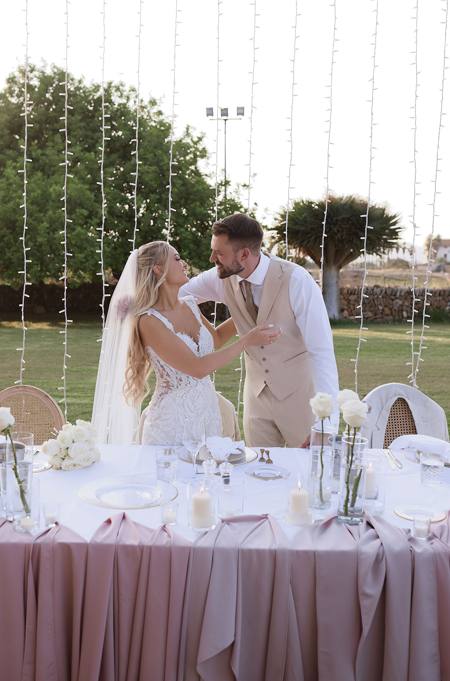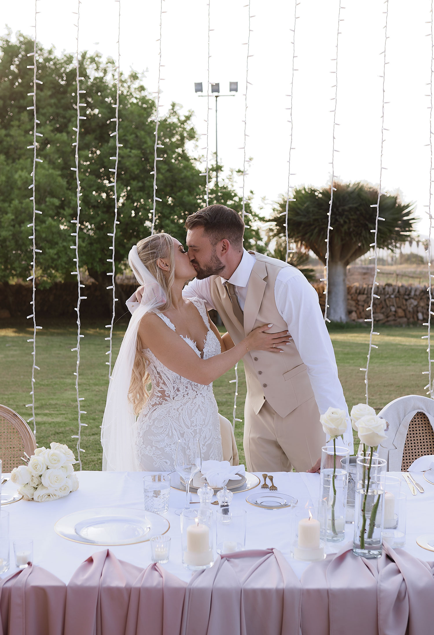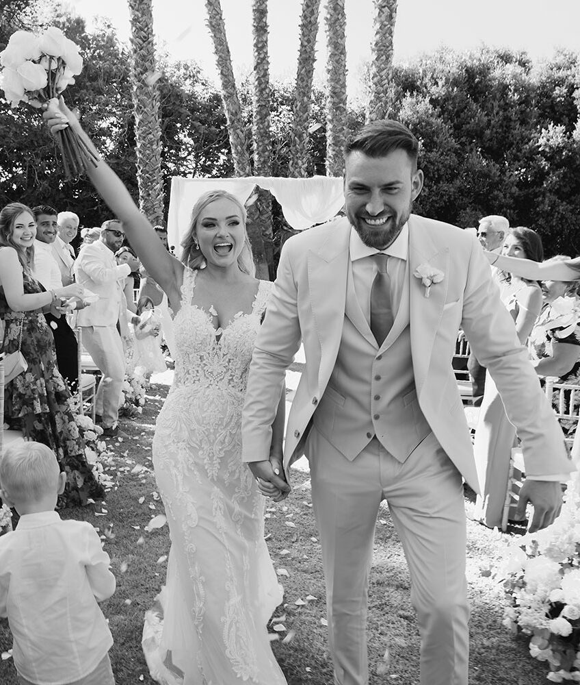 Boda de lujo en Santa Eulalia, donde una hermosa pareja intercambió votos bajo una piedra histórica y la luz dorada de las Islas Baleares: un día envuelto en elegancia, romance y encanto atemporal.