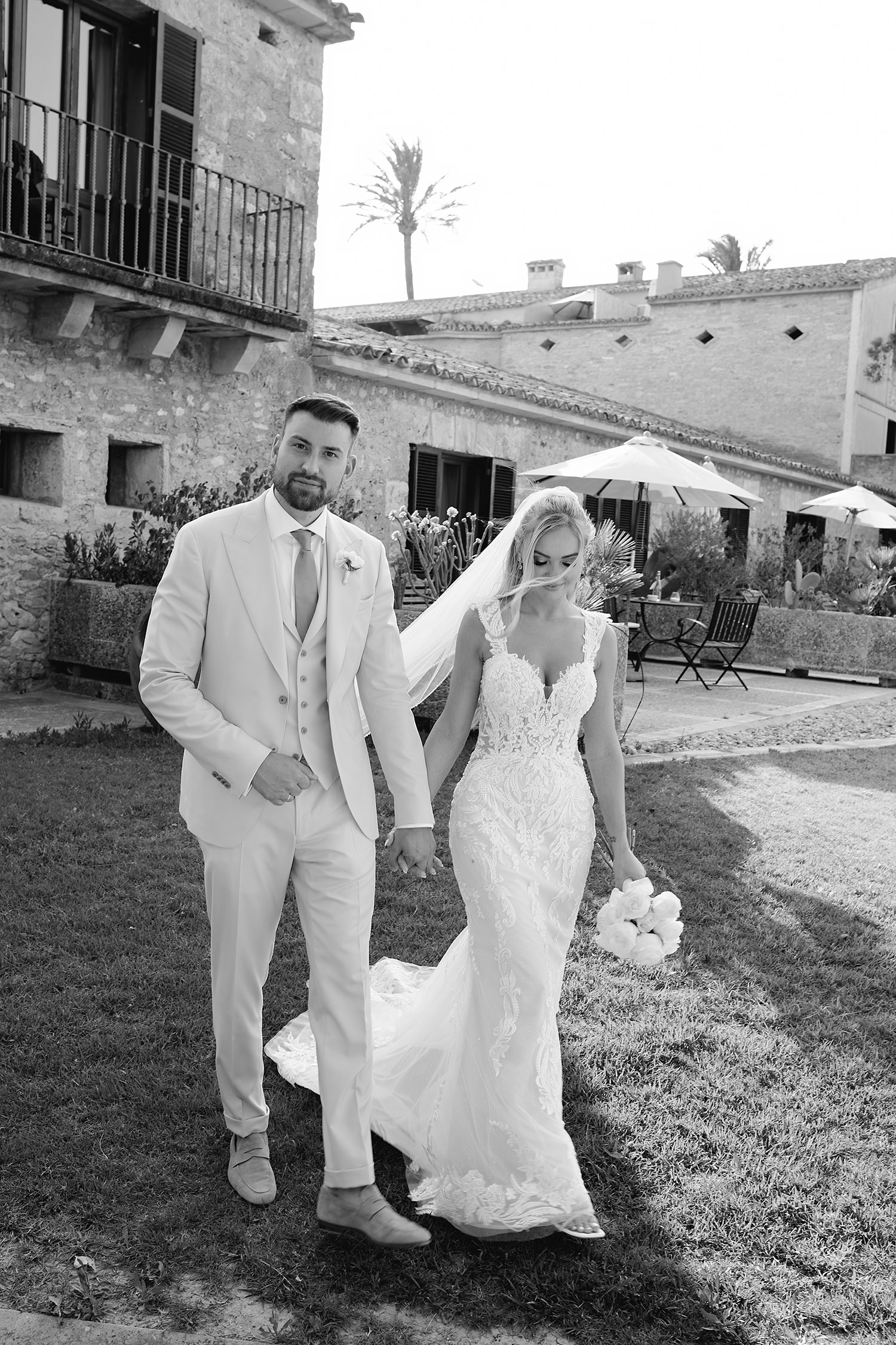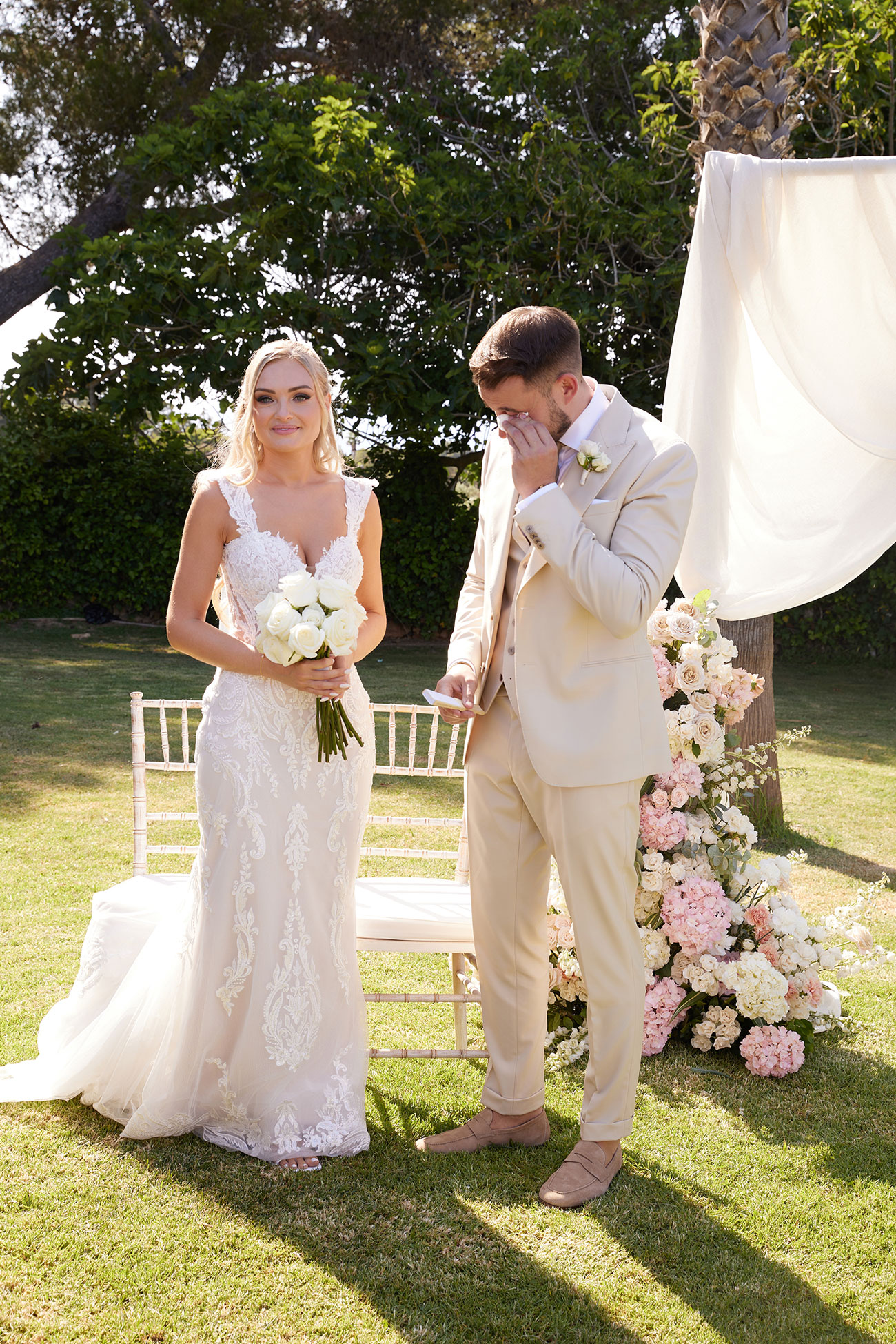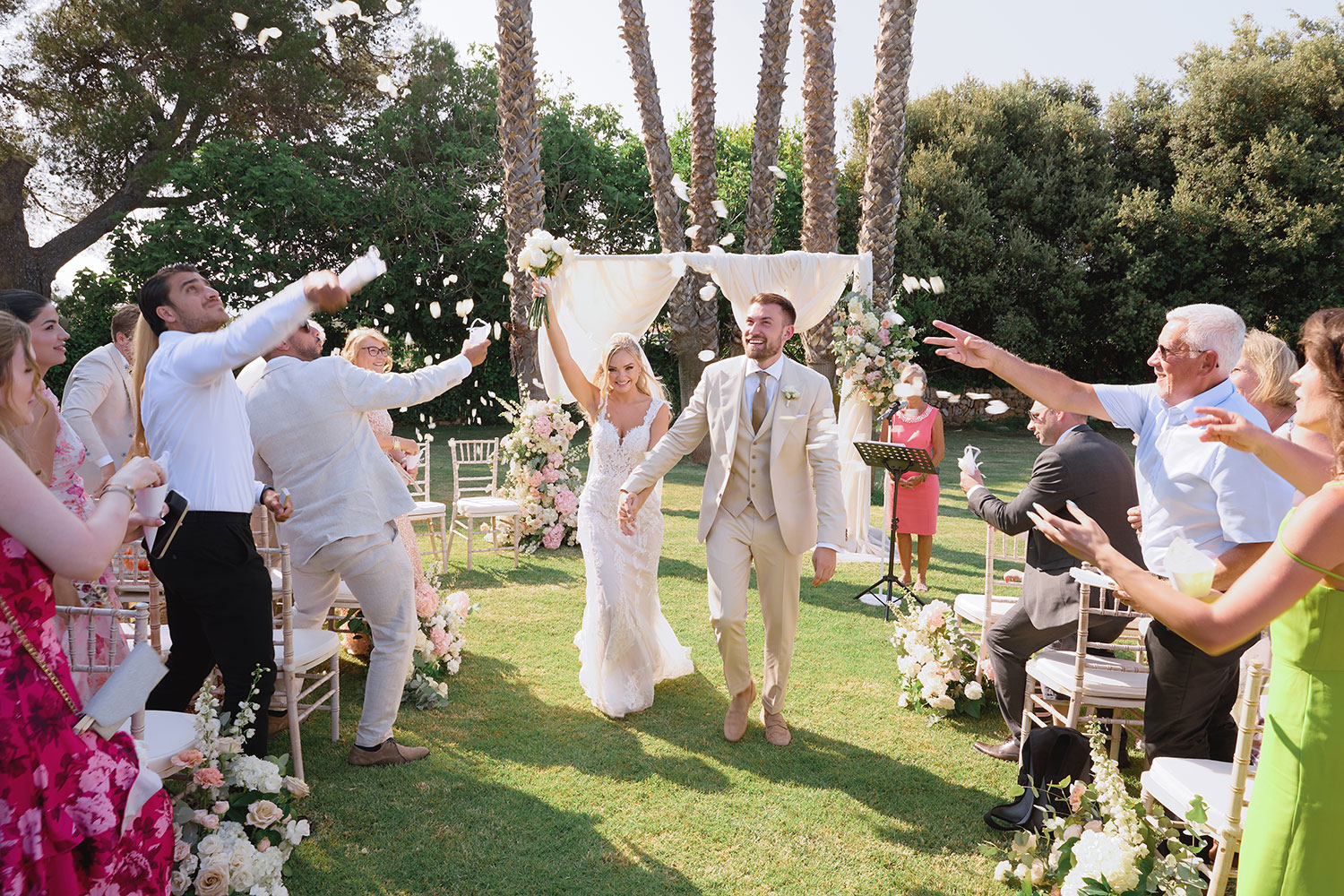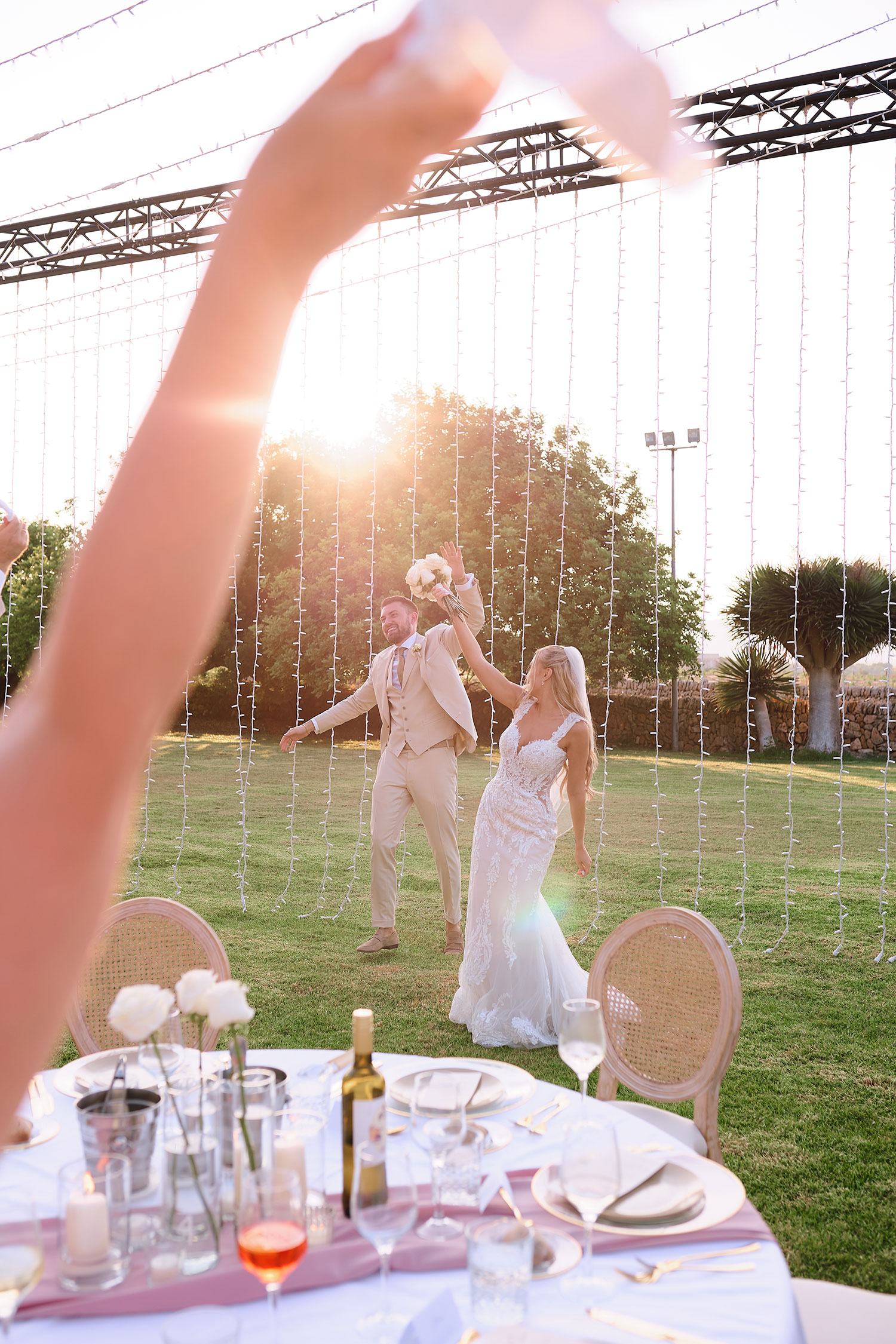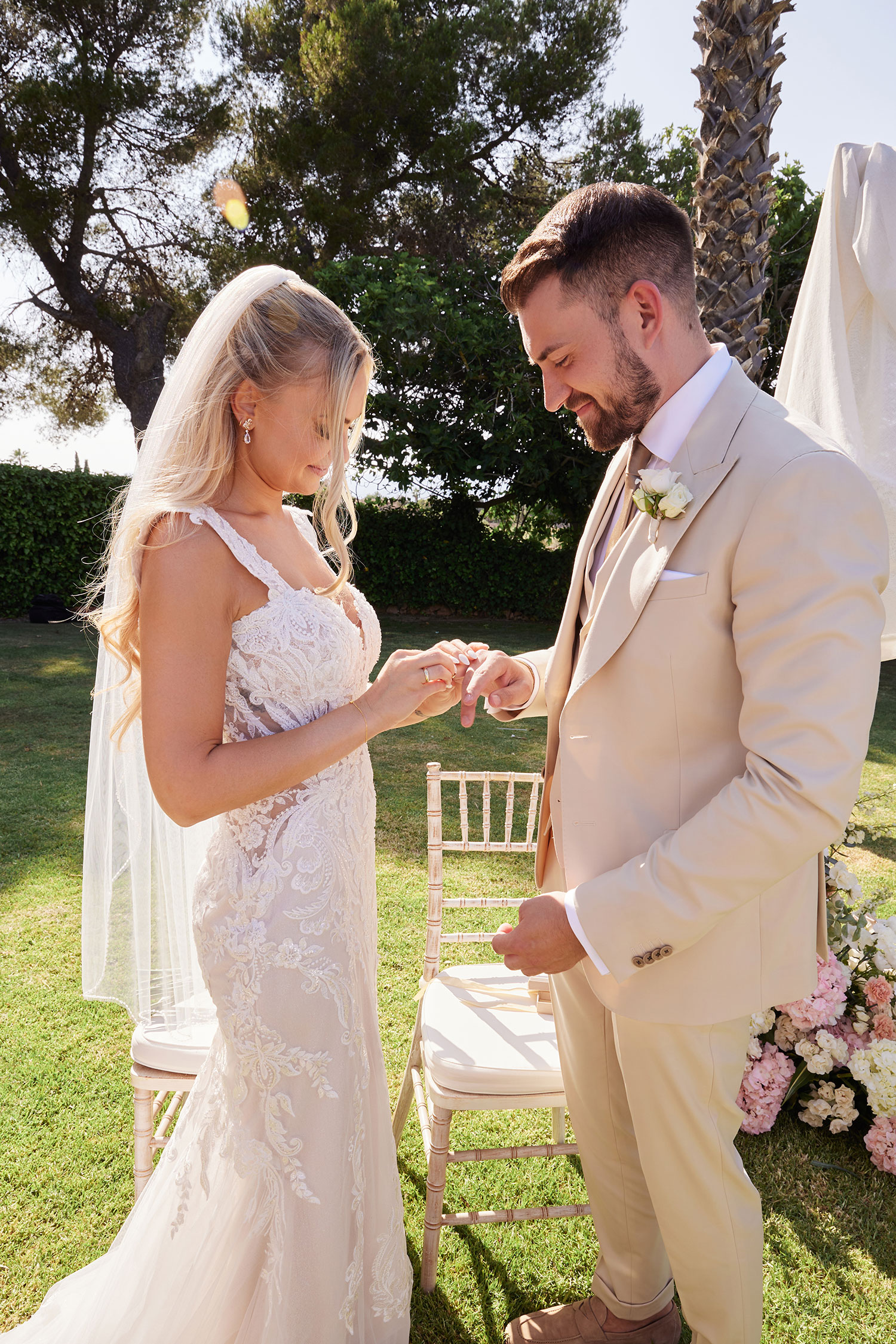 Boda de lujo en Santa Eulalia, donde una hermosa pareja intercambió votos bajo una piedra histórica y la luz dorada de las Islas Baleares: un día envuelto en elegancia, romance y encanto atemporal.
