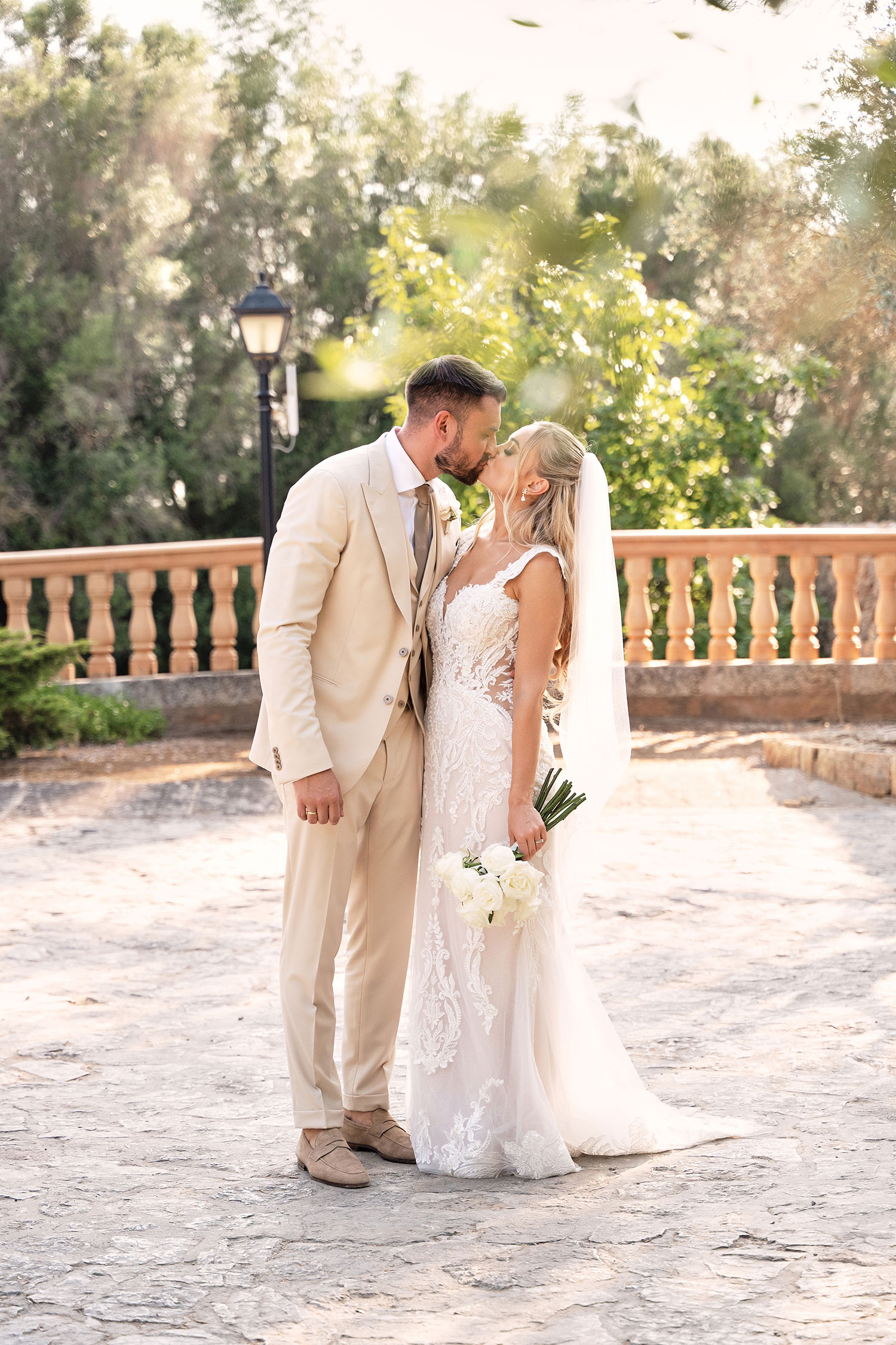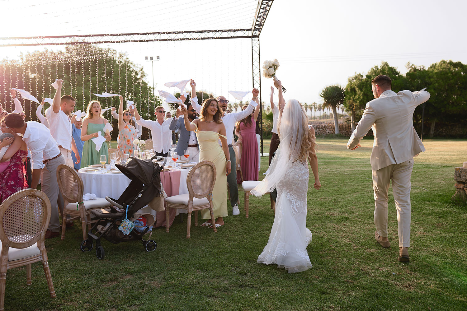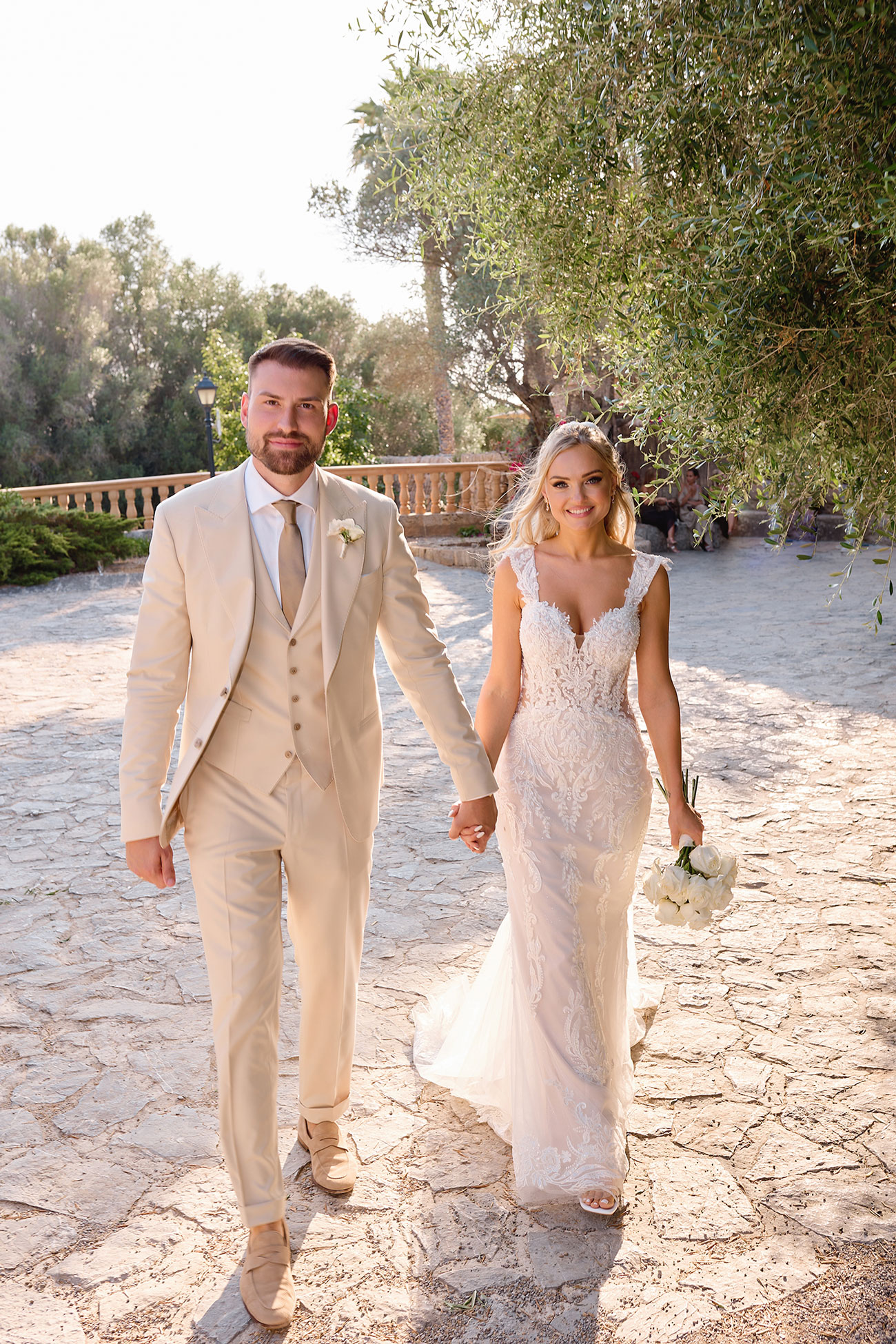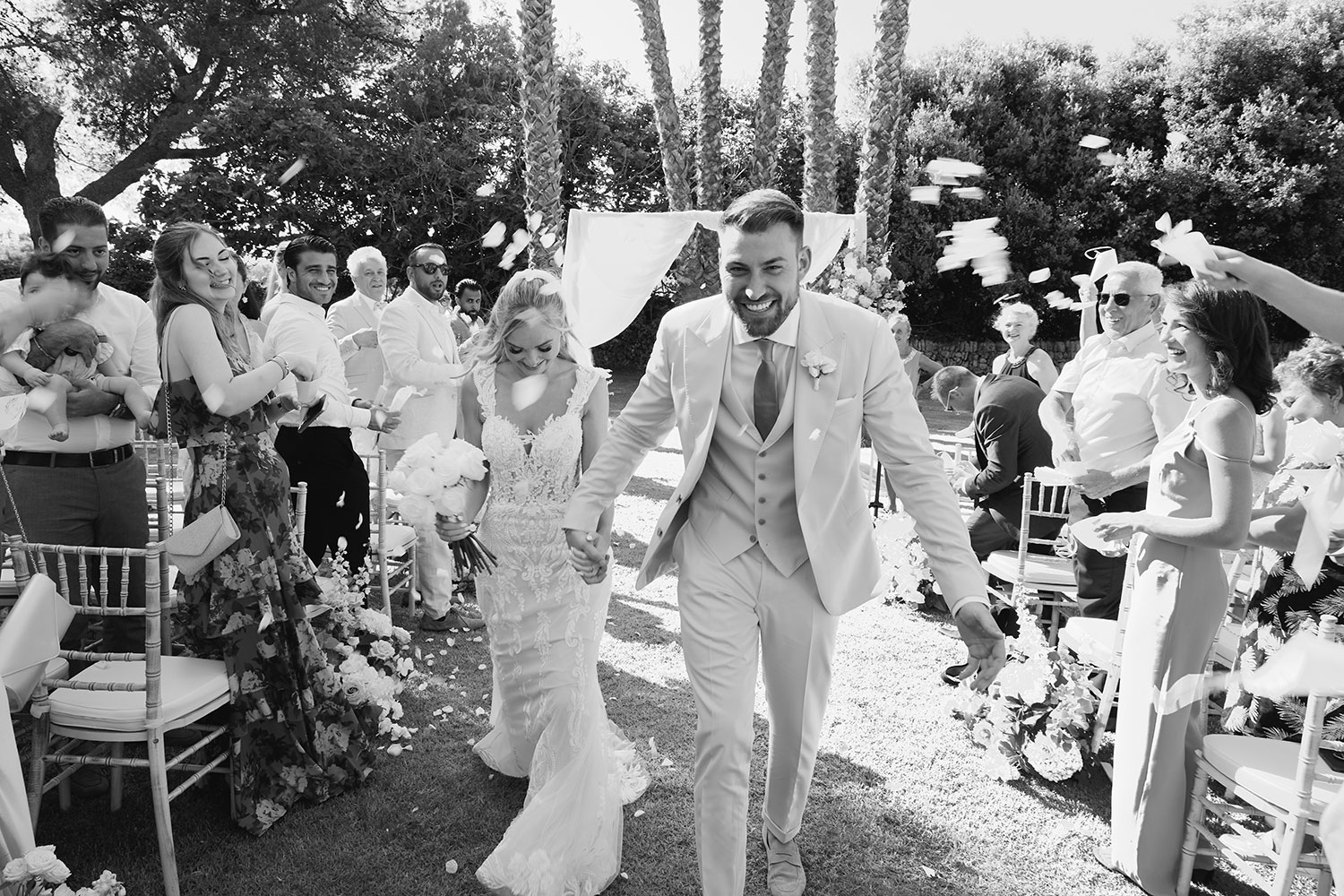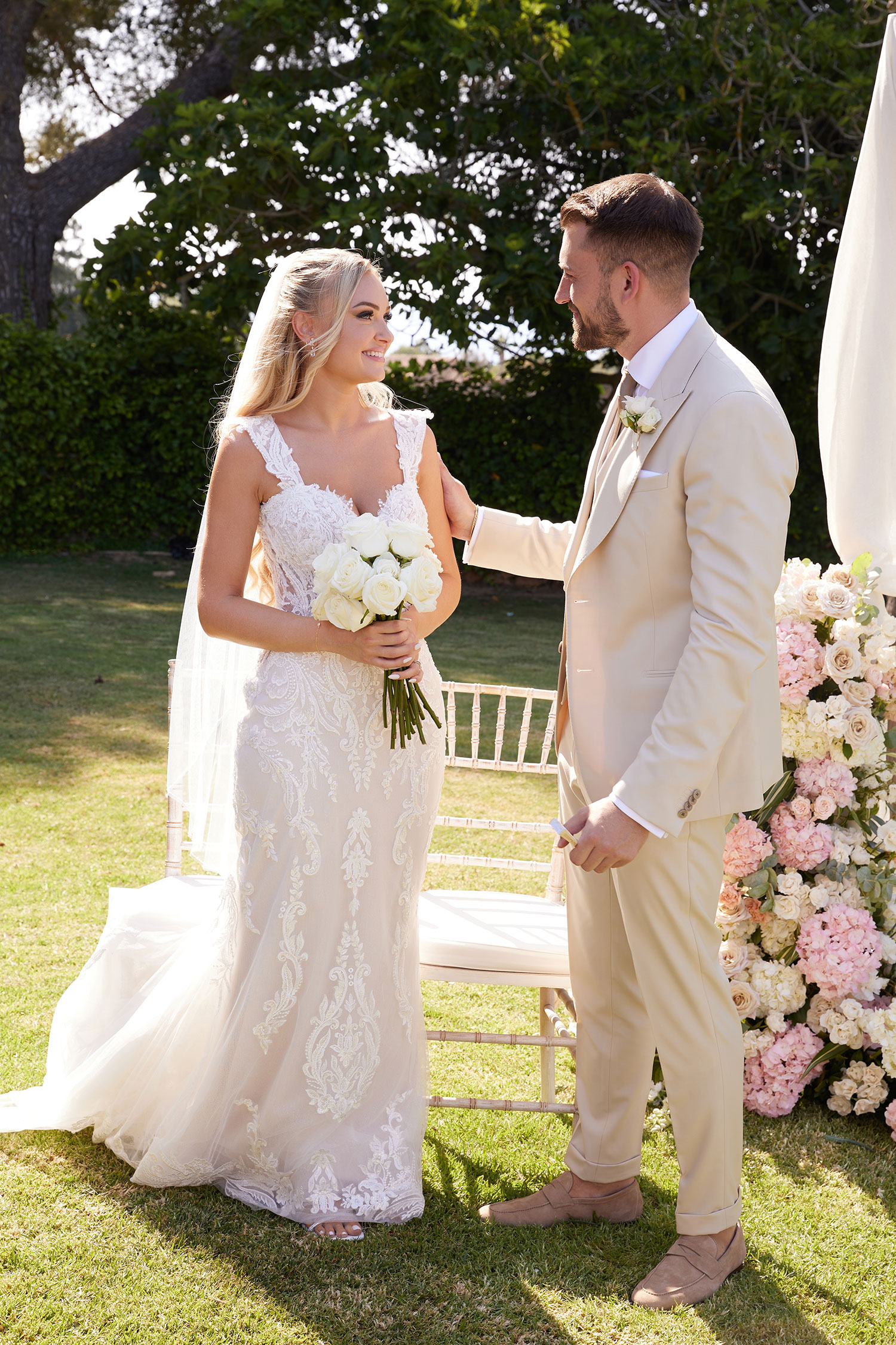 Boda de lujo en Santa Eulalia, donde una hermosa pareja intercambió votos bajo una piedra histórica y la luz dorada de las Islas Baleares: un día envuelto en elegancia, romance y encanto atemporal.