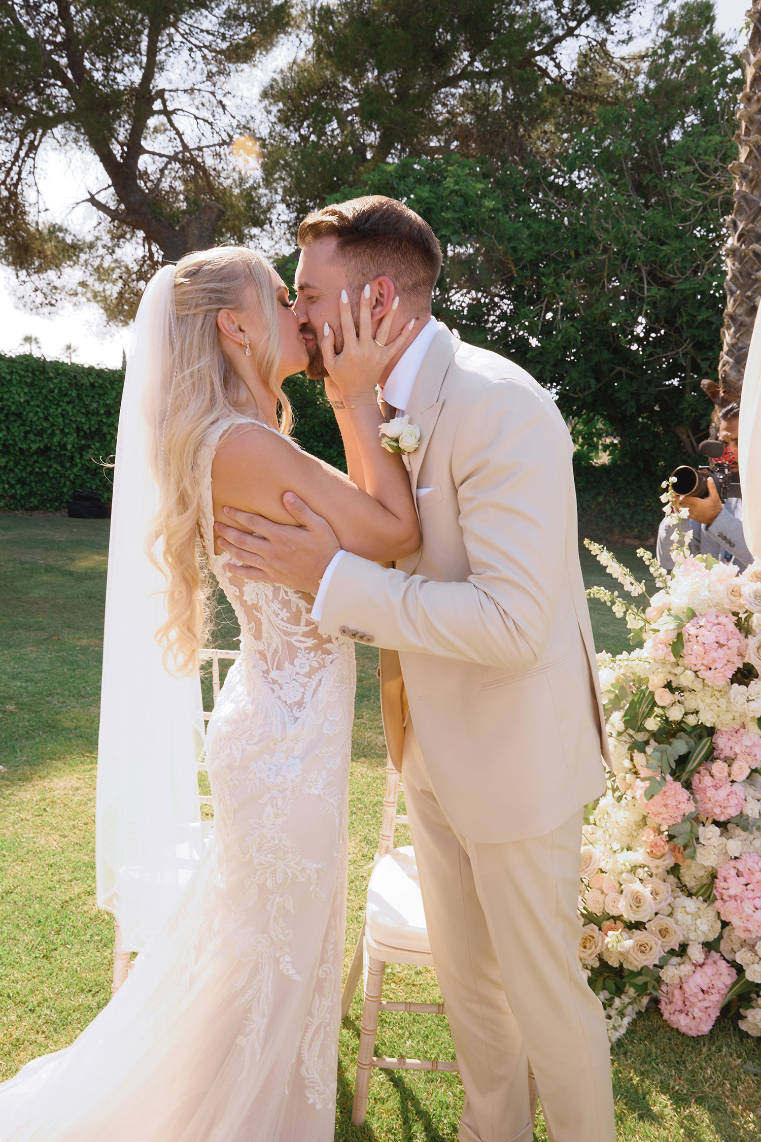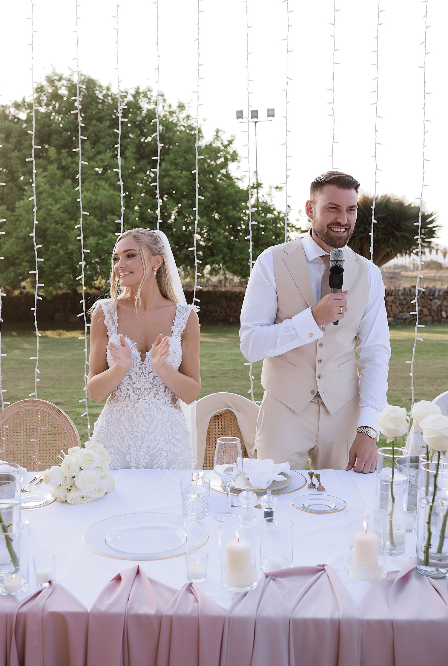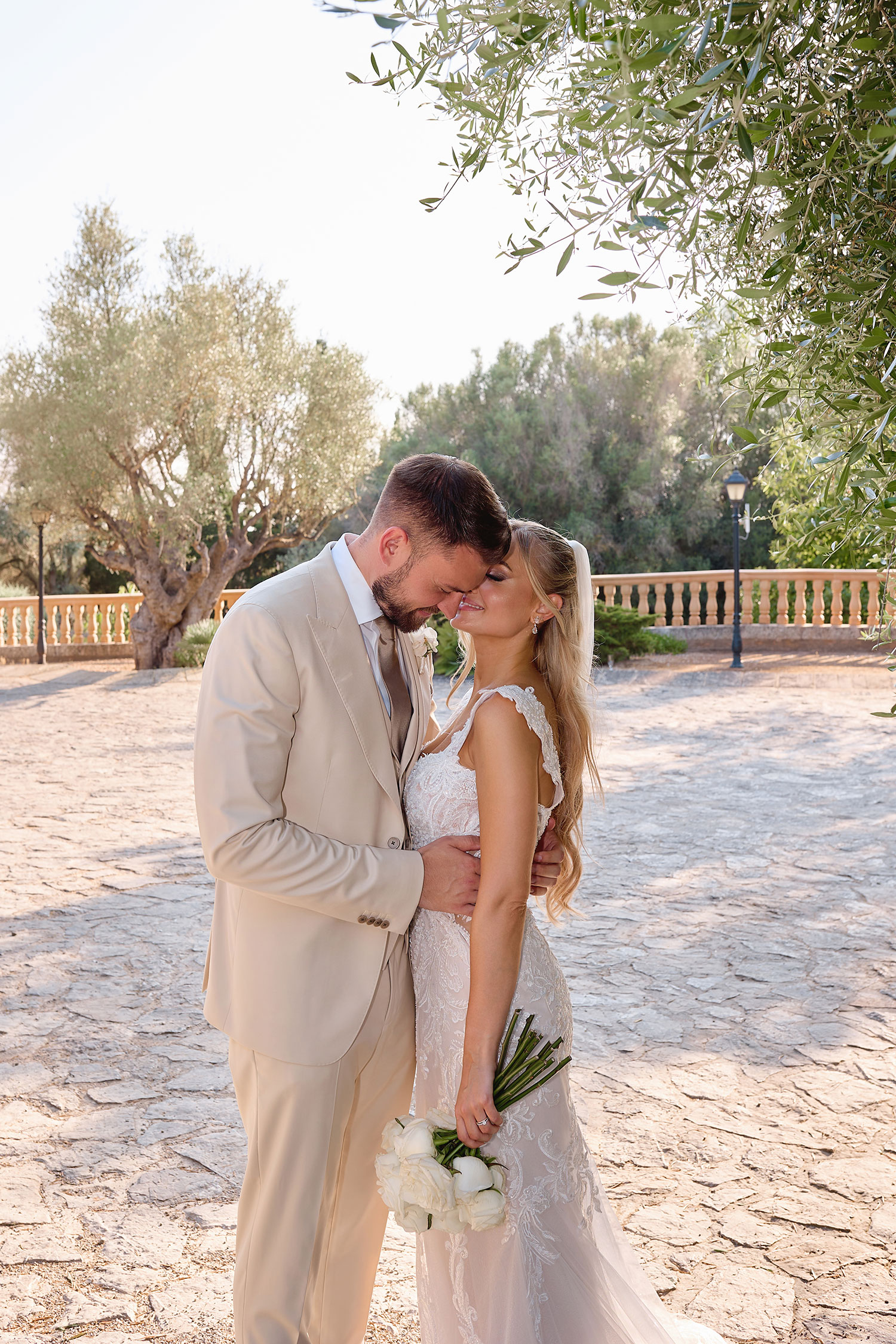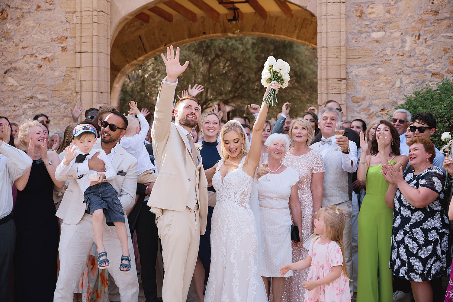 Boda de lujo en Santa Eulalia, donde una hermosa pareja intercambió votos bajo una piedra histórica y la luz dorada de las Islas Baleares: un día envuelto en elegancia, romance y encanto atemporal.