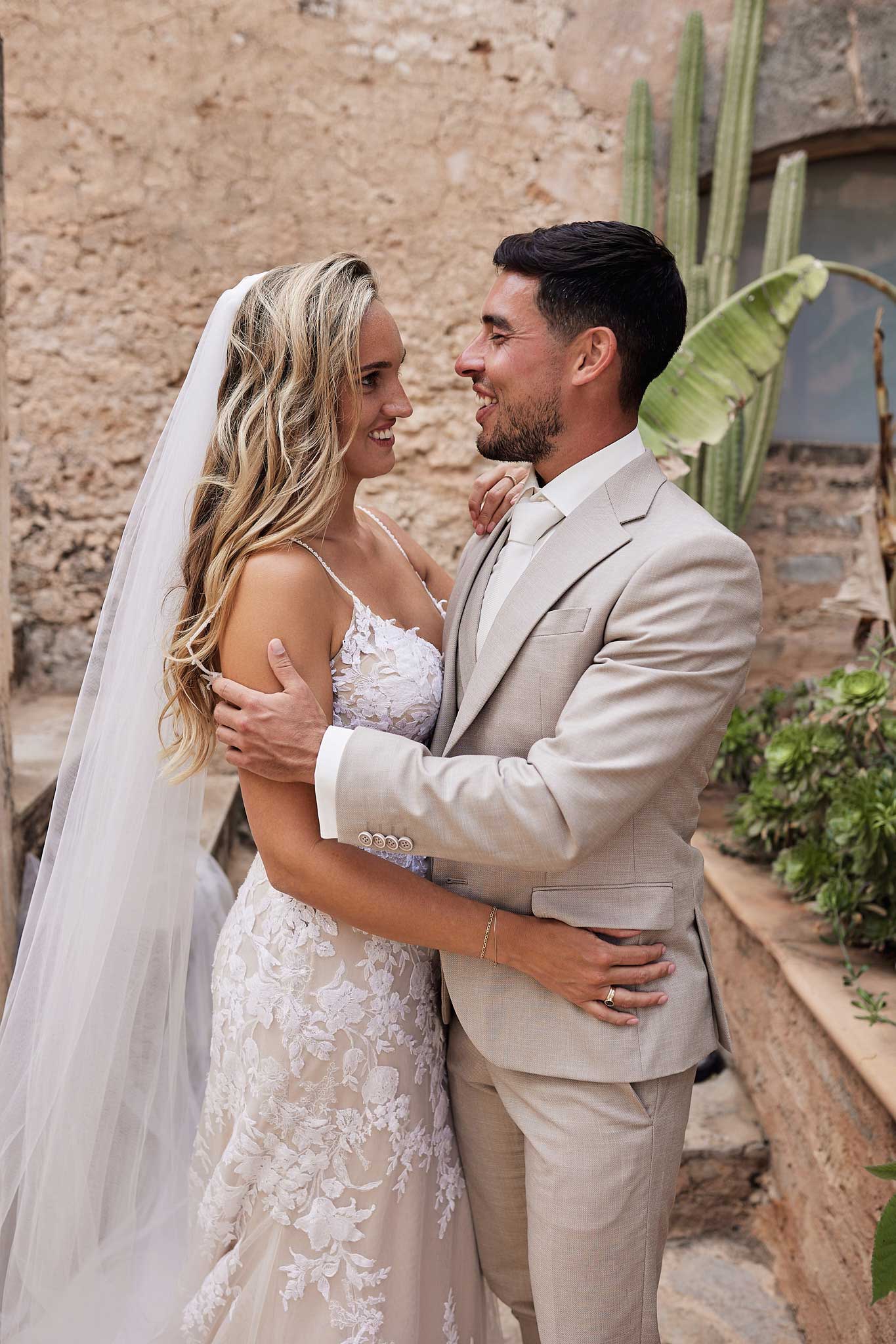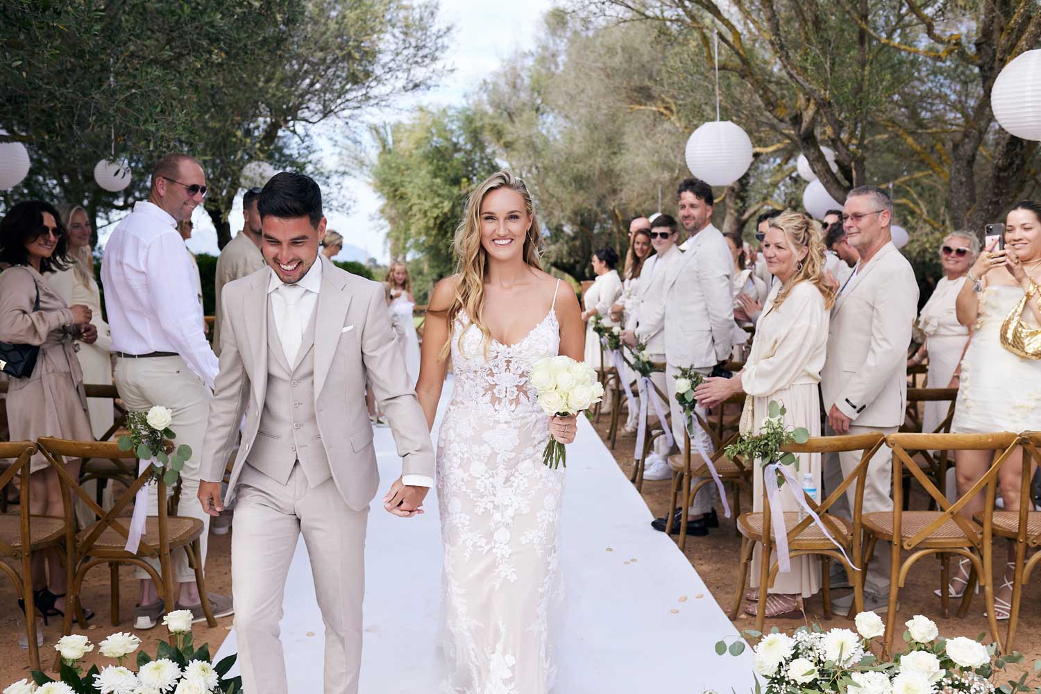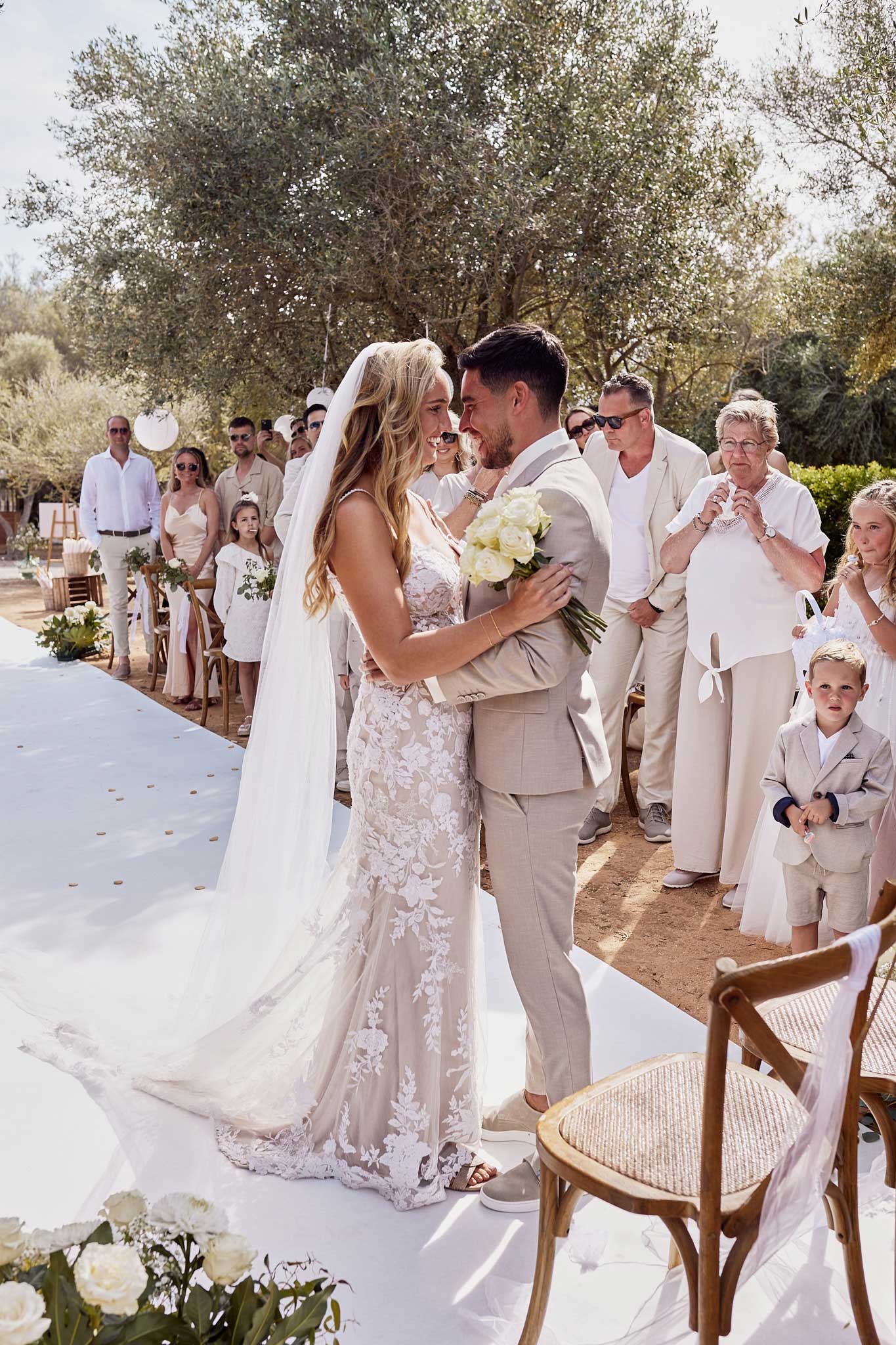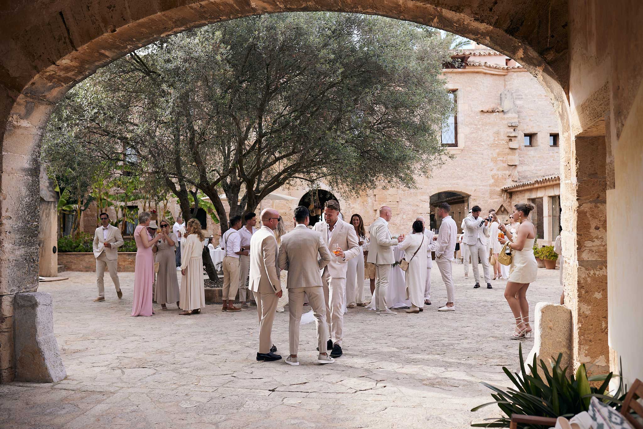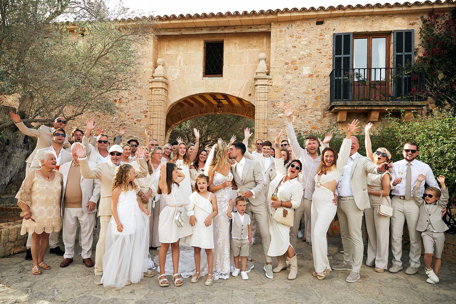La hermosa boda de Sabrina y Rico en Casal Santa Eulalia, Mallorca, rodeada de campos dorados, antiguos muros de piedra y el cálido resplandor de un atardecer mediterráneo.