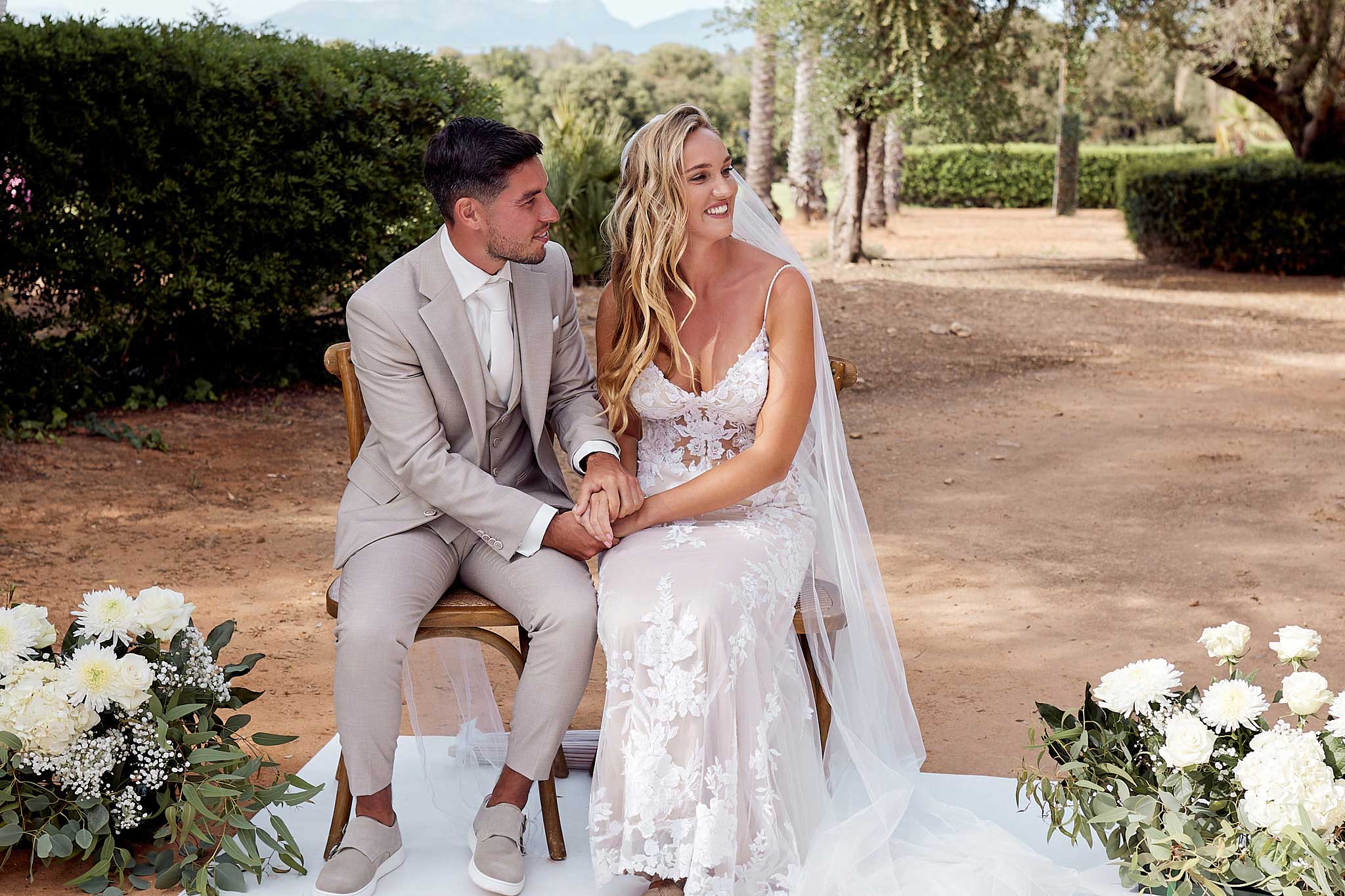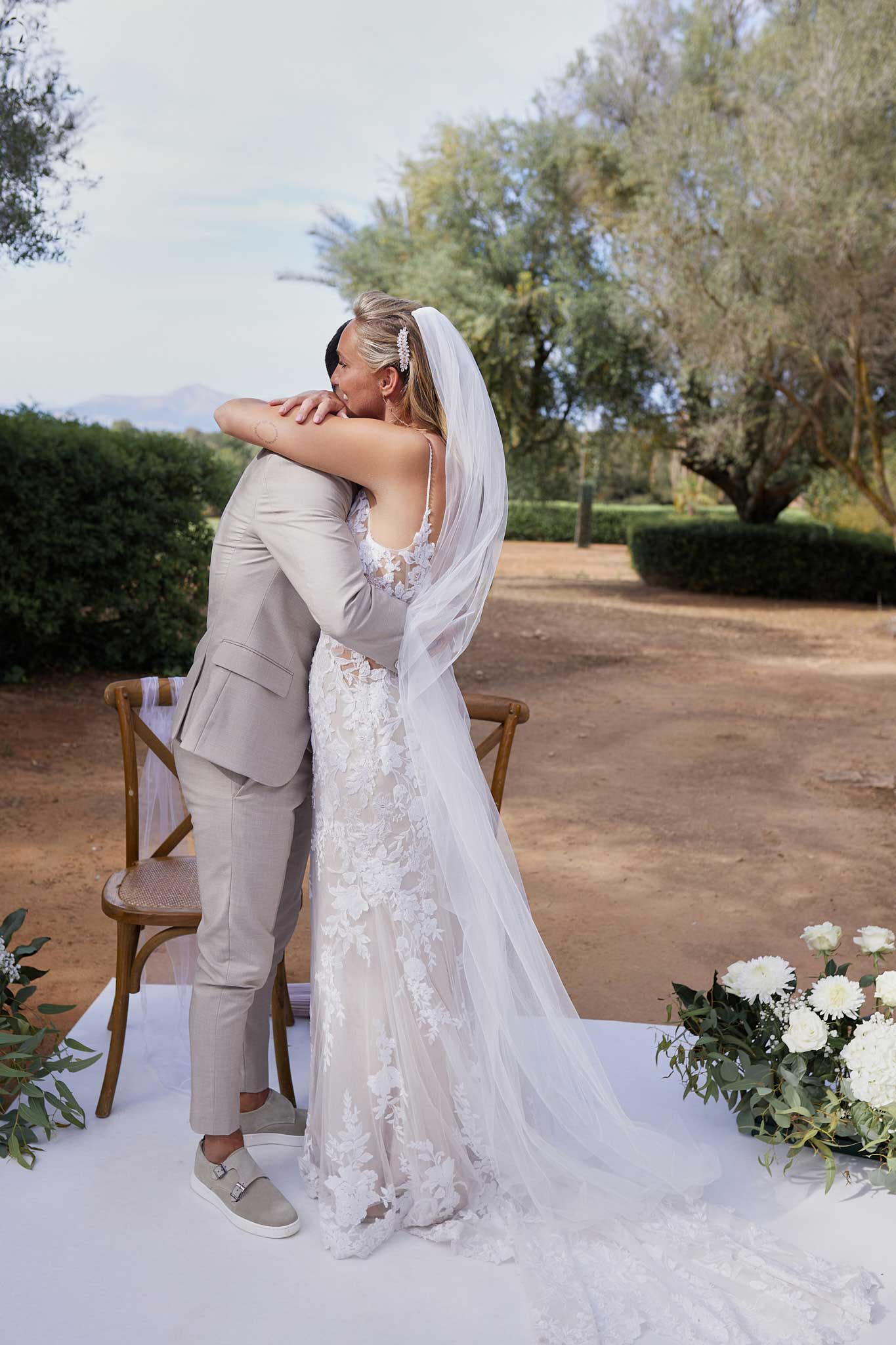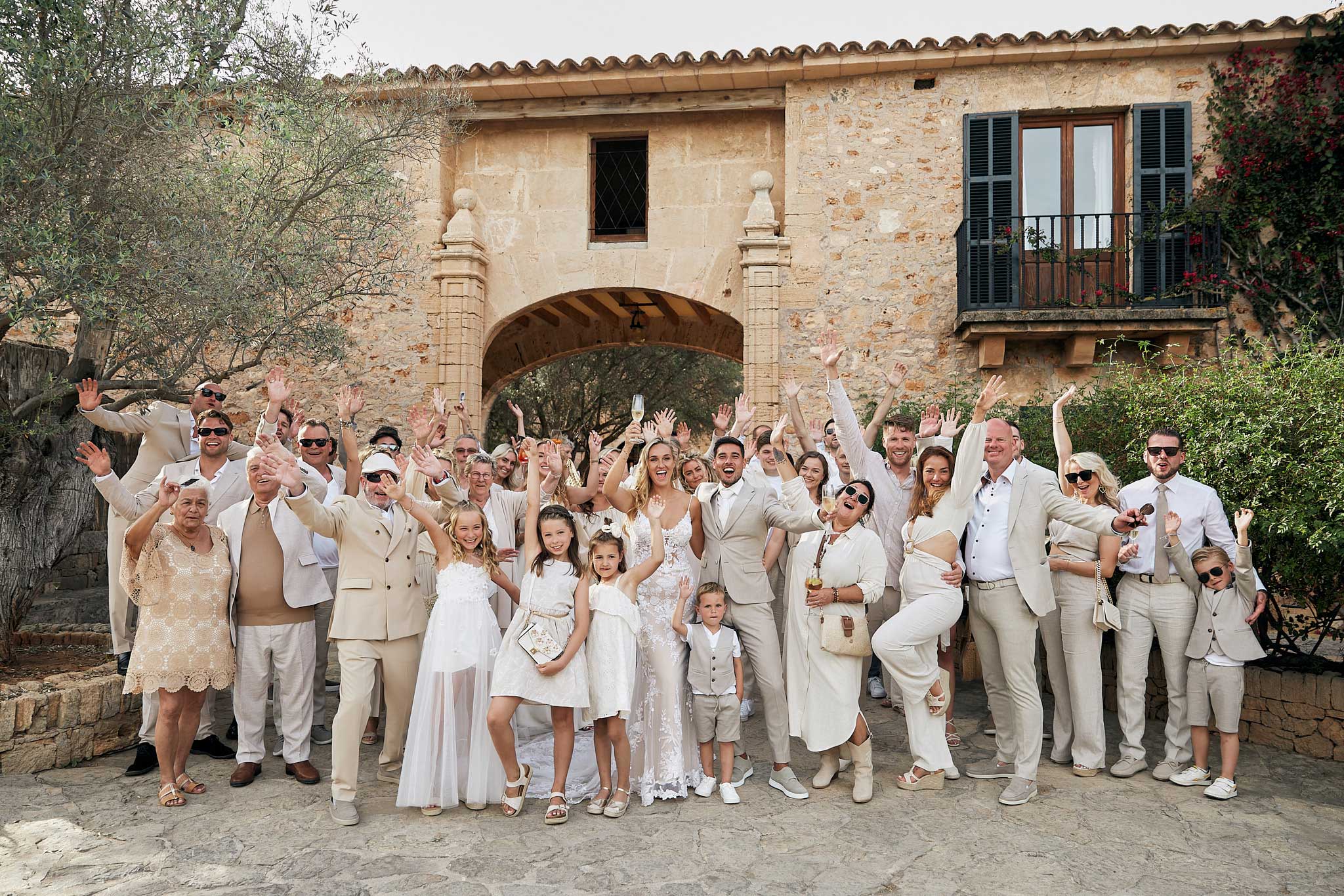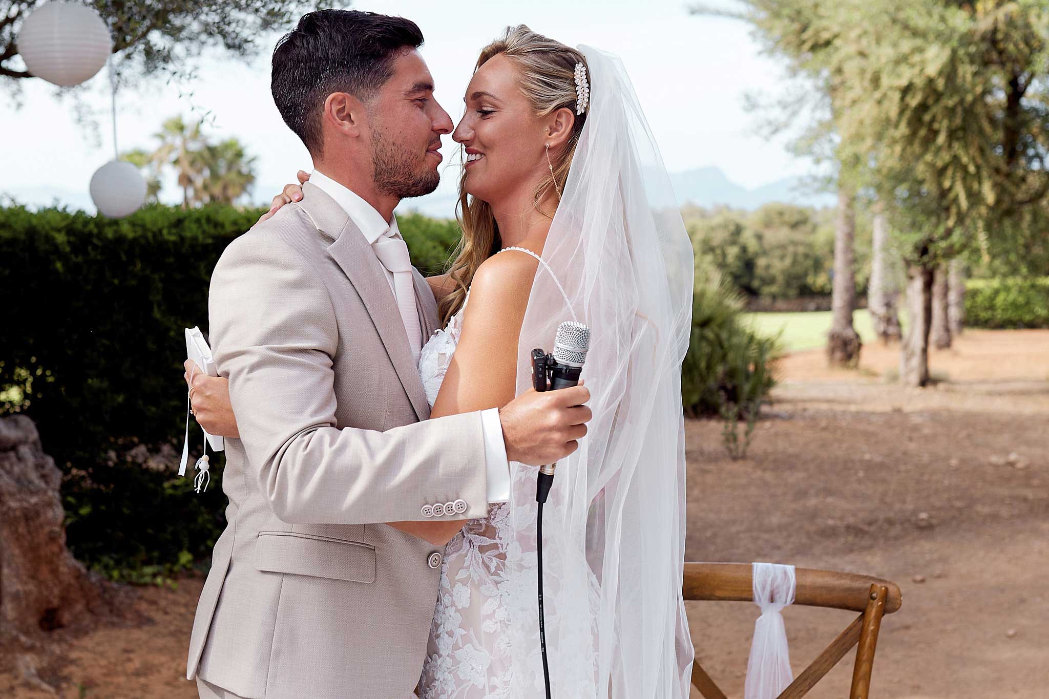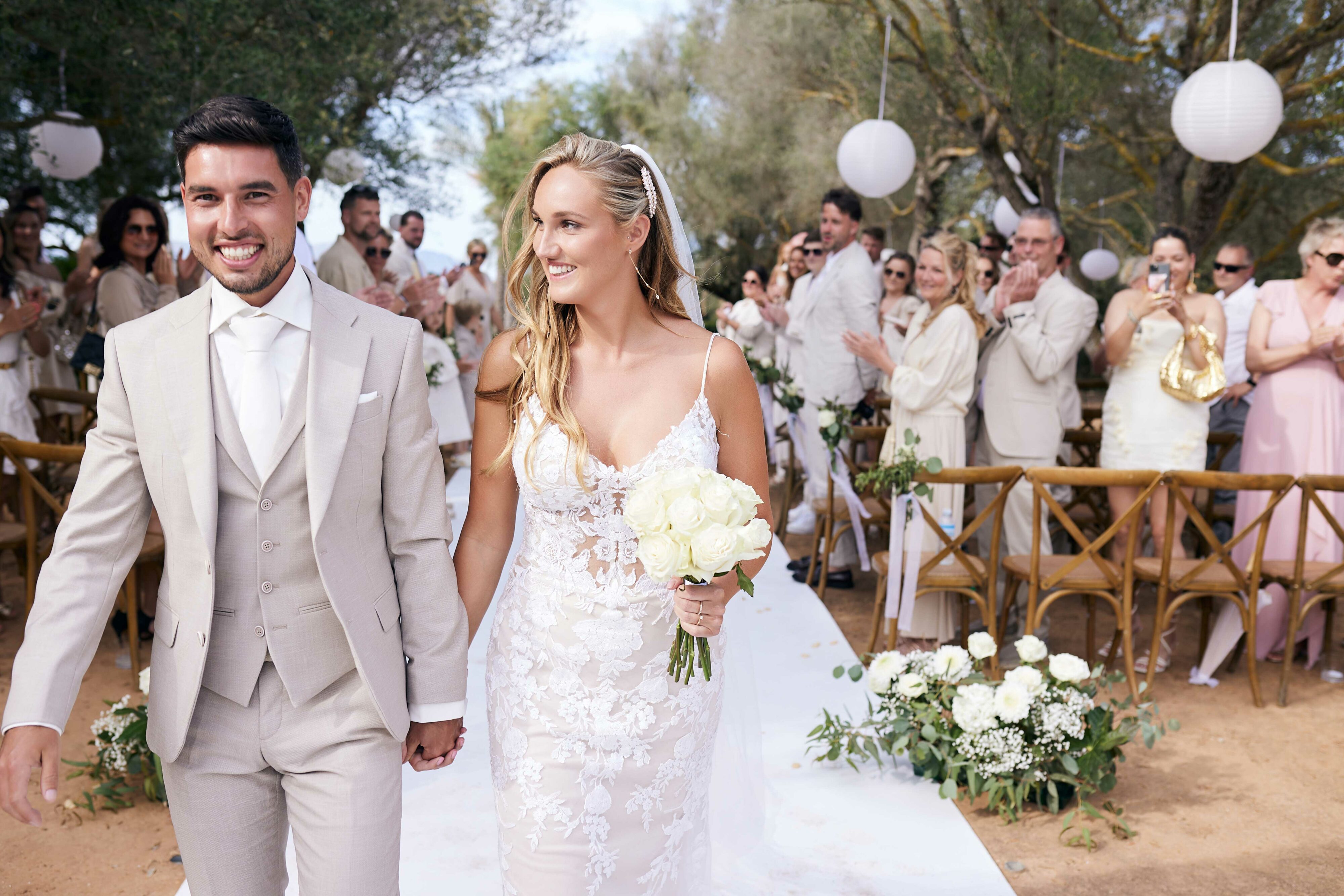 La hermosa boda de Sabrina y Rico en Casal Santa Eulalia, Mallorca, rodeada de campos dorados, antiguos muros de piedra y el cálido resplandor de un atardecer mediterráneo.