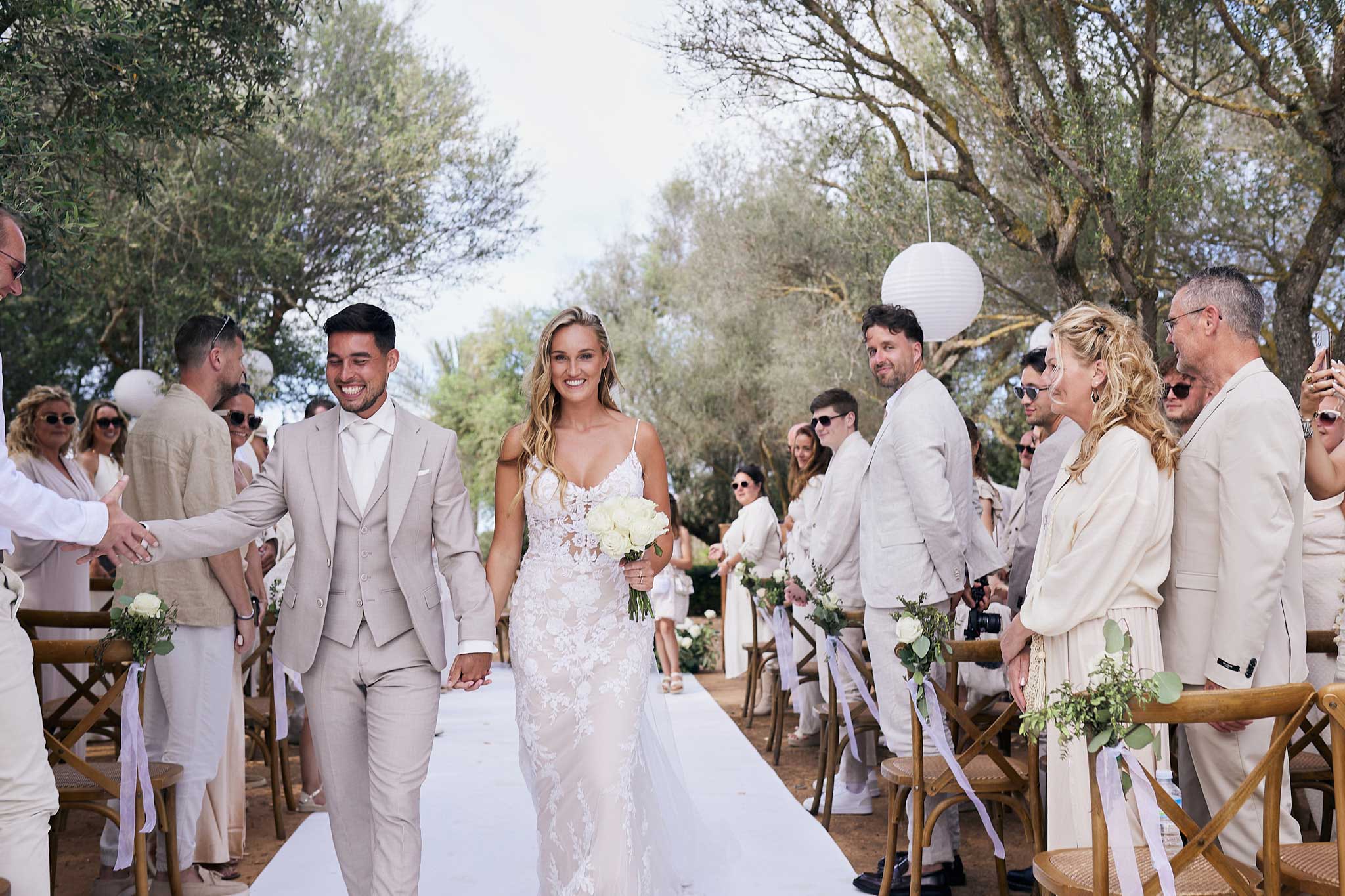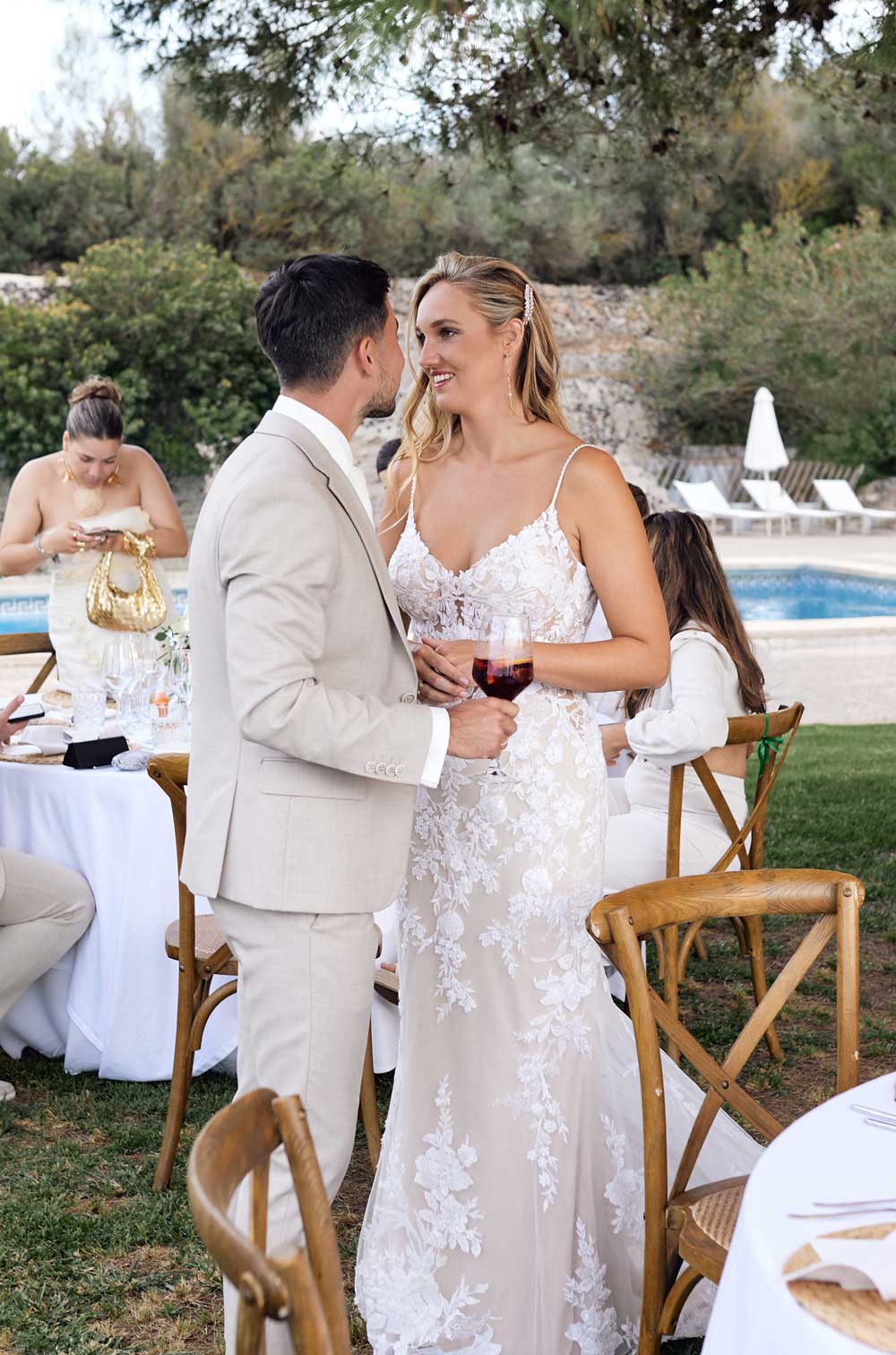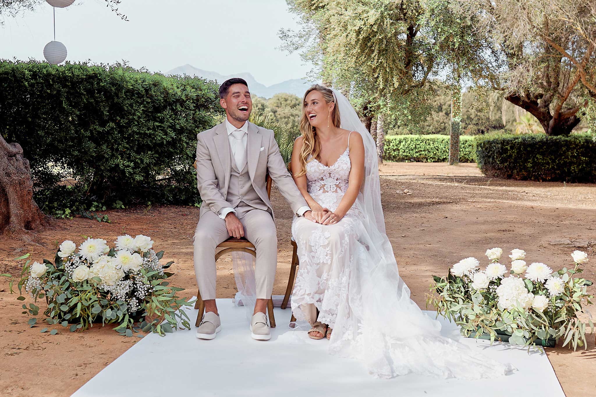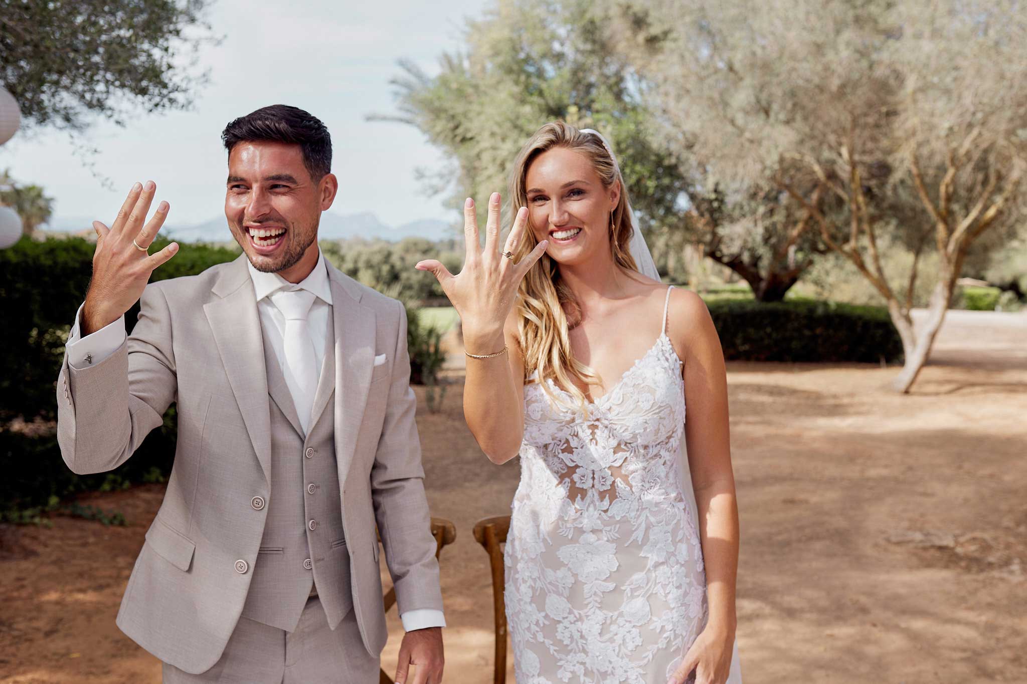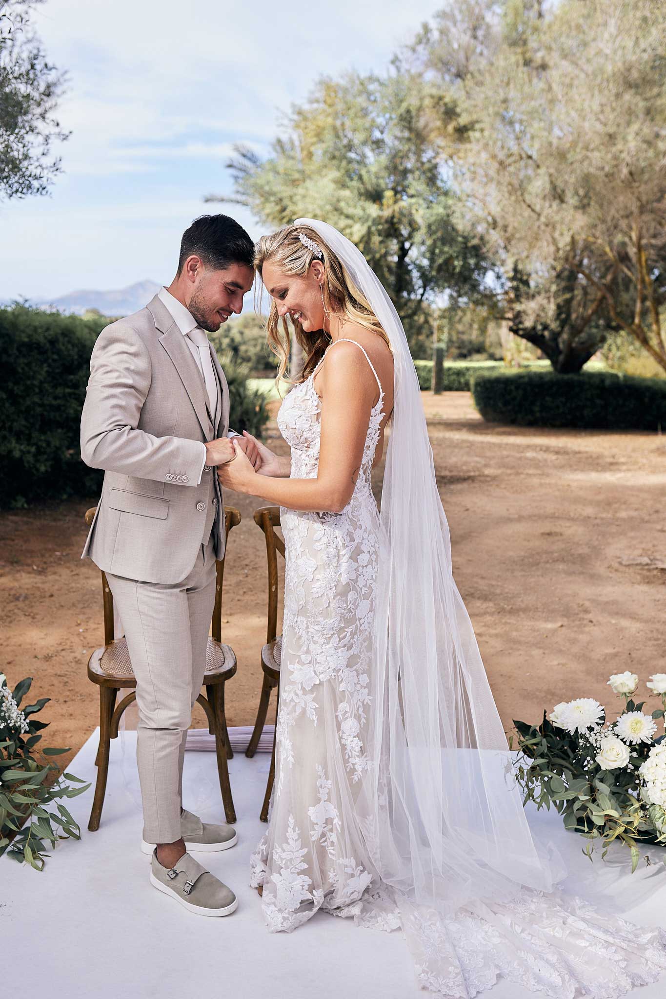 La hermosa boda de Sabrina y Rico en Casal Santa Eulalia, Mallorca, rodeada de campos dorados, antiguos muros de piedra y el cálido resplandor de un atardecer mediterráneo.