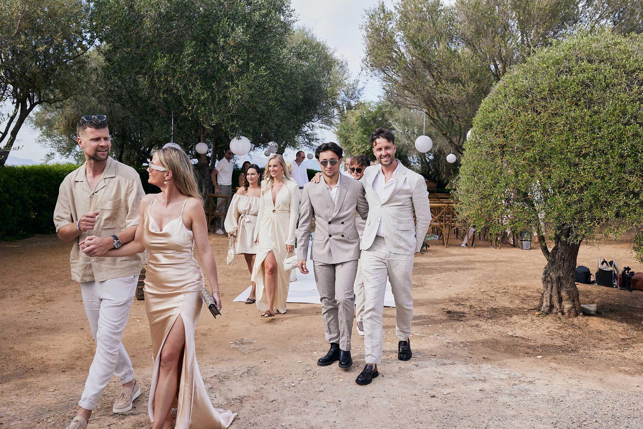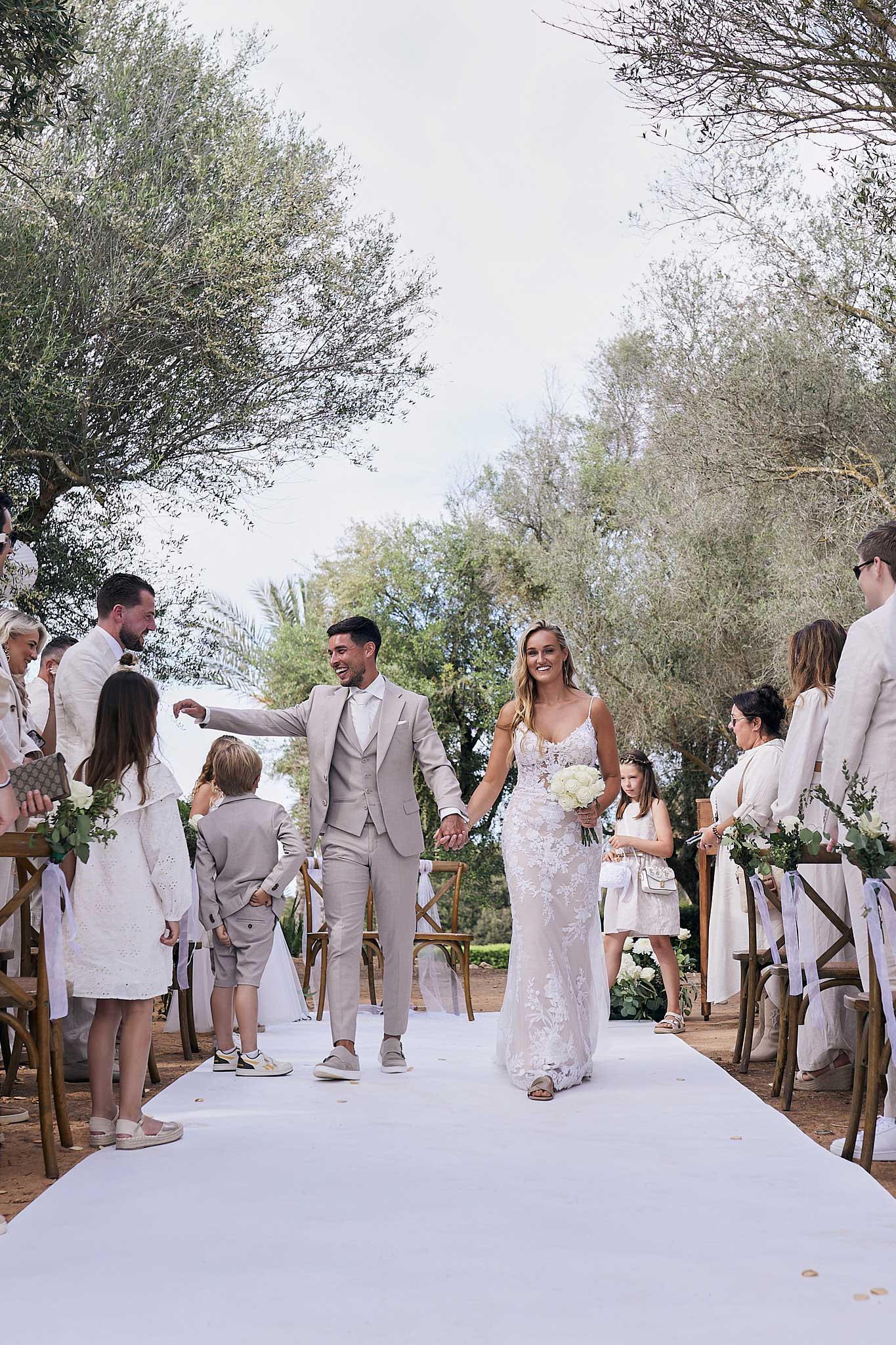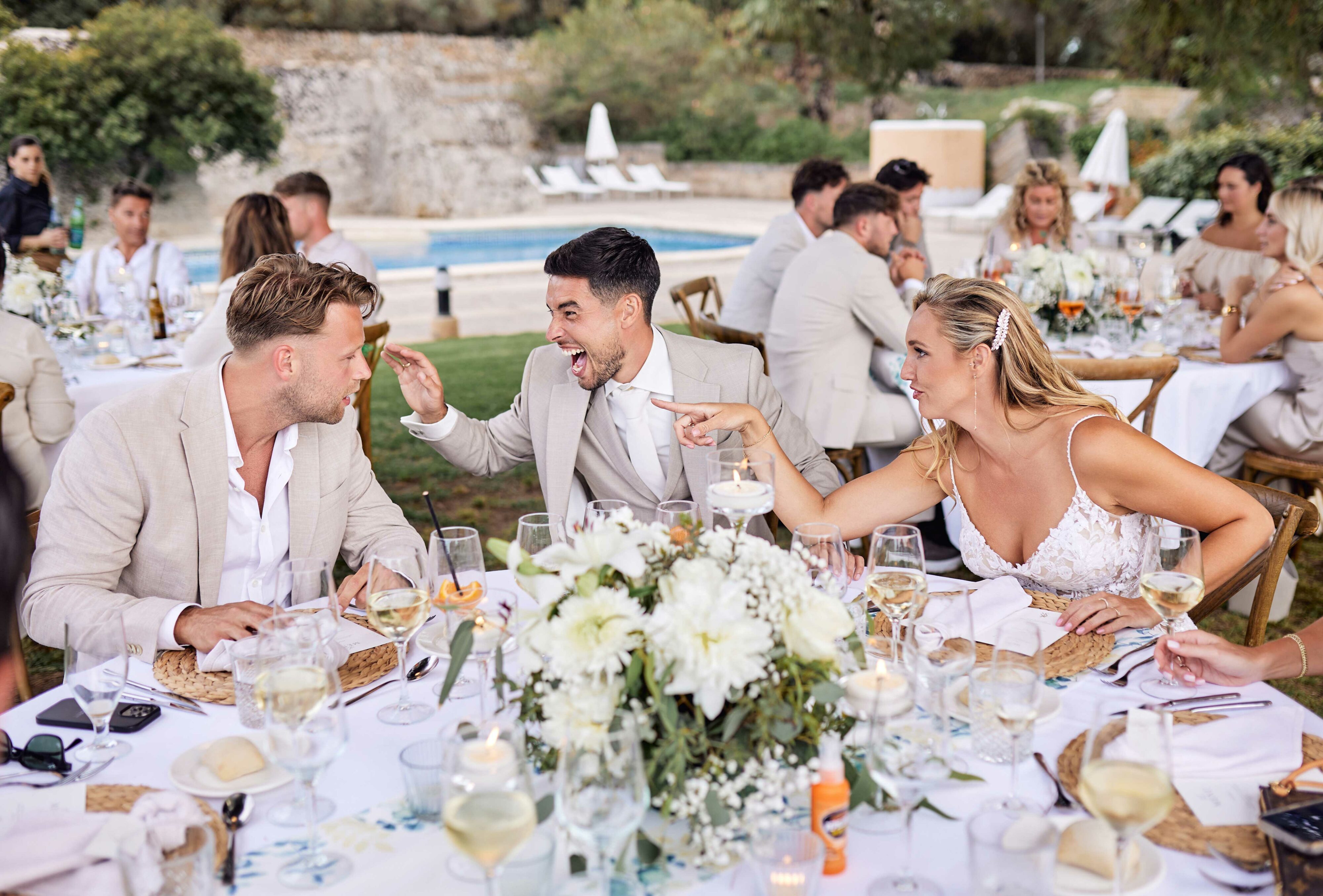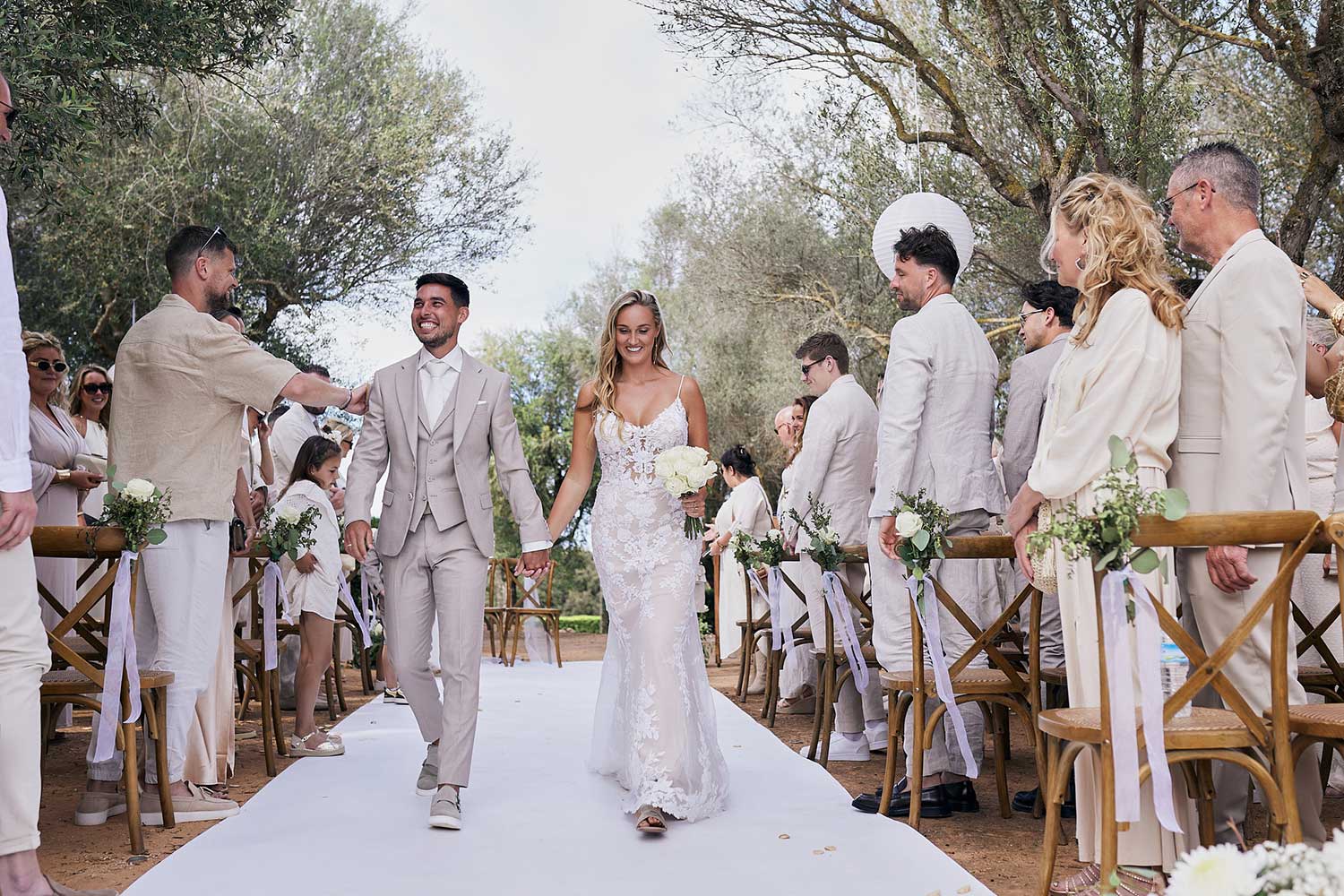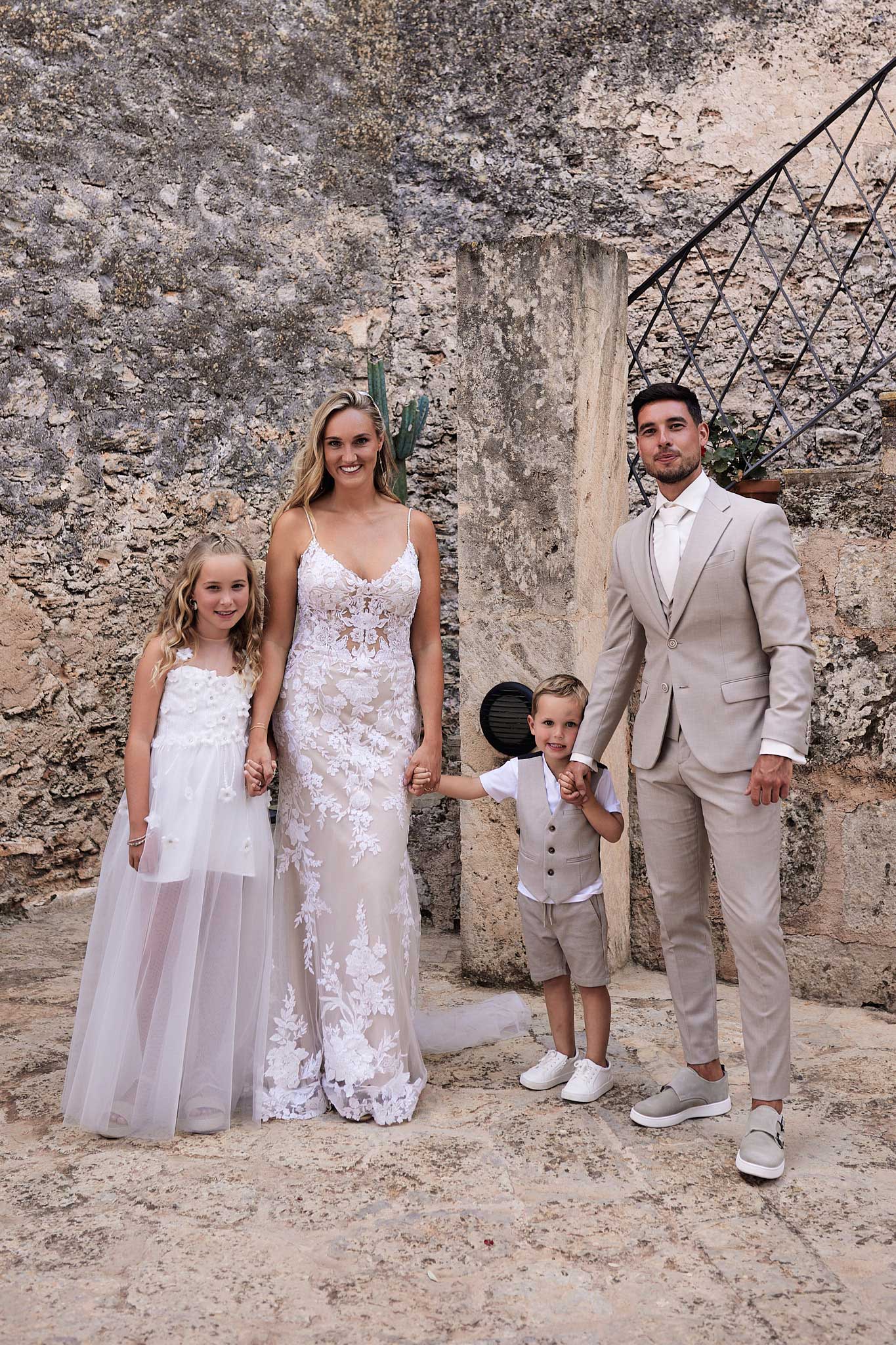 La hermosa boda de Sabrina y Rico en Casal Santa Eulalia, Mallorca, rodeada de campos dorados, antiguos muros de piedra y el cálido resplandor de un atardecer mediterráneo.