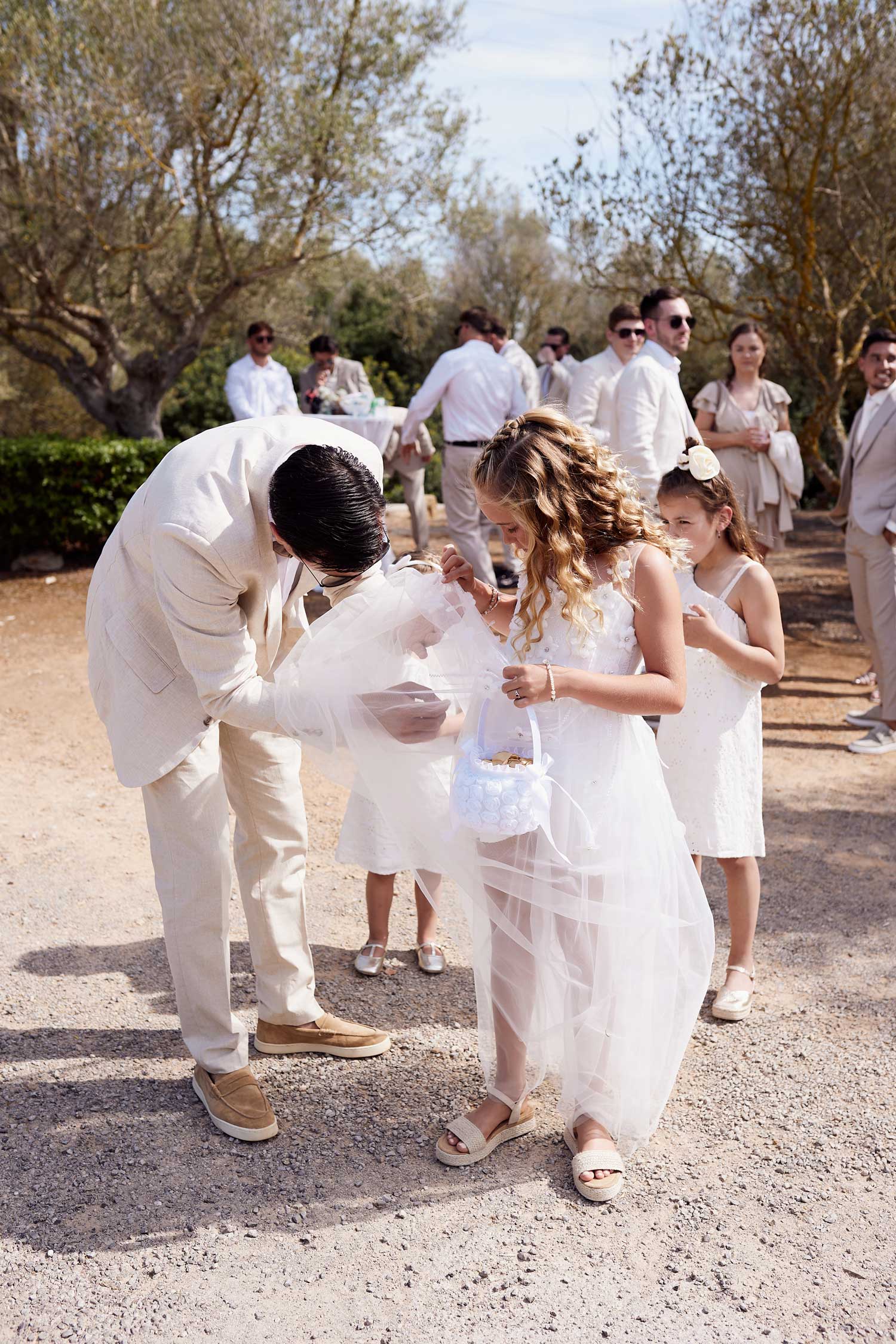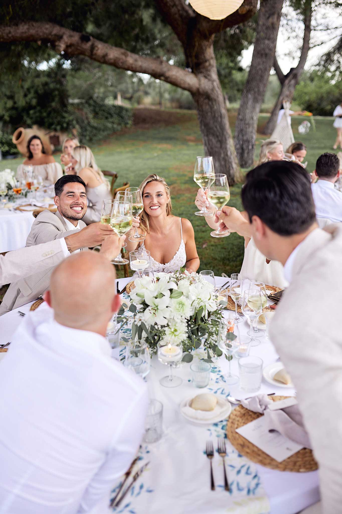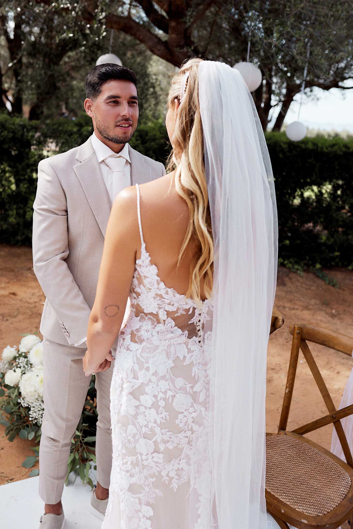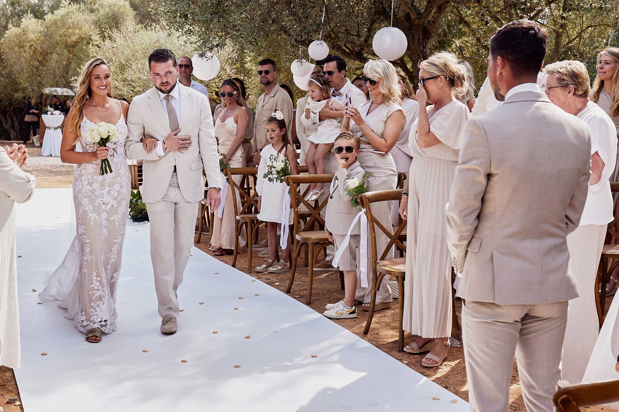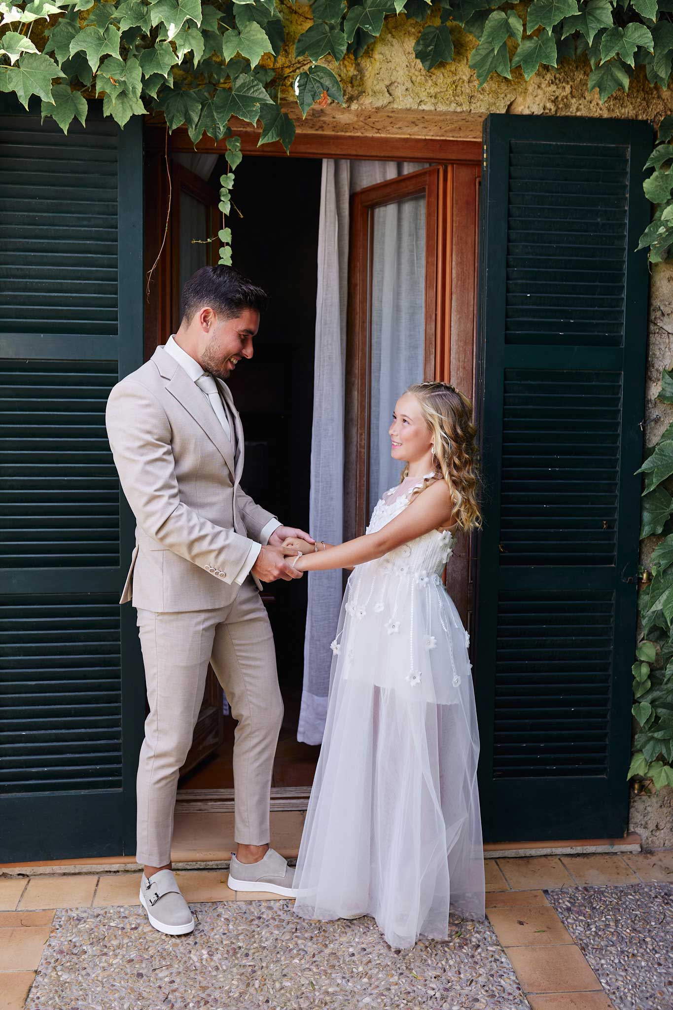 La hermosa boda de Sabrina y Rico en Casal Santa Eulalia, Mallorca, rodeada de campos dorados, antiguos muros de piedra y el cálido resplandor de un atardecer mediterráneo.