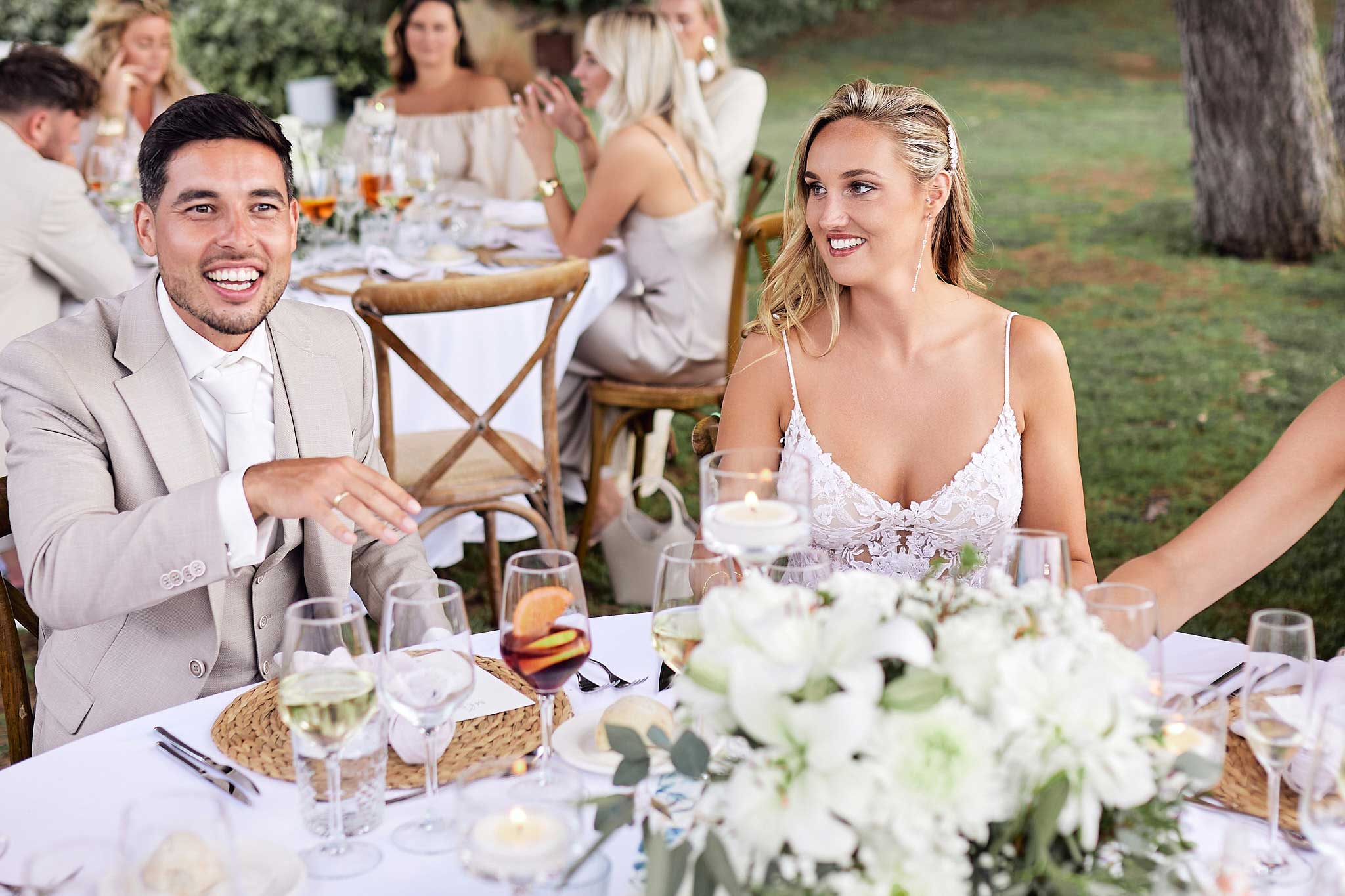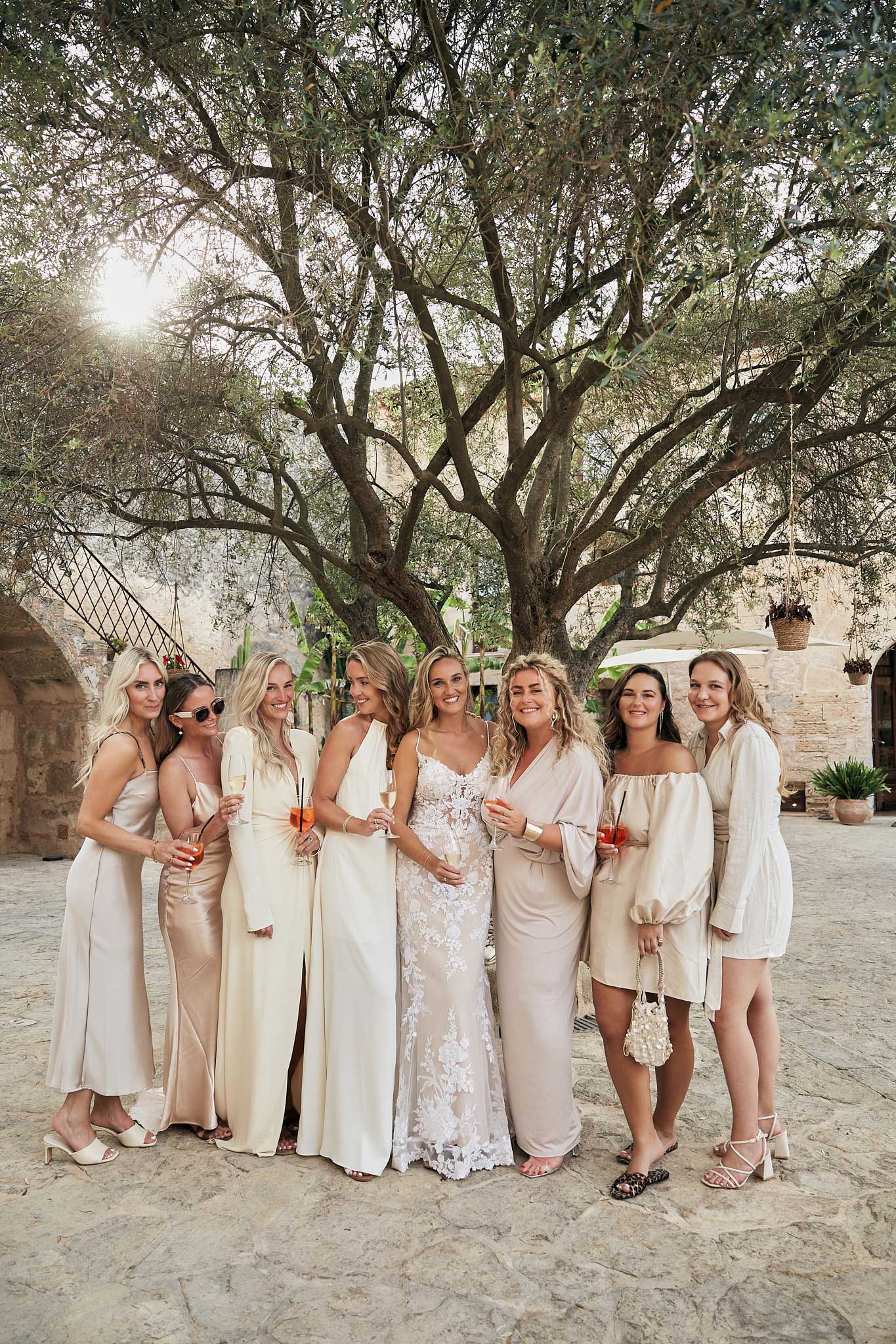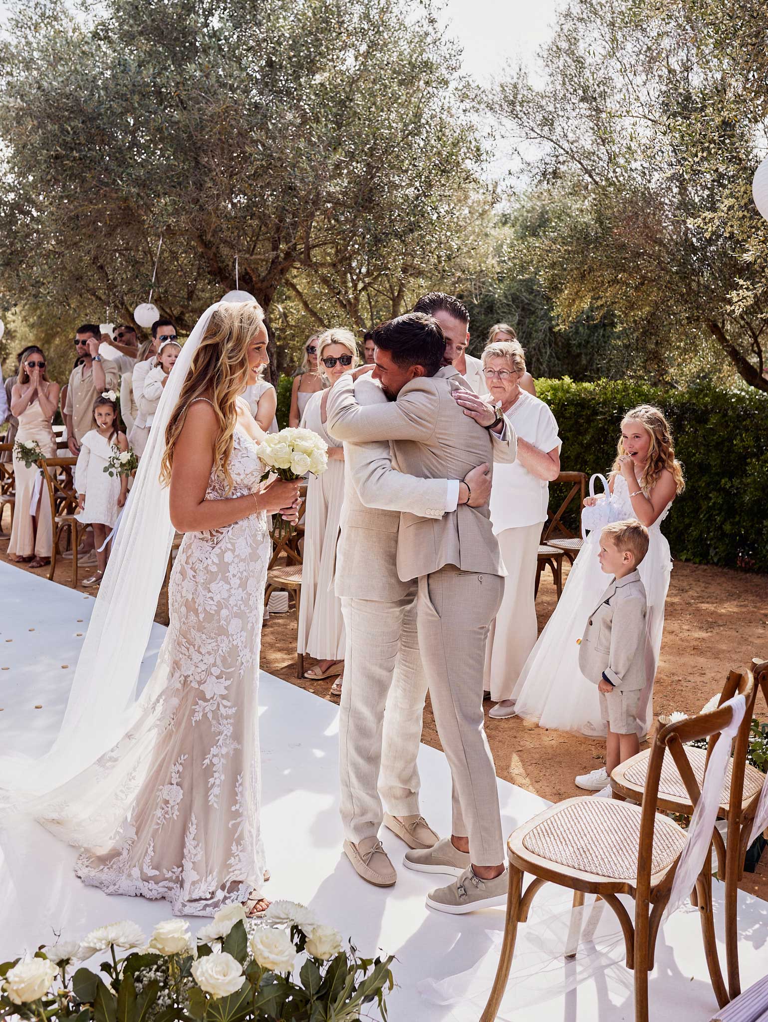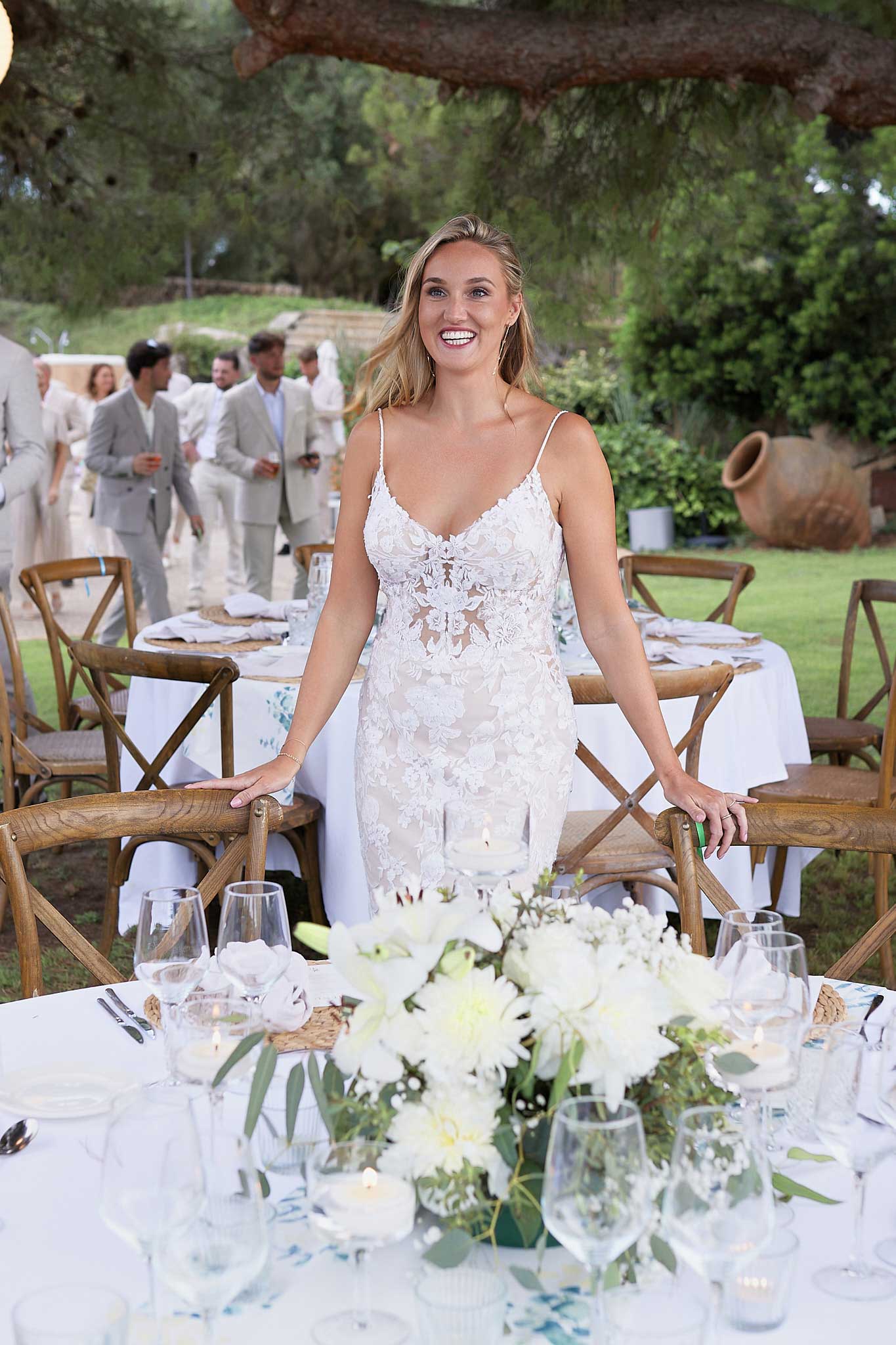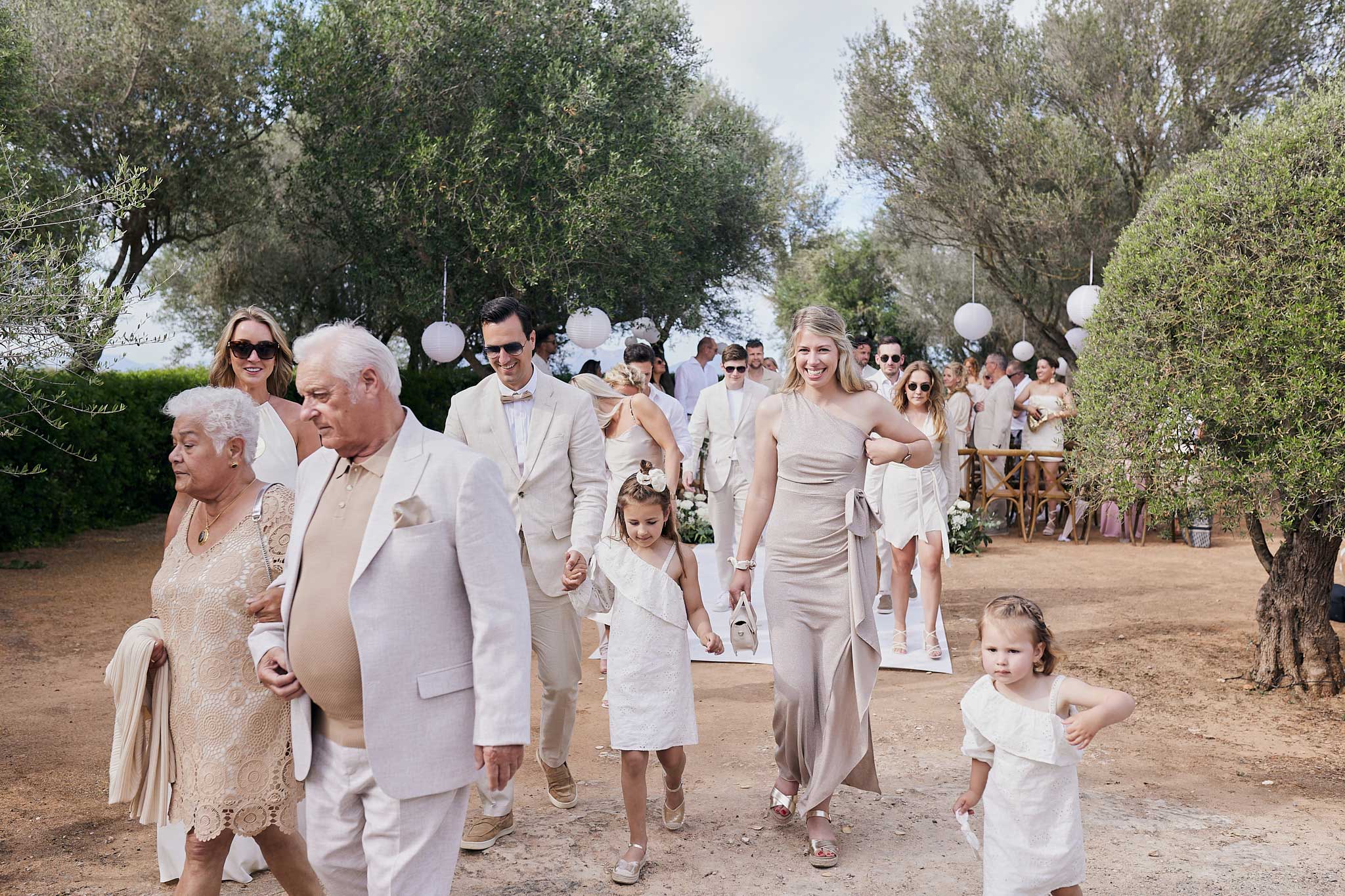 La hermosa boda de Sabrina y Rico en Casal Santa Eulalia, Mallorca, rodeada de campos dorados, antiguos muros de piedra y el cálido resplandor de un atardecer mediterráneo.