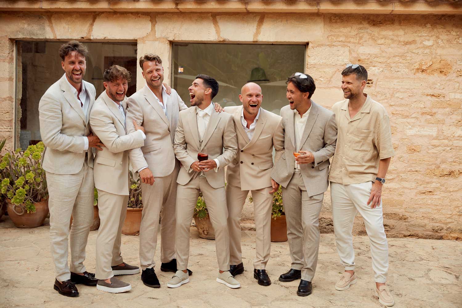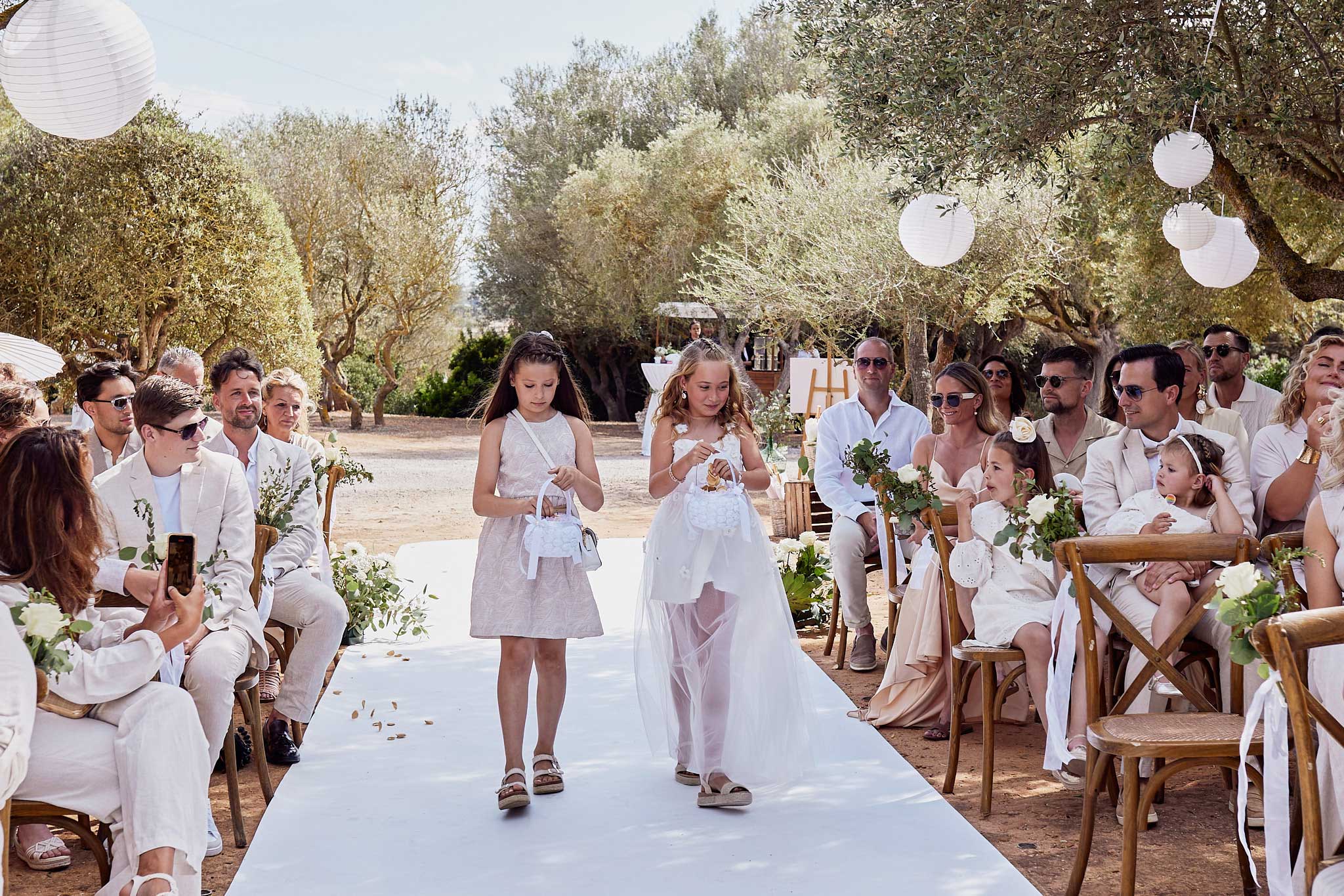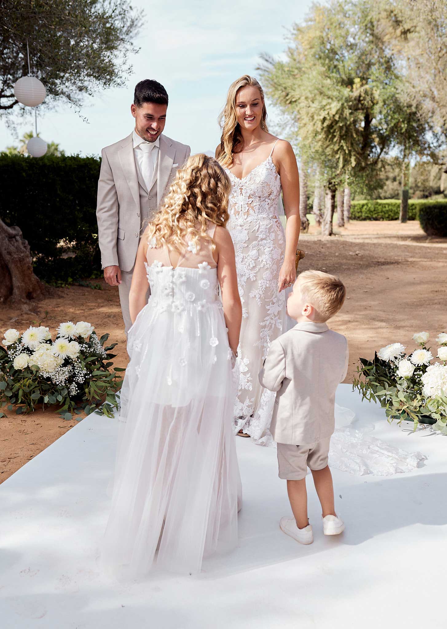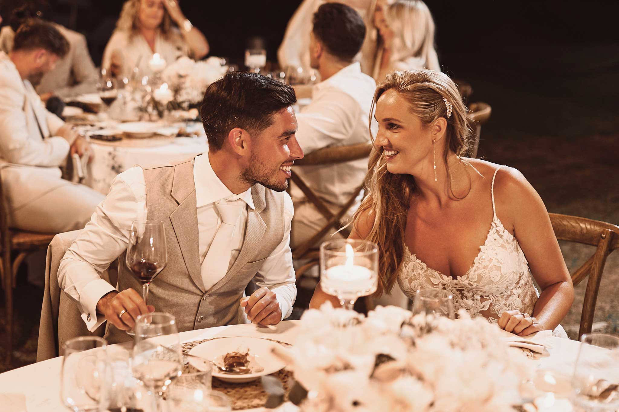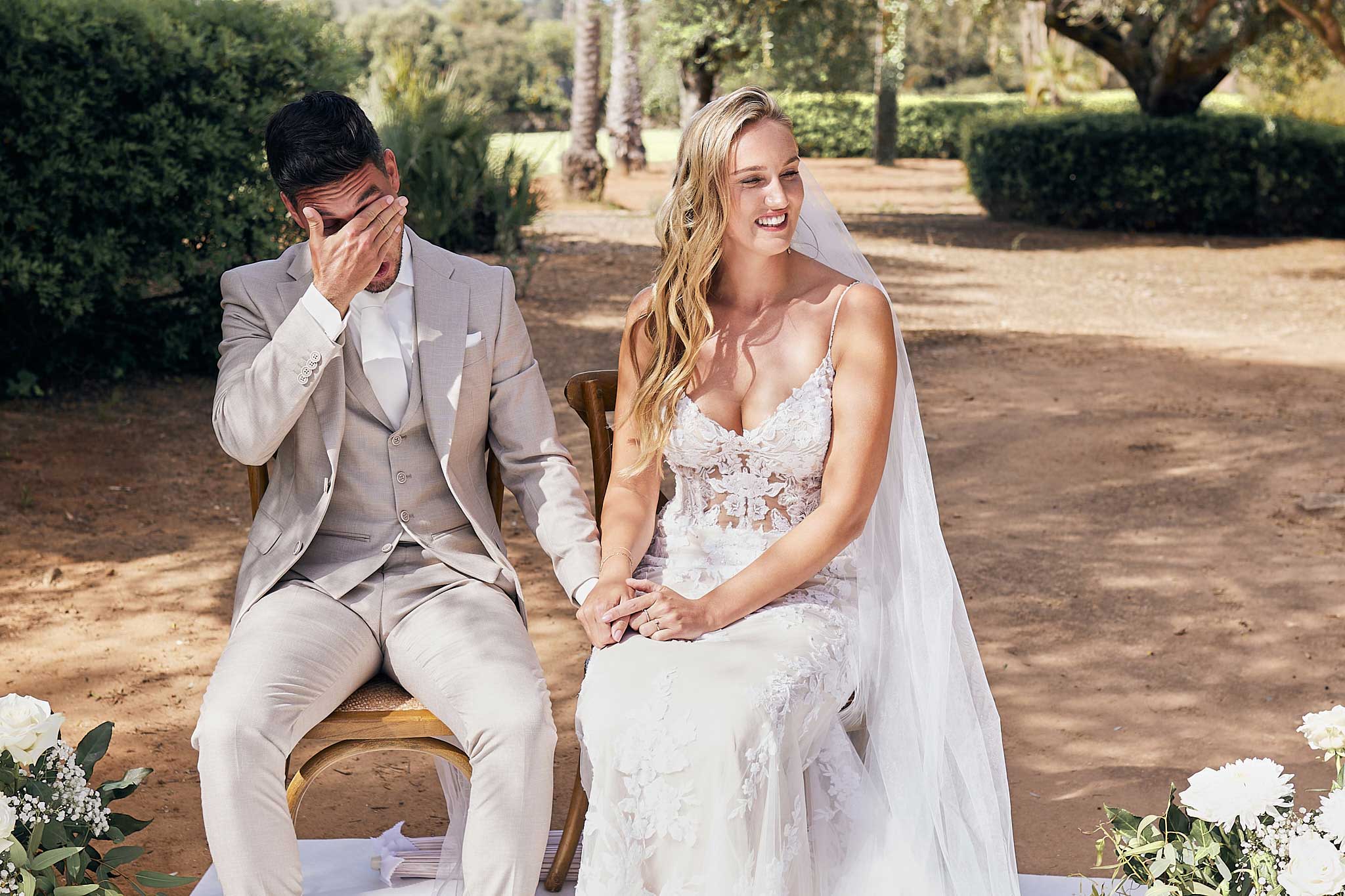 La hermosa boda de Sabrina y Rico en Casal Santa Eulalia, Mallorca, rodeada de campos dorados, antiguos muros de piedra y el cálido resplandor de un atardecer mediterráneo.