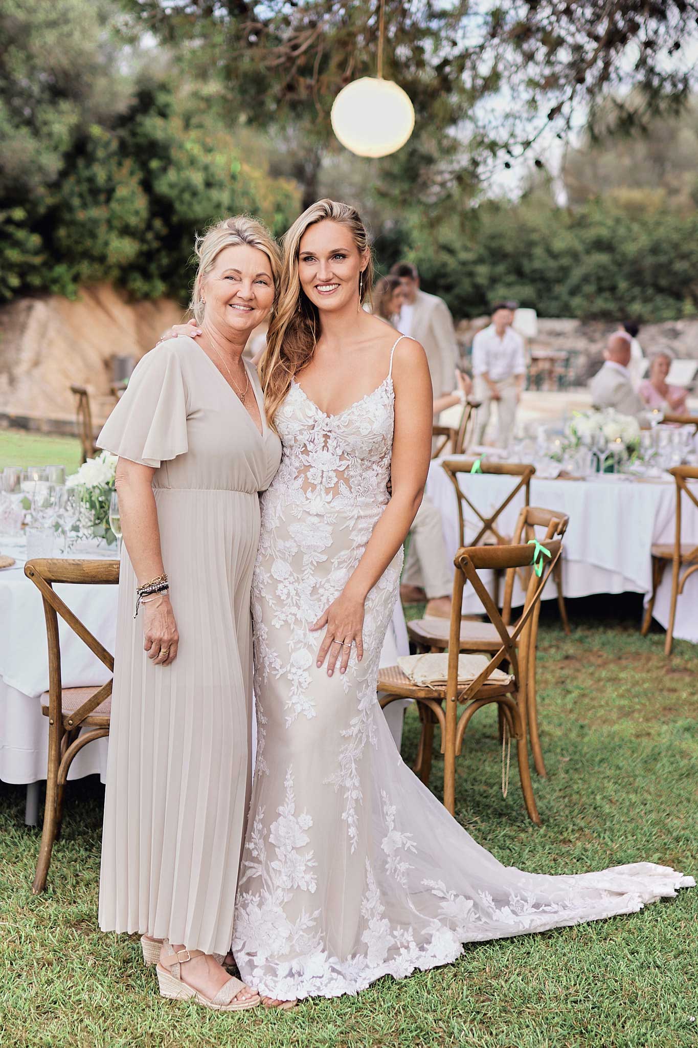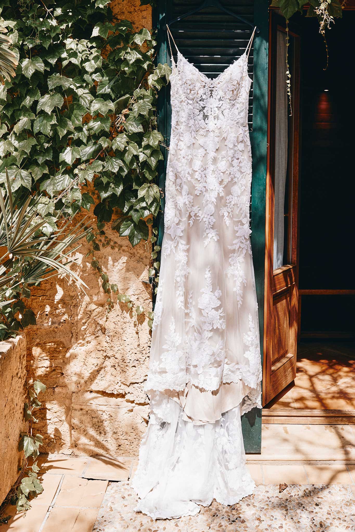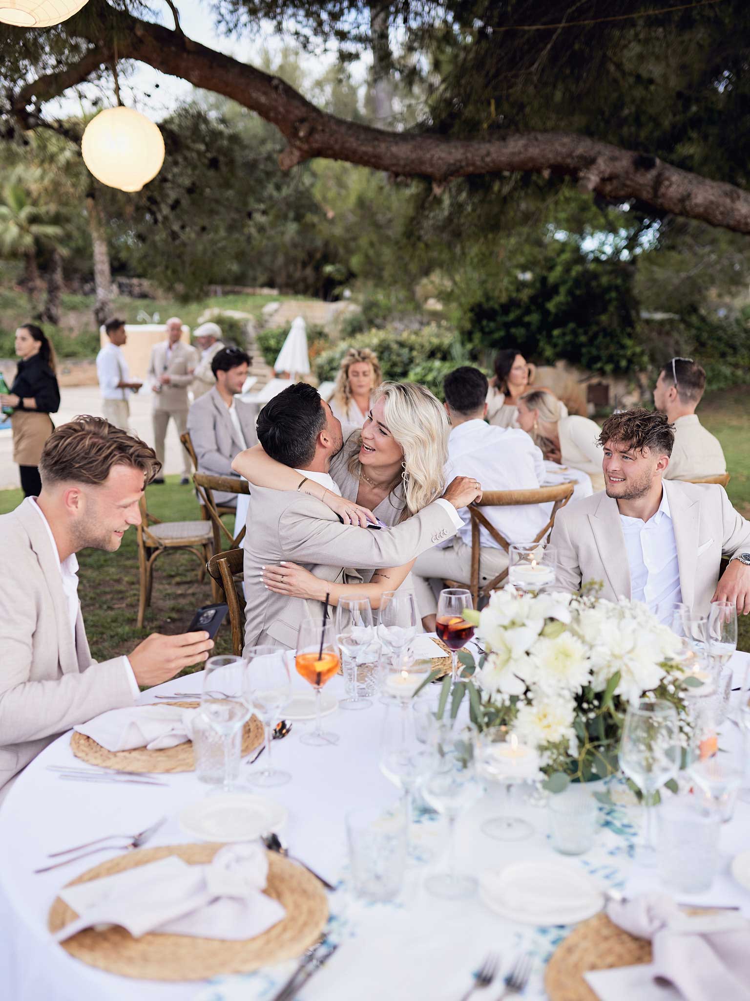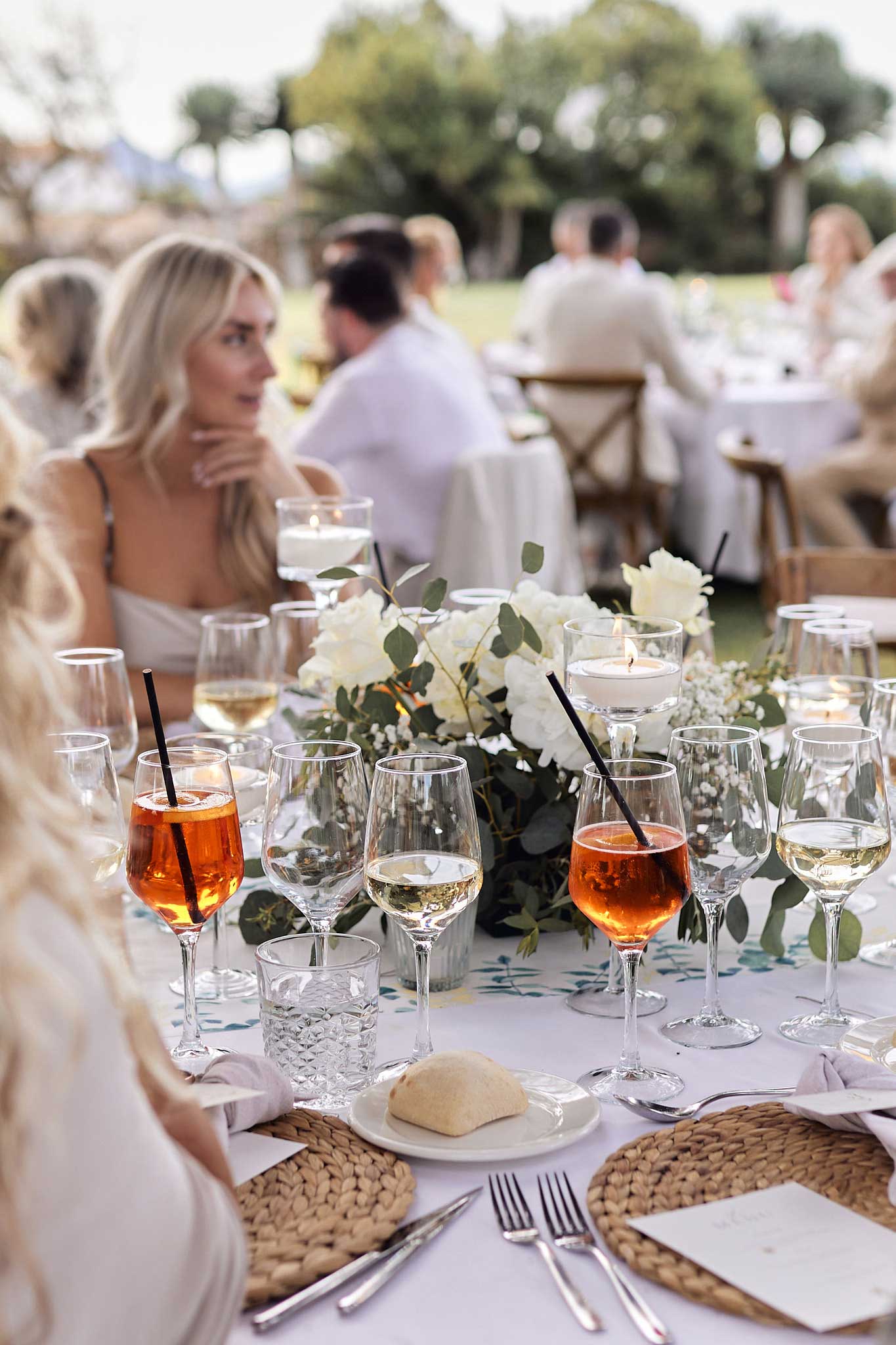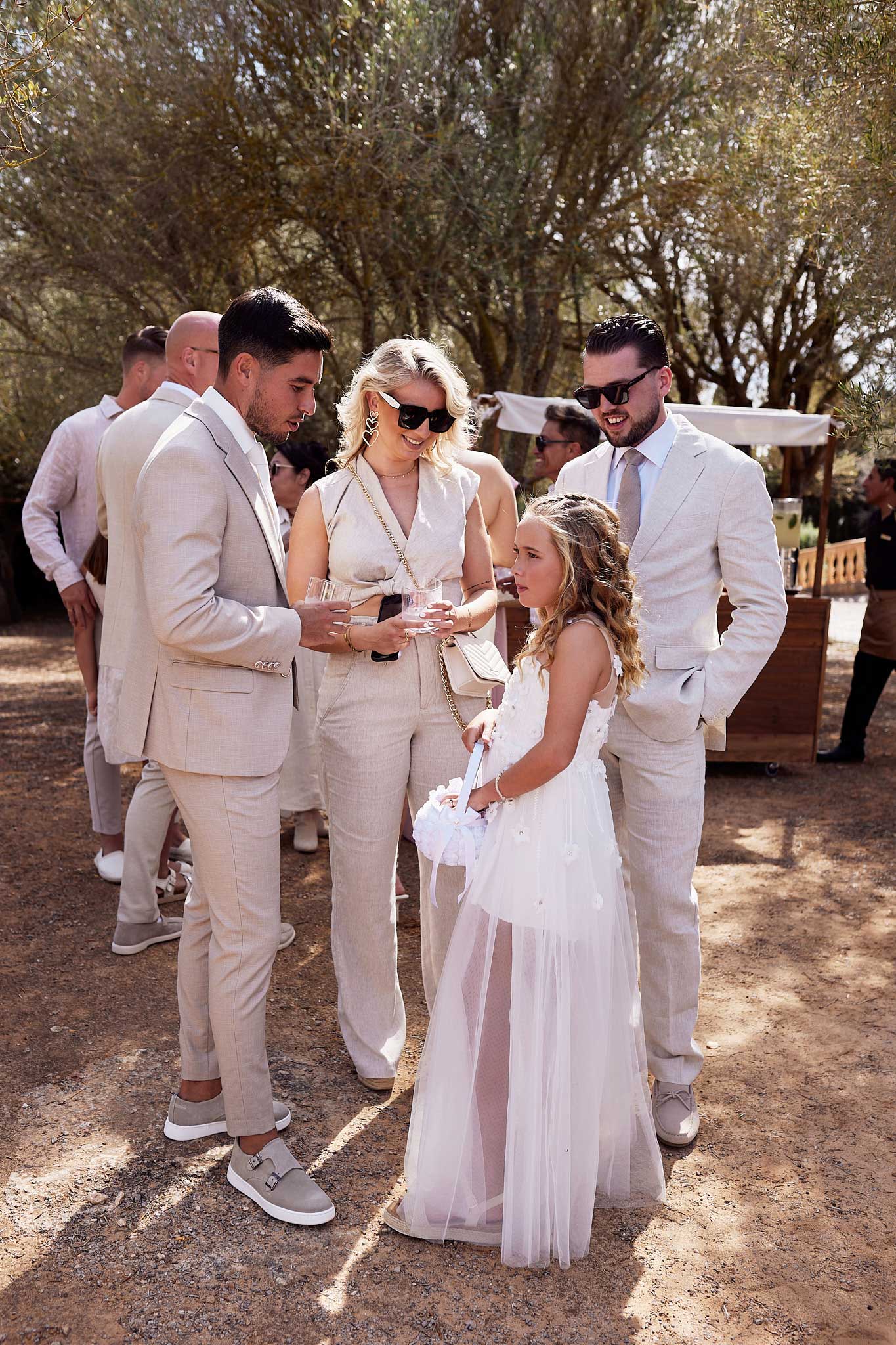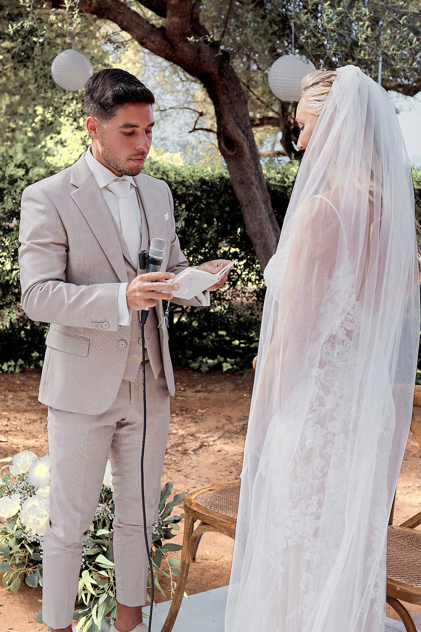 La hermosa boda de Sabrina y Rico en Casal Santa Eulalia, Mallorca, rodeada de campos dorados, antiguos muros de piedra y el cálido resplandor de un atardecer mediterráneo.
