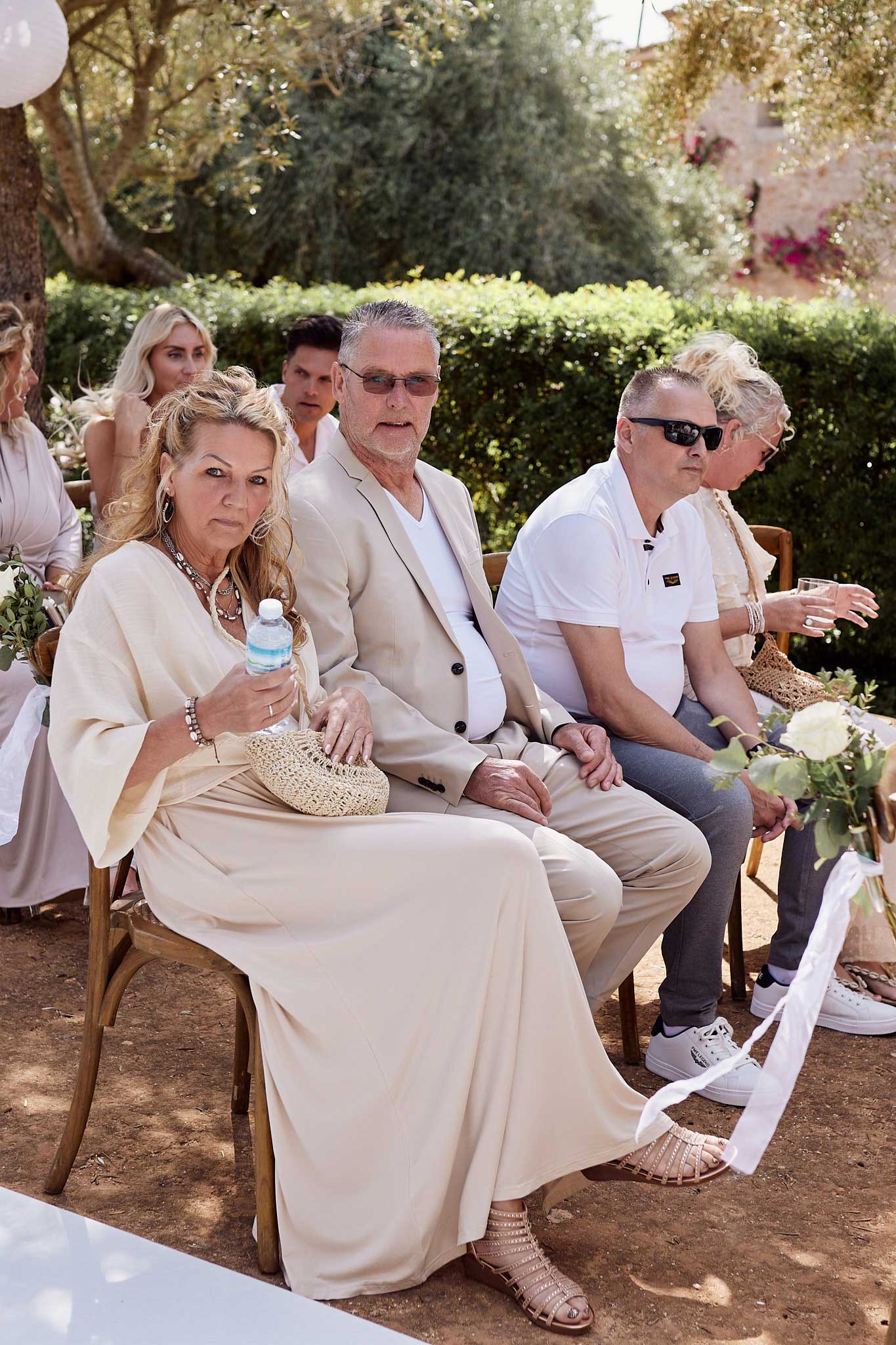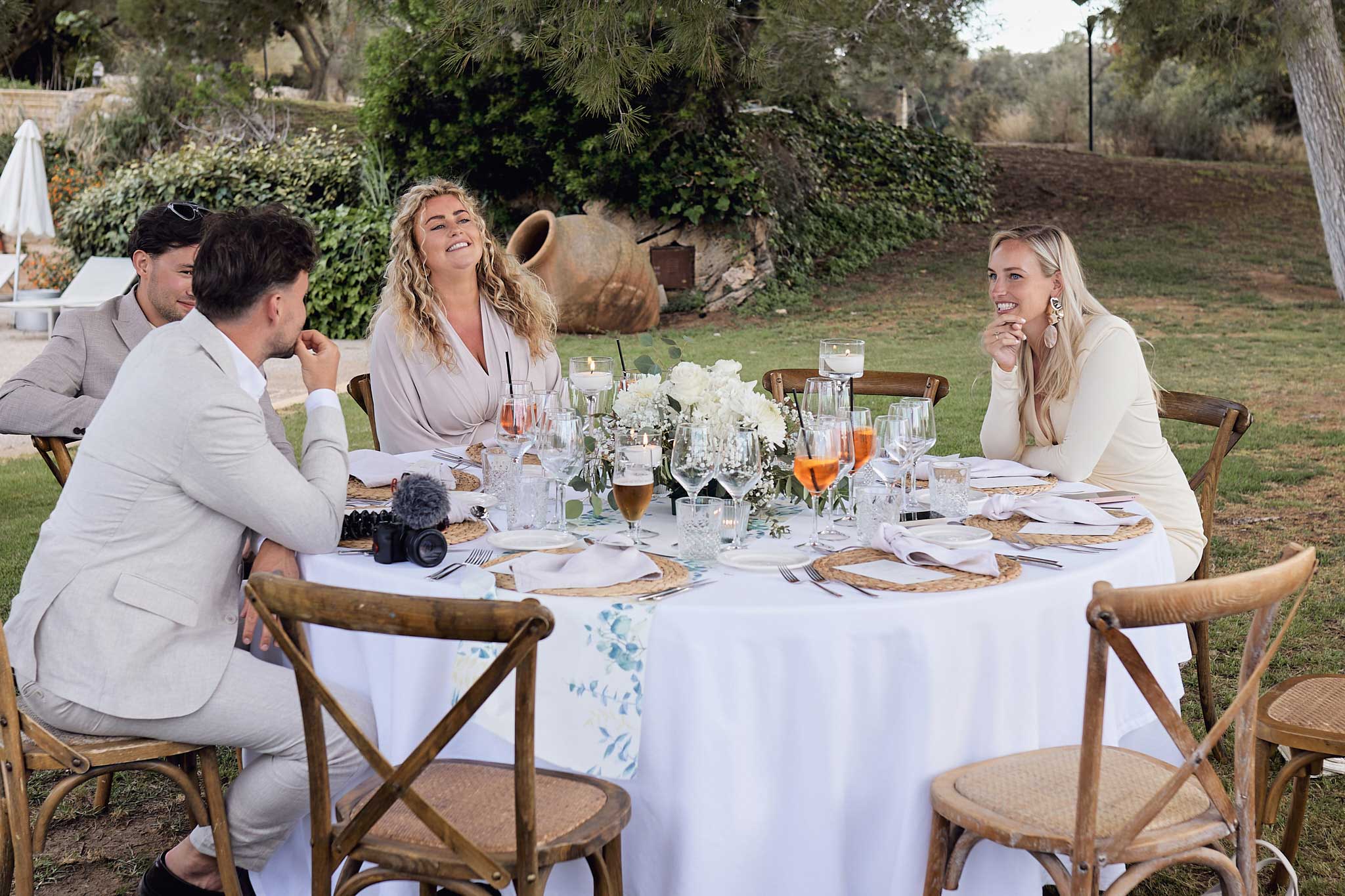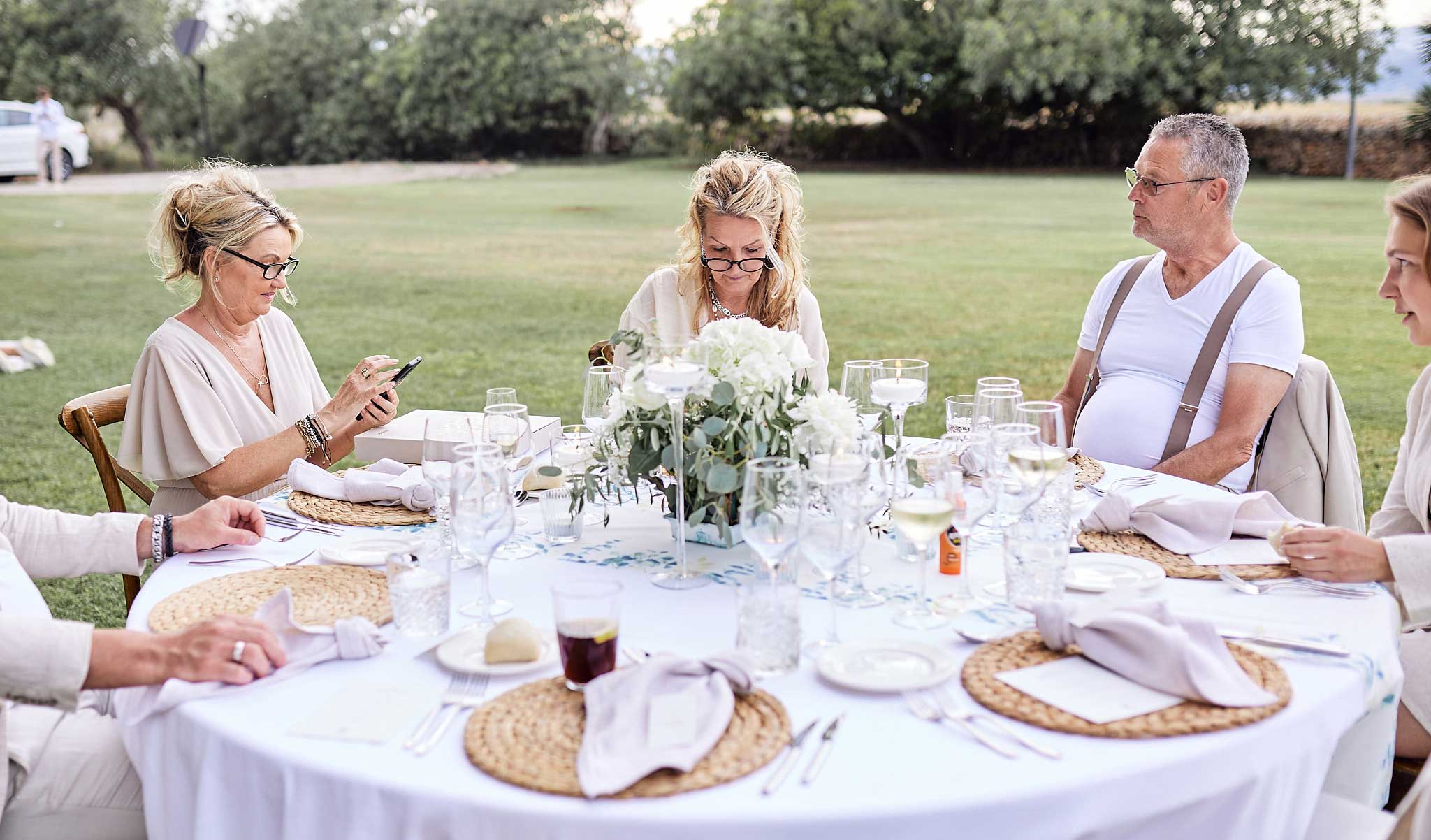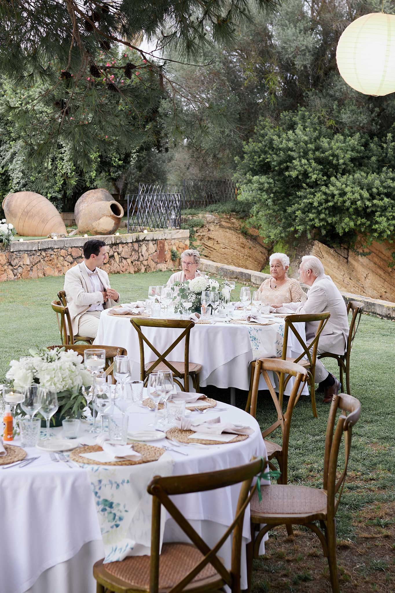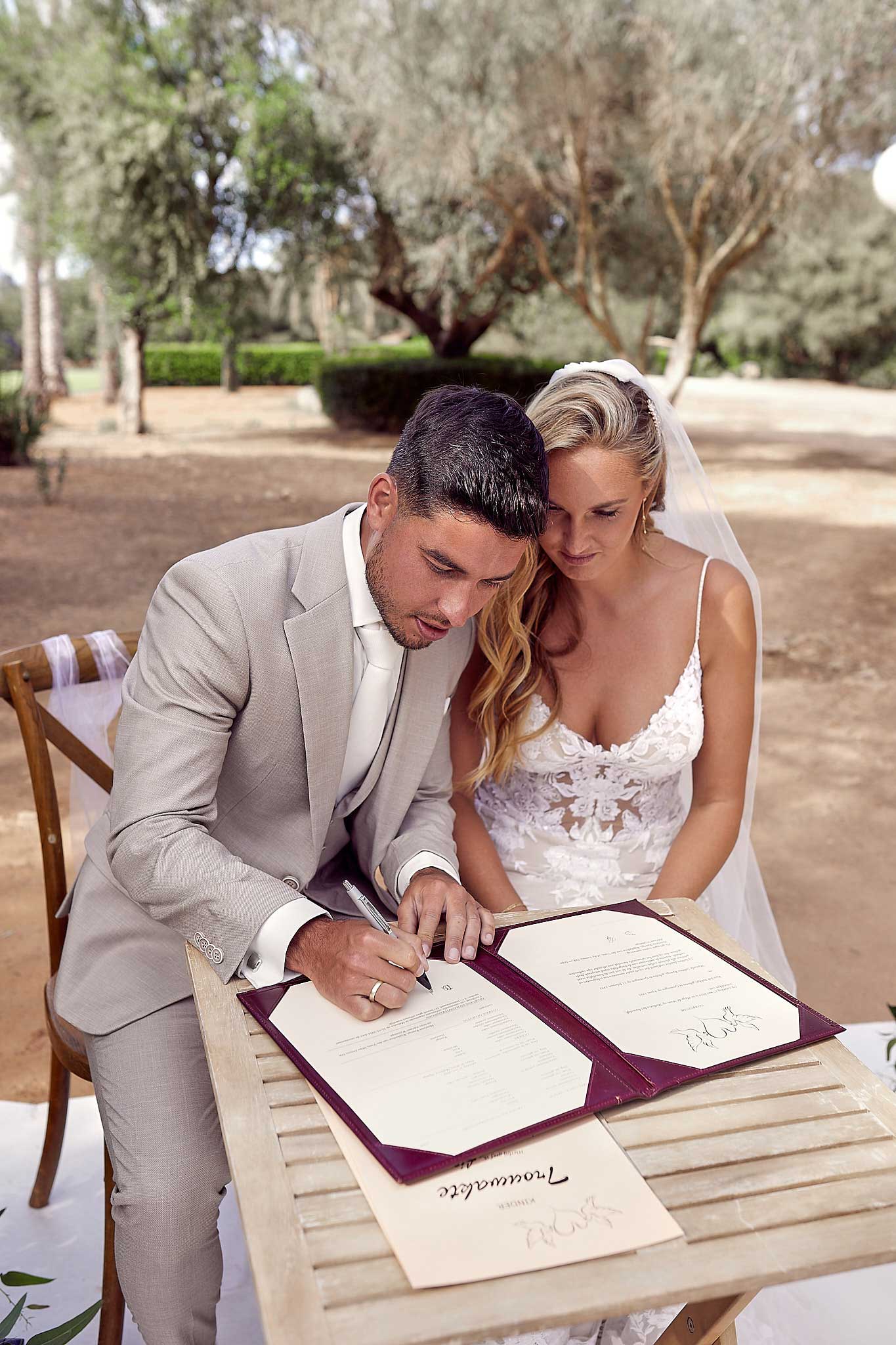 La hermosa boda de Sabrina y Rico en Casal Santa Eulalia, Mallorca, rodeada de campos dorados, antiguos muros de piedra y el cálido resplandor de un atardecer mediterráneo.