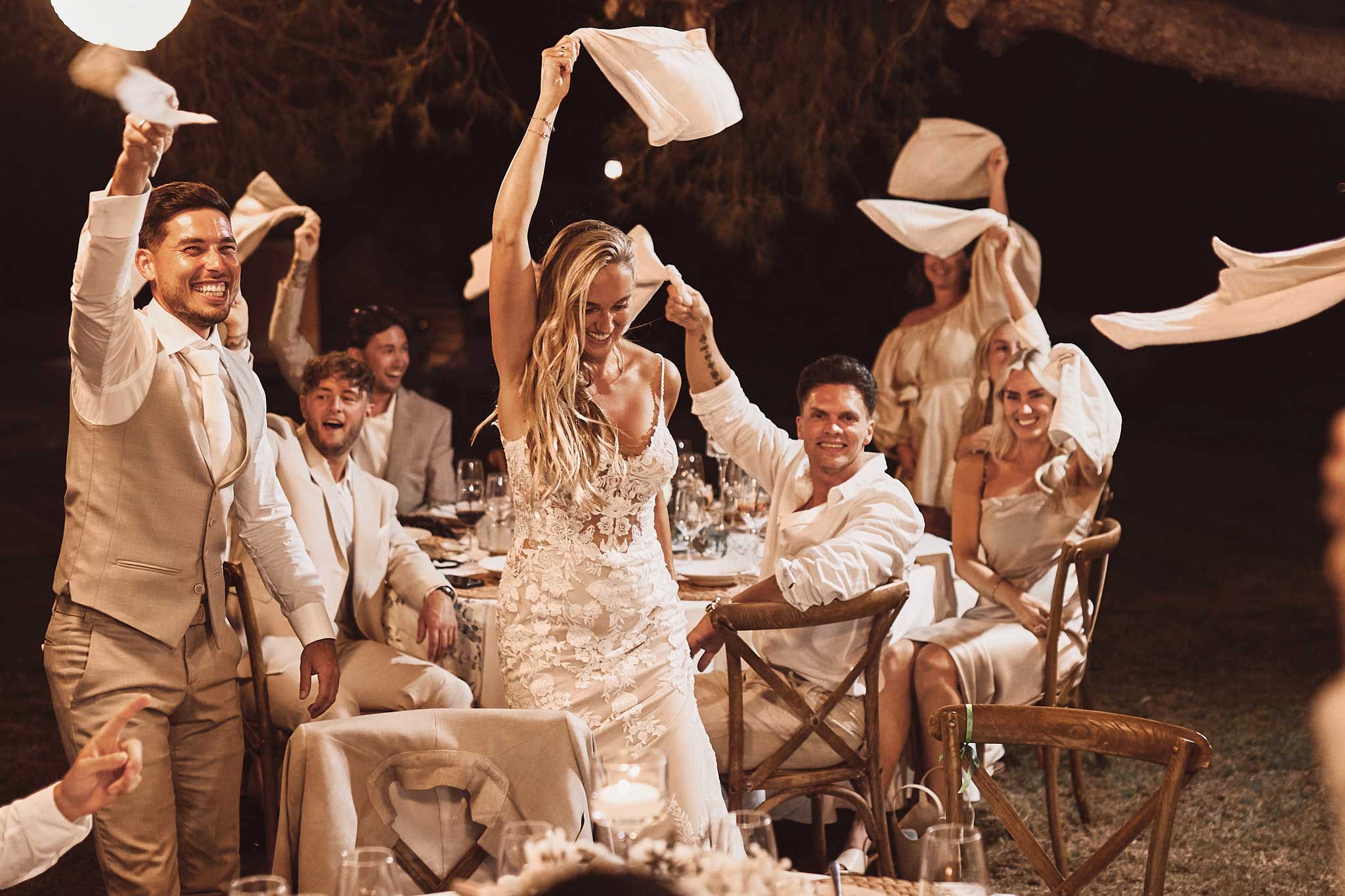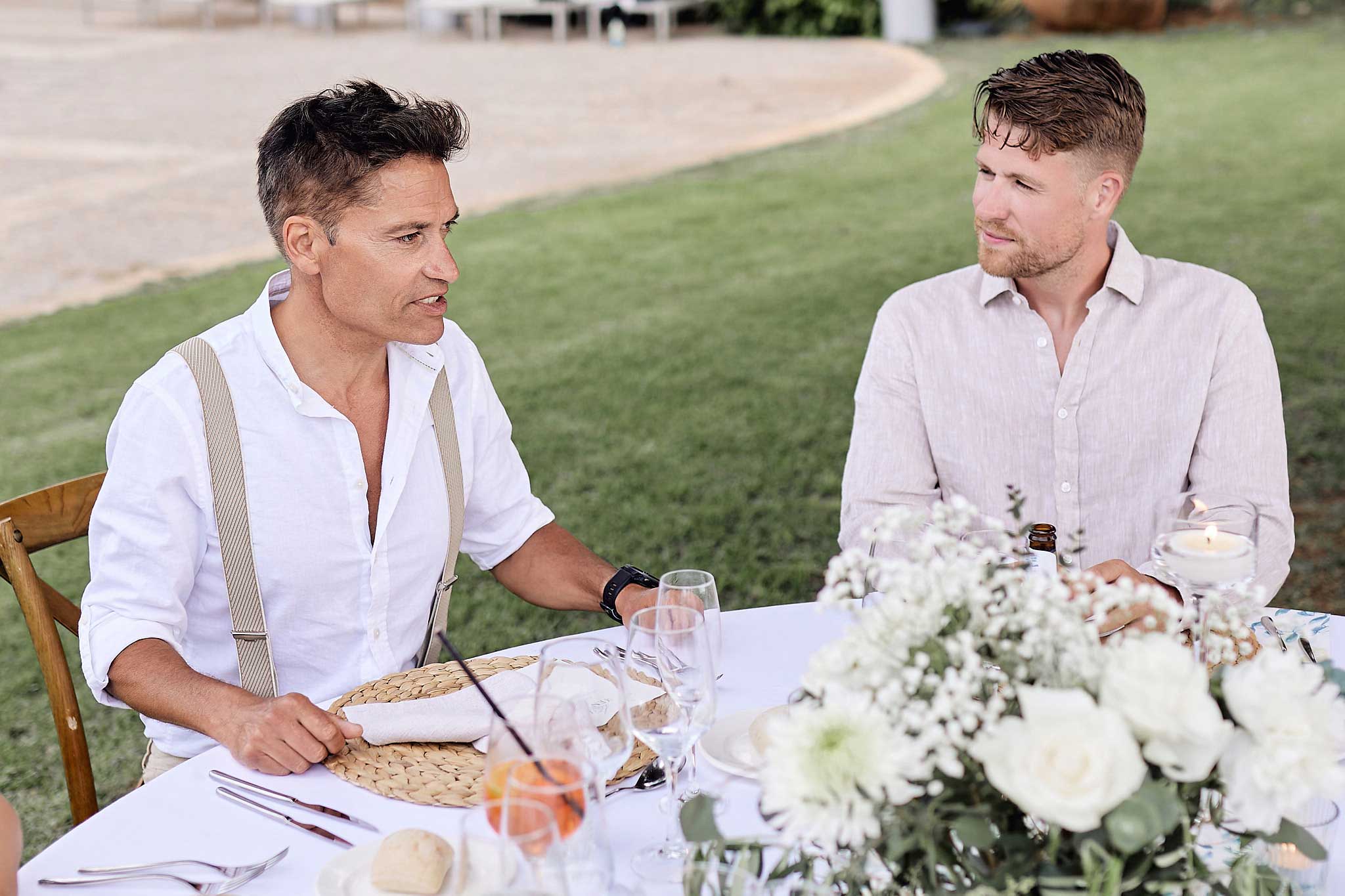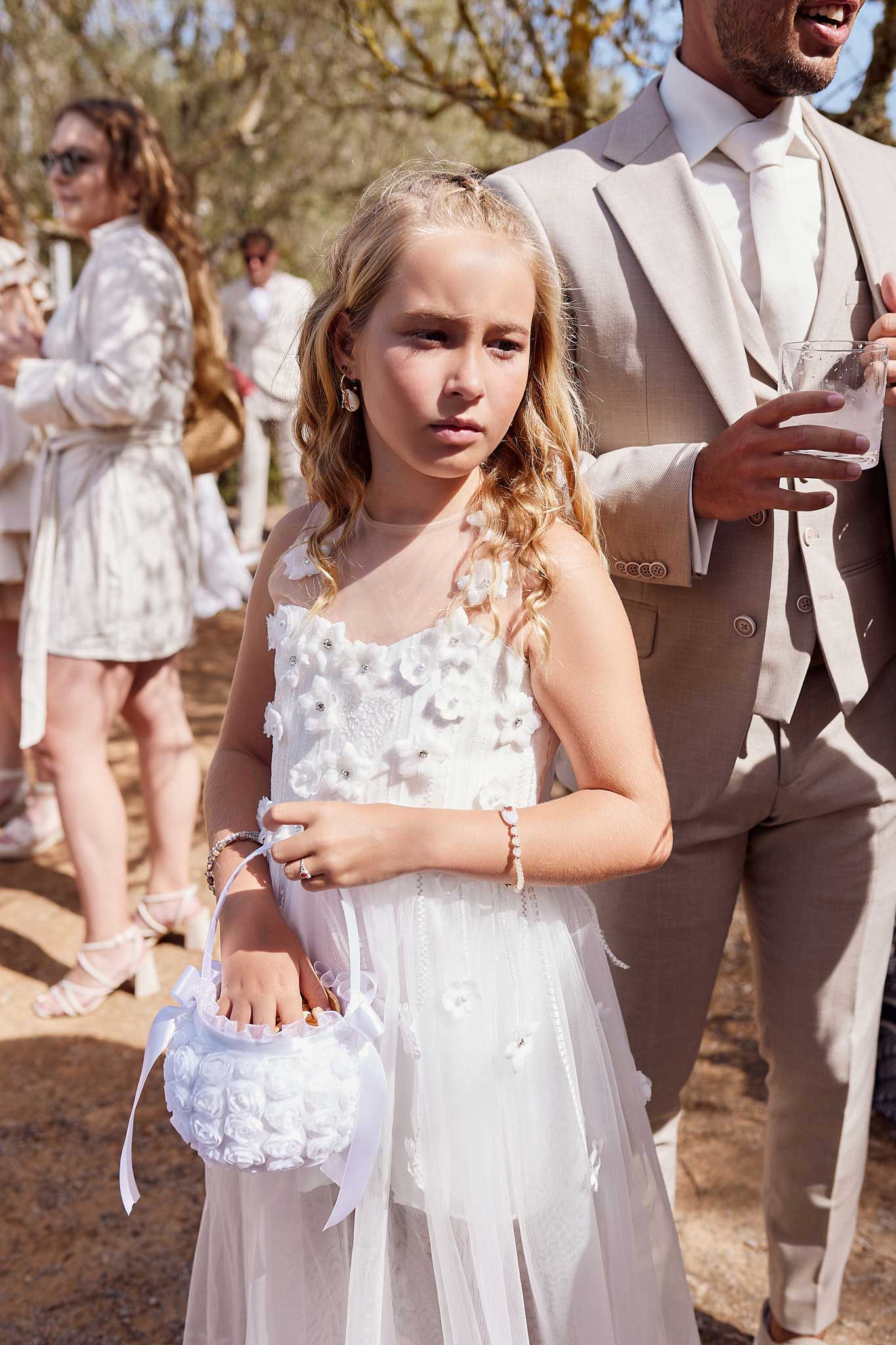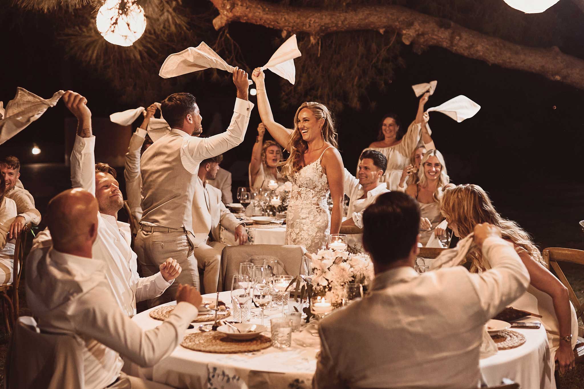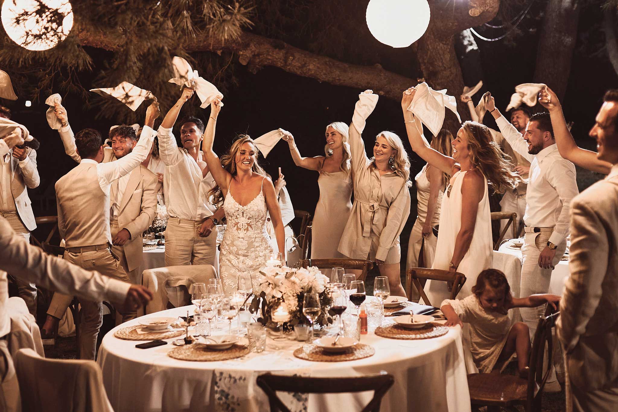 La hermosa boda de Sabrina y Rico en Casal Santa Eulalia, Mallorca, rodeada de campos dorados, antiguos muros de piedra y el cálido resplandor de un atardecer mediterráneo.