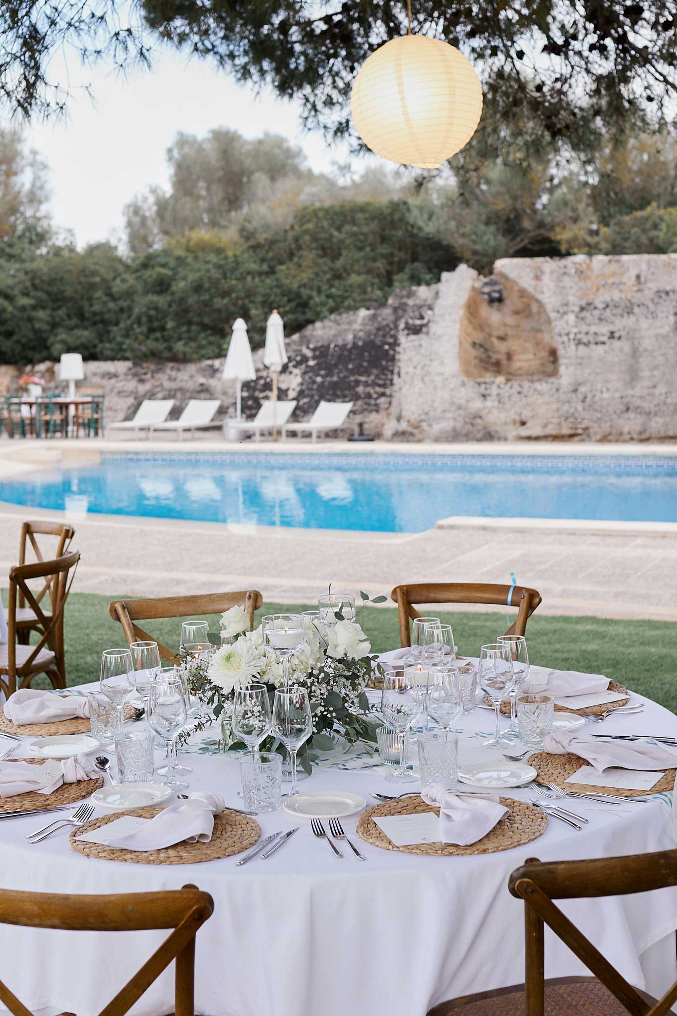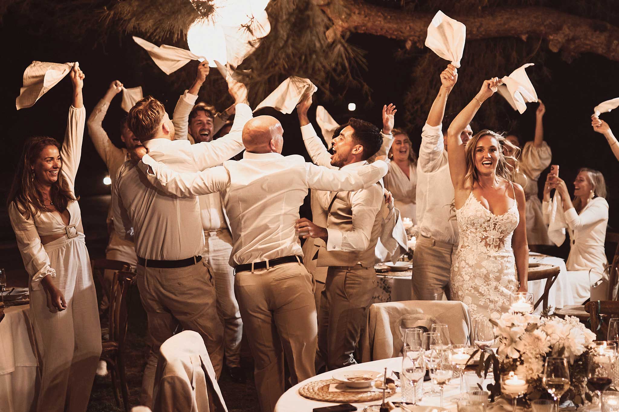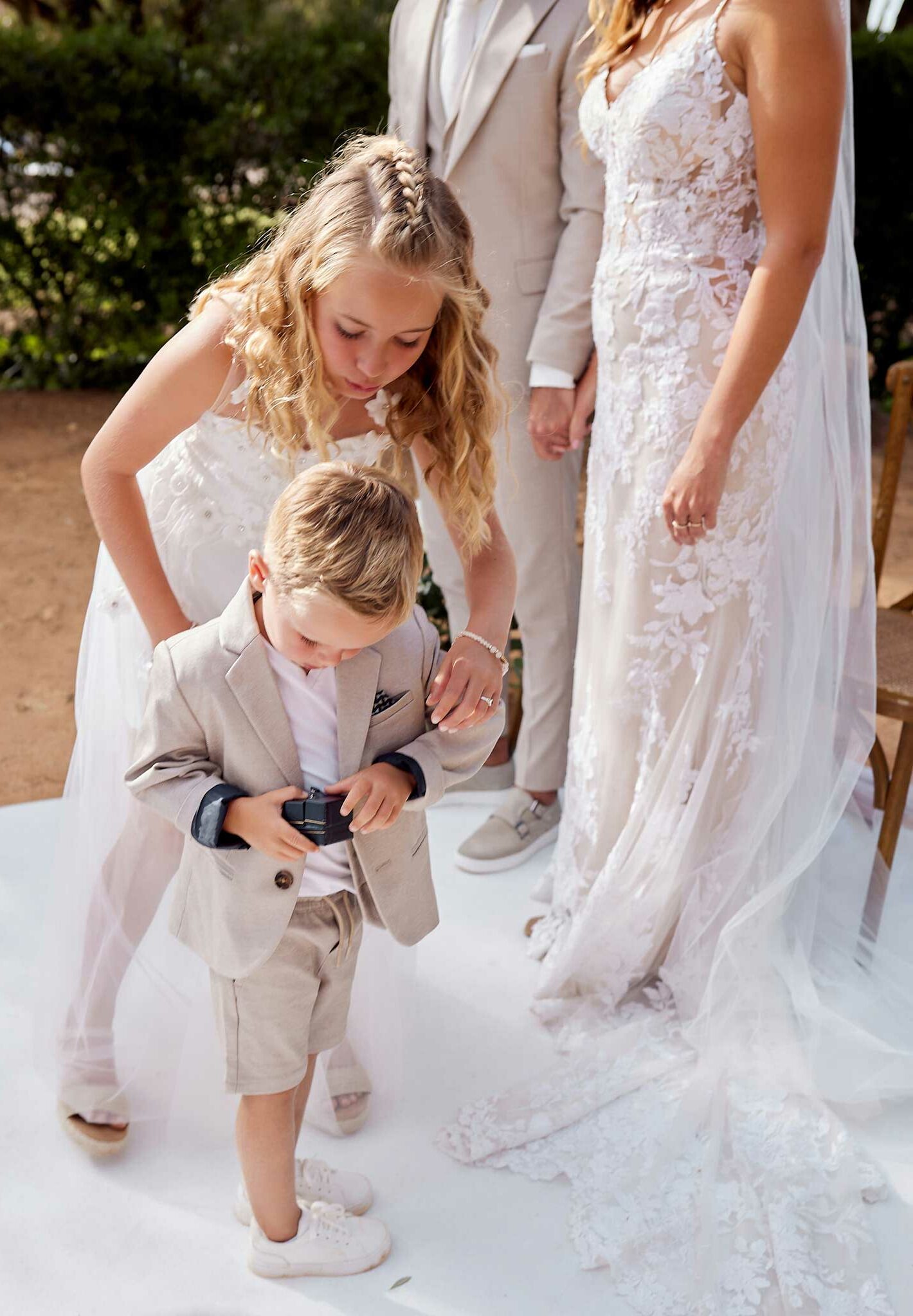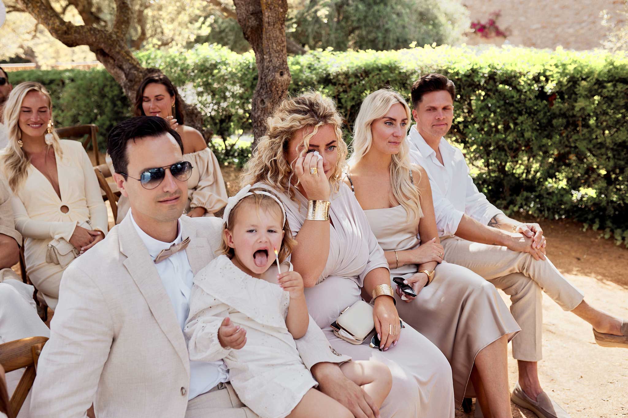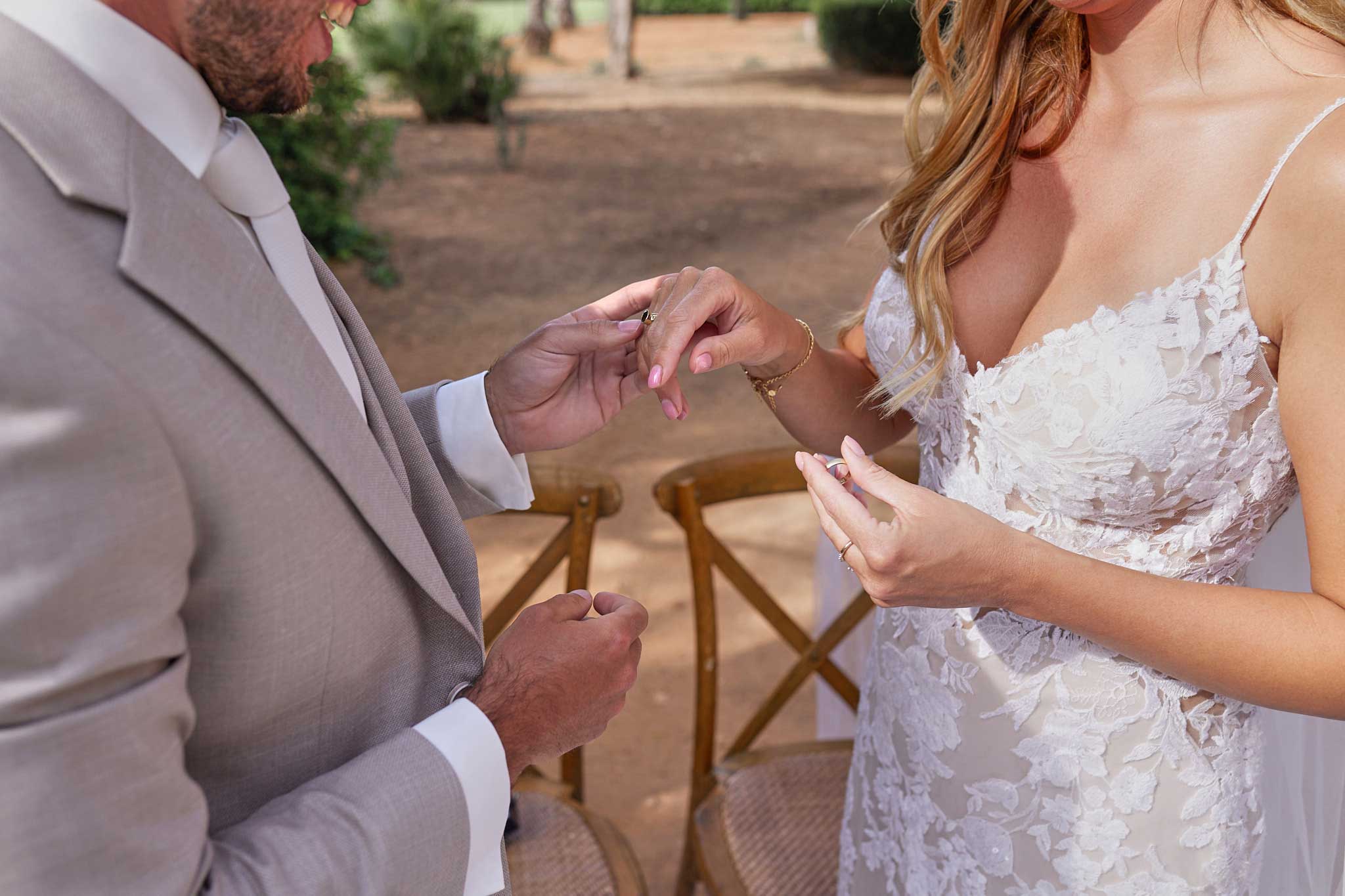 La hermosa boda de Sabrina y Rico en Casal Santa Eulalia, Mallorca, rodeada de campos dorados, antiguos muros de piedra y el cálido resplandor de un atardecer mediterráneo.
