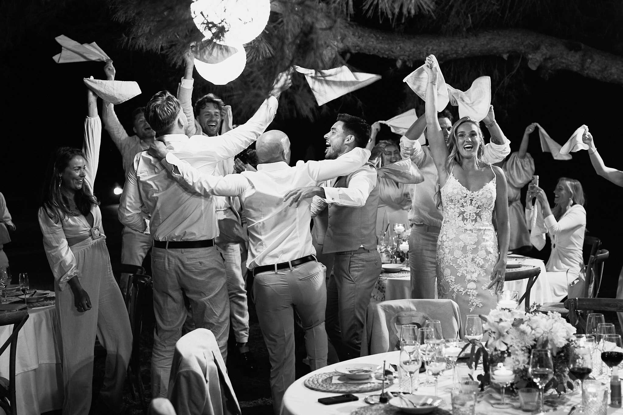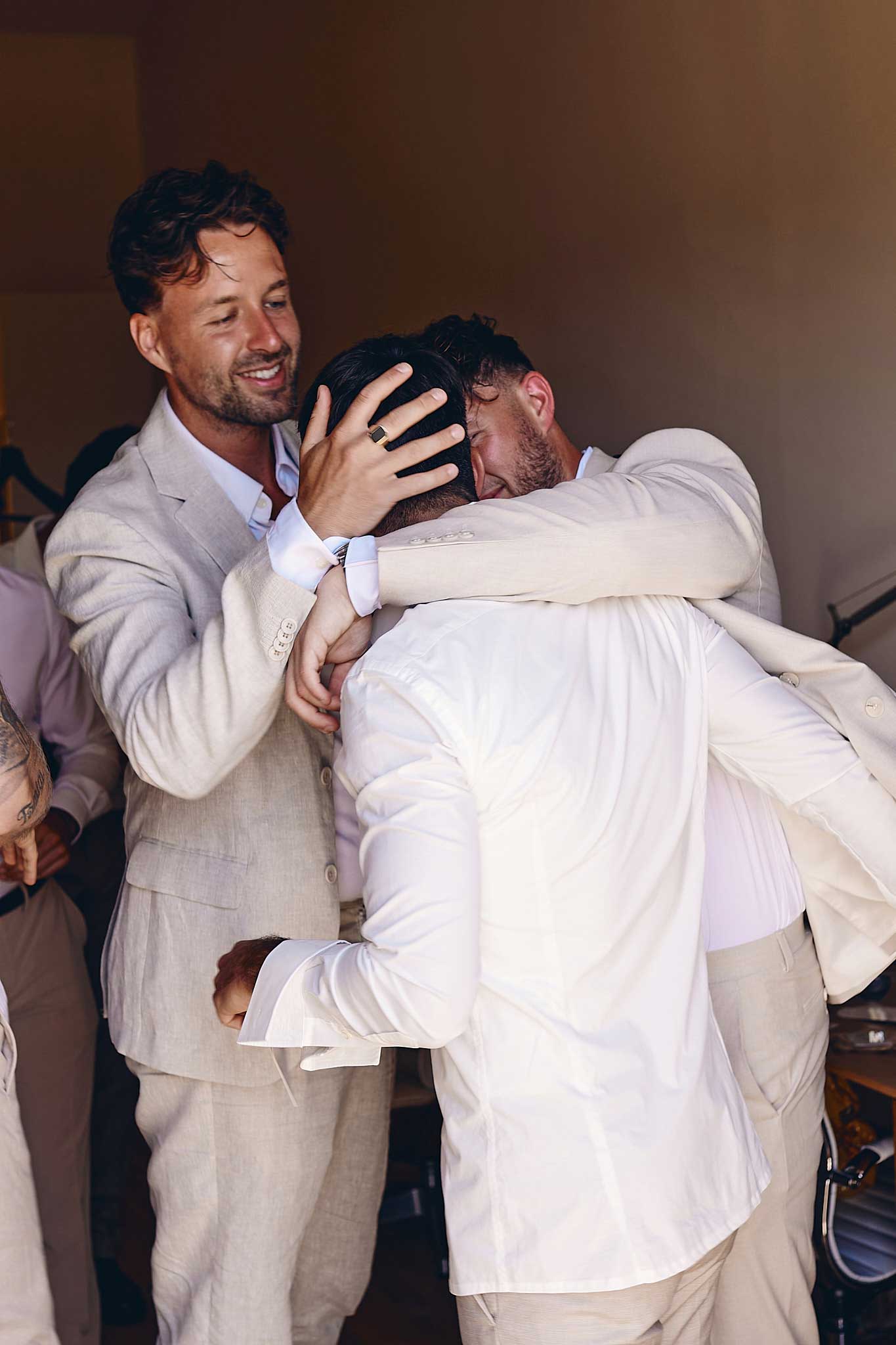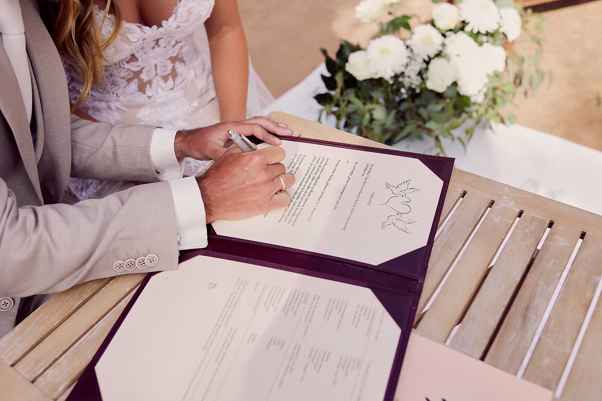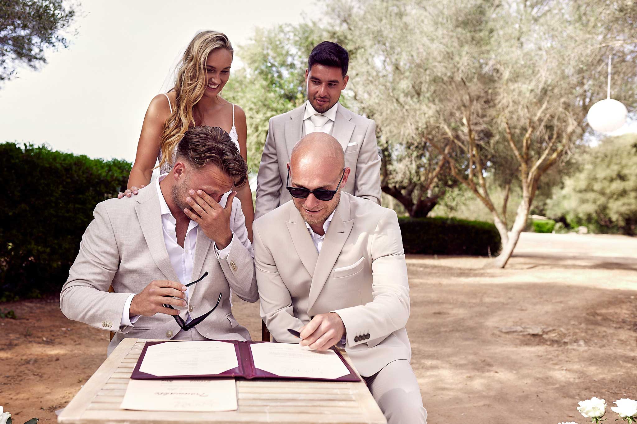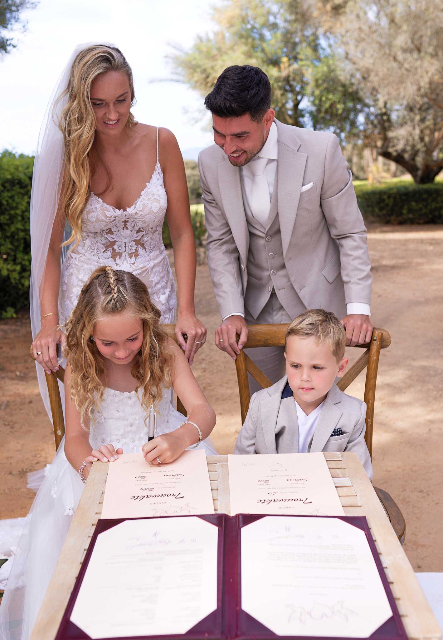 La hermosa boda de Sabrina y Rico en Casal Santa Eulalia, Mallorca, rodeada de campos dorados, antiguos muros de piedra y el cálido resplandor de un atardecer mediterráneo.